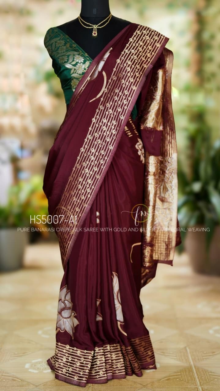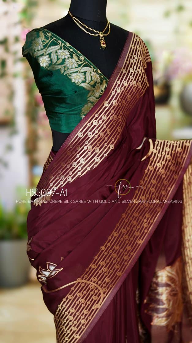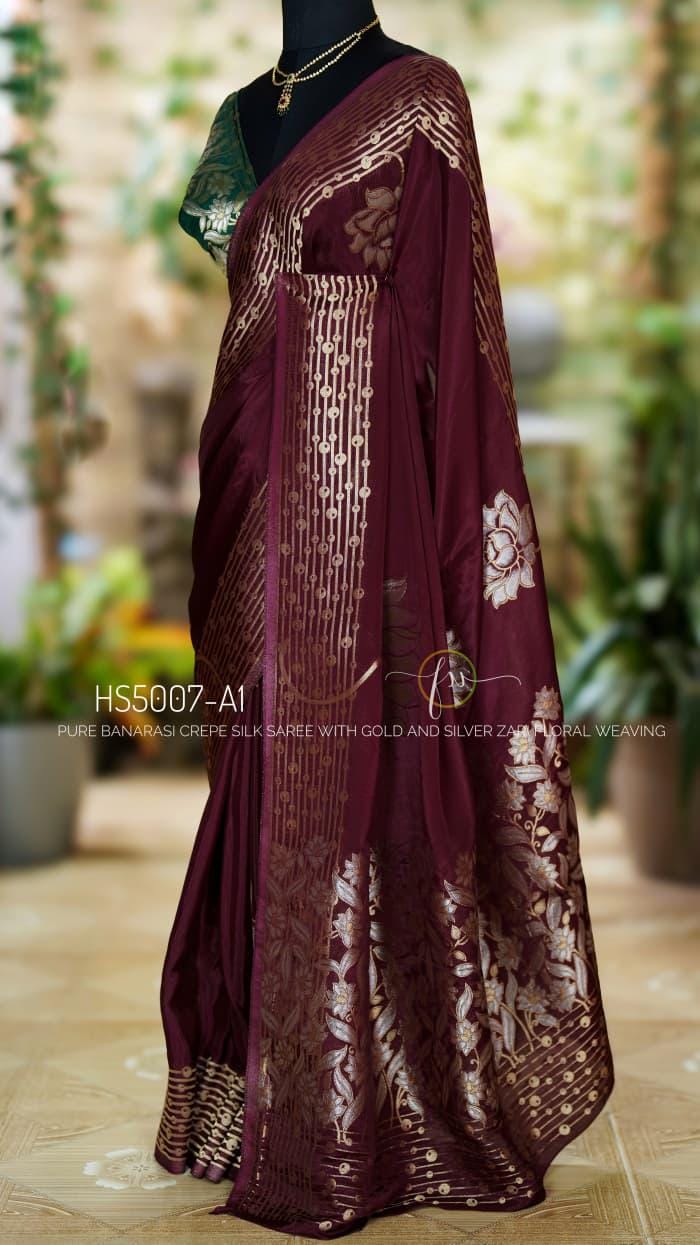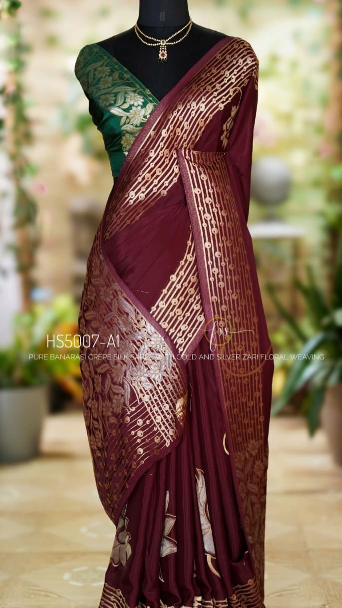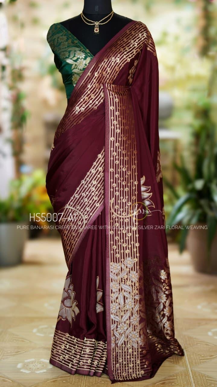 Add this wine Banarasi crepe silk saree to your ethnic collection for a timeless combination of luxury, tradition, and style that will make you stand out at any occasion.