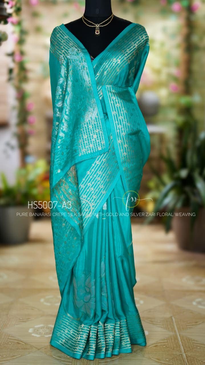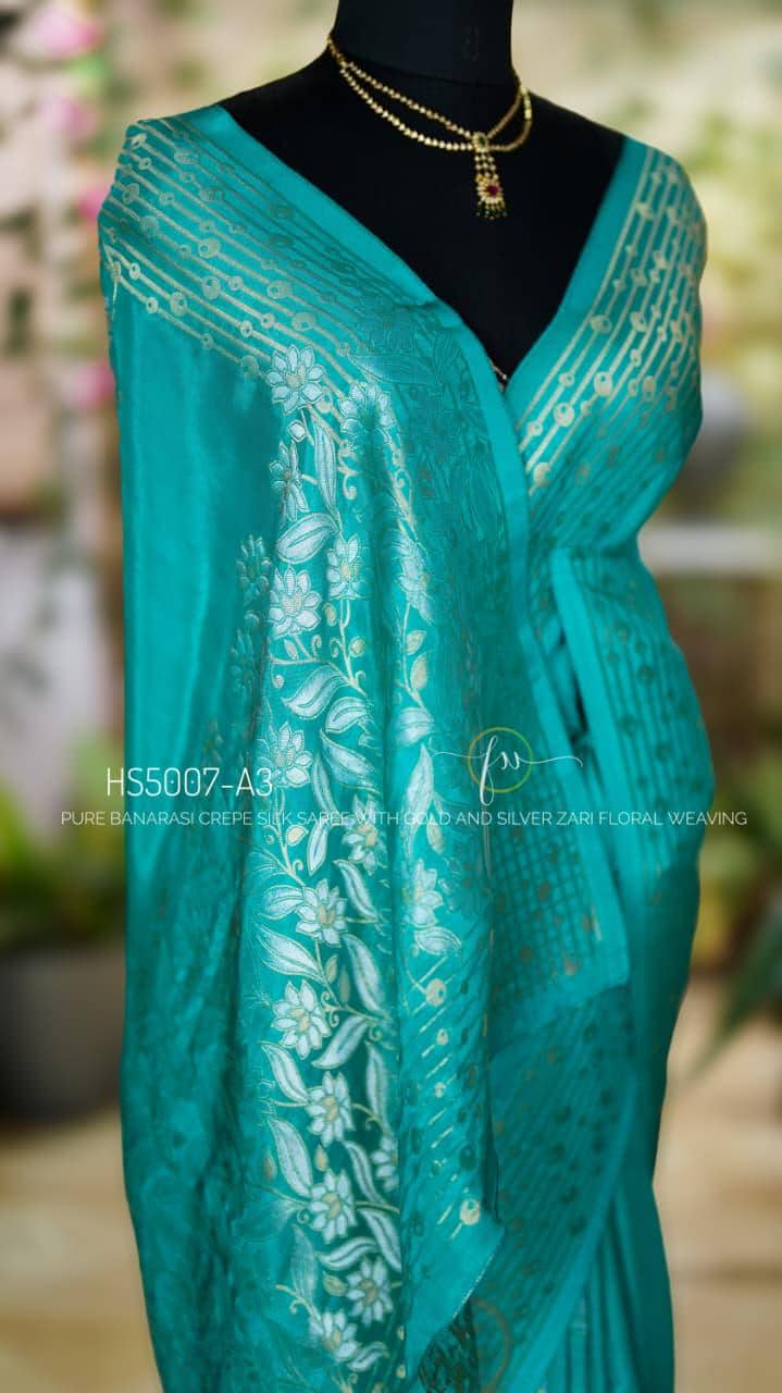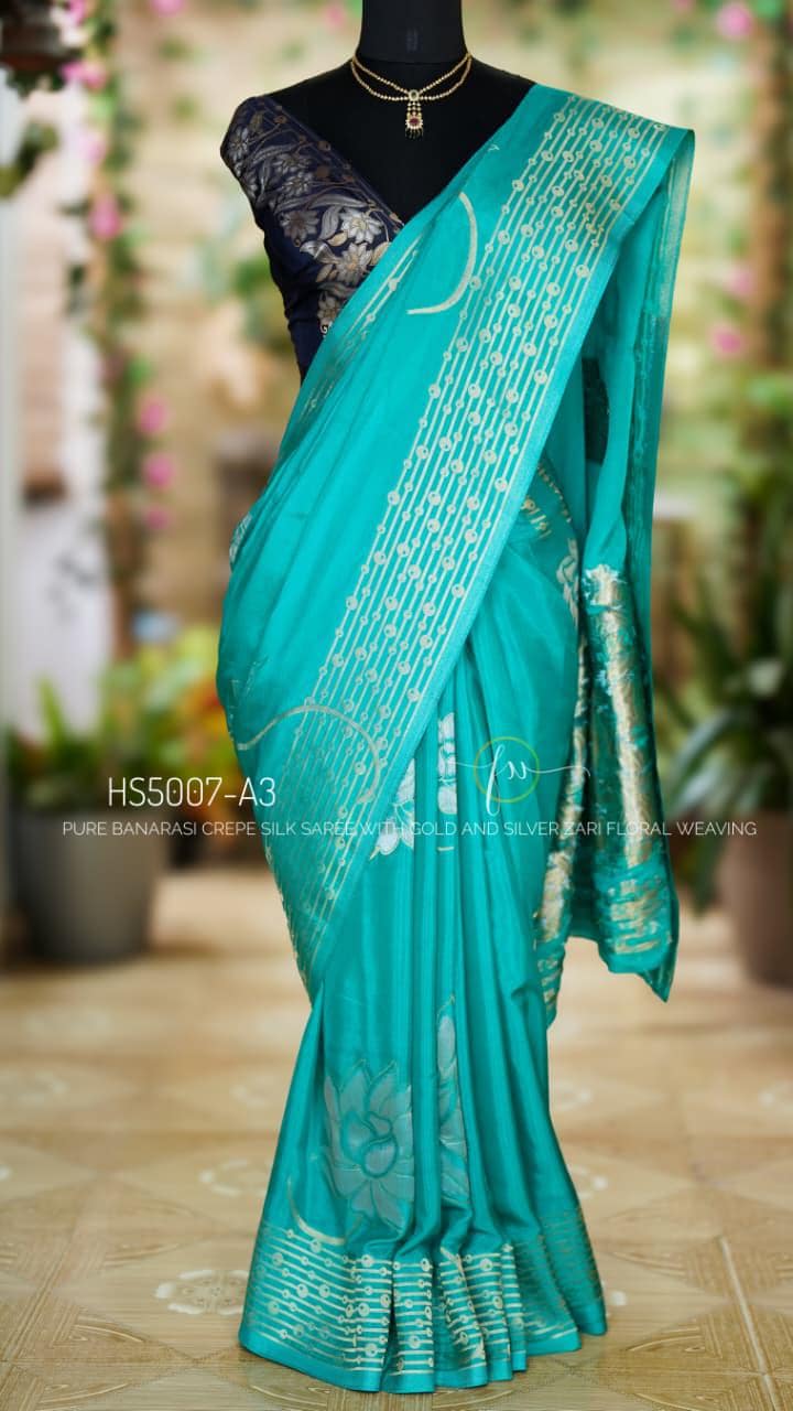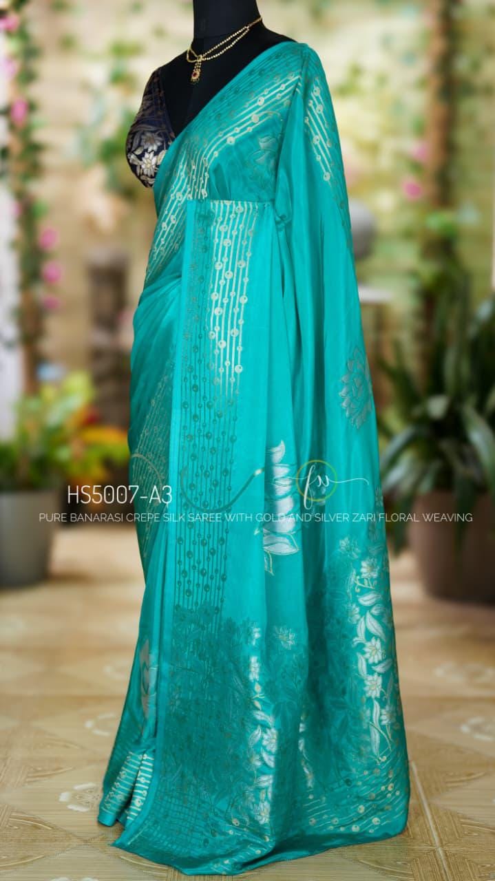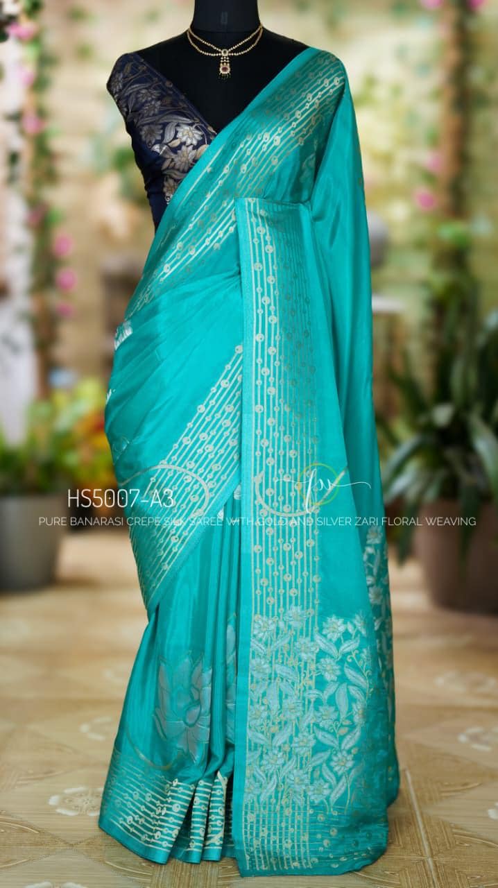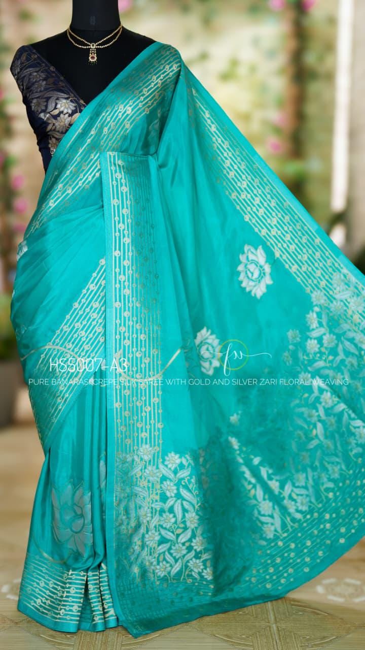 Make a striking statement at weddings and festive occasions with this Turquoise Banarasi Crepe Silk Saree, a perfect blend of traditional Indian craftsmanship and luxurious elegance. Featuring intricate gold and silver zari floral weaving, this saree showcases the timeless beauty of Banarasi artistry, making it an exquisite choice for brides, wedding guests, or anyone celebrating special occasions in style.