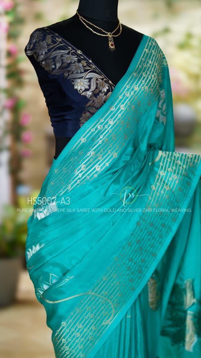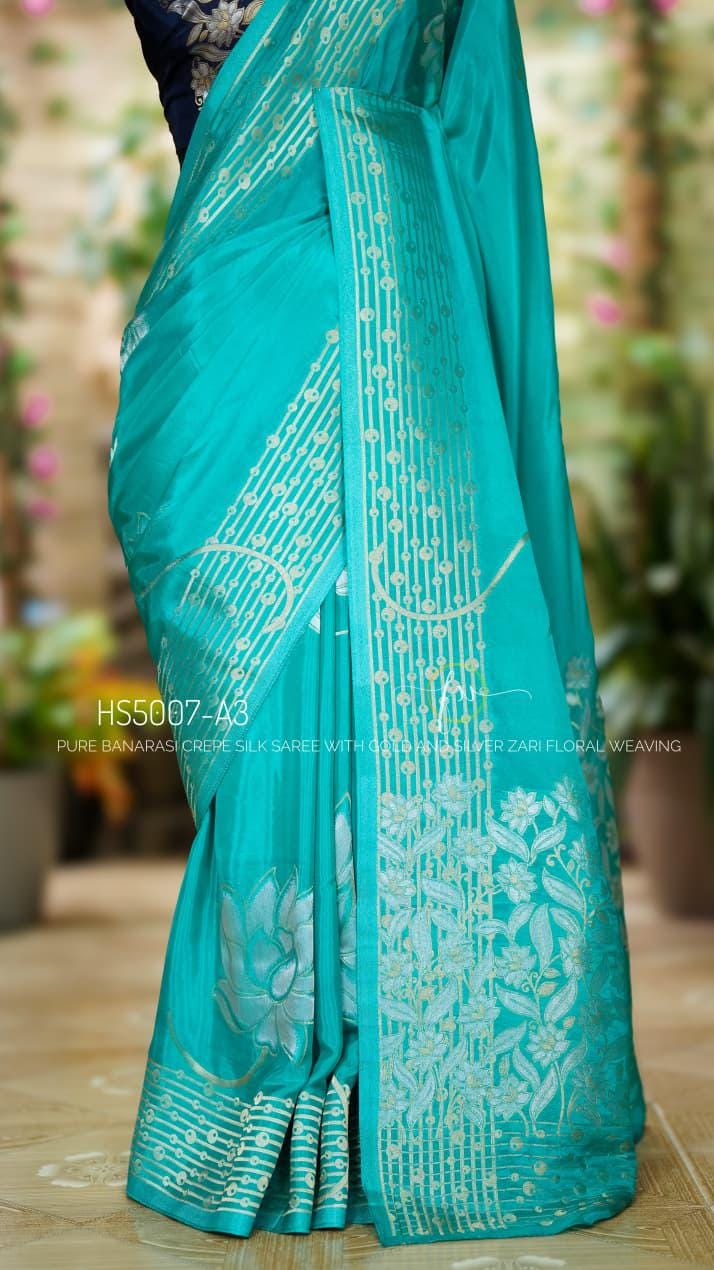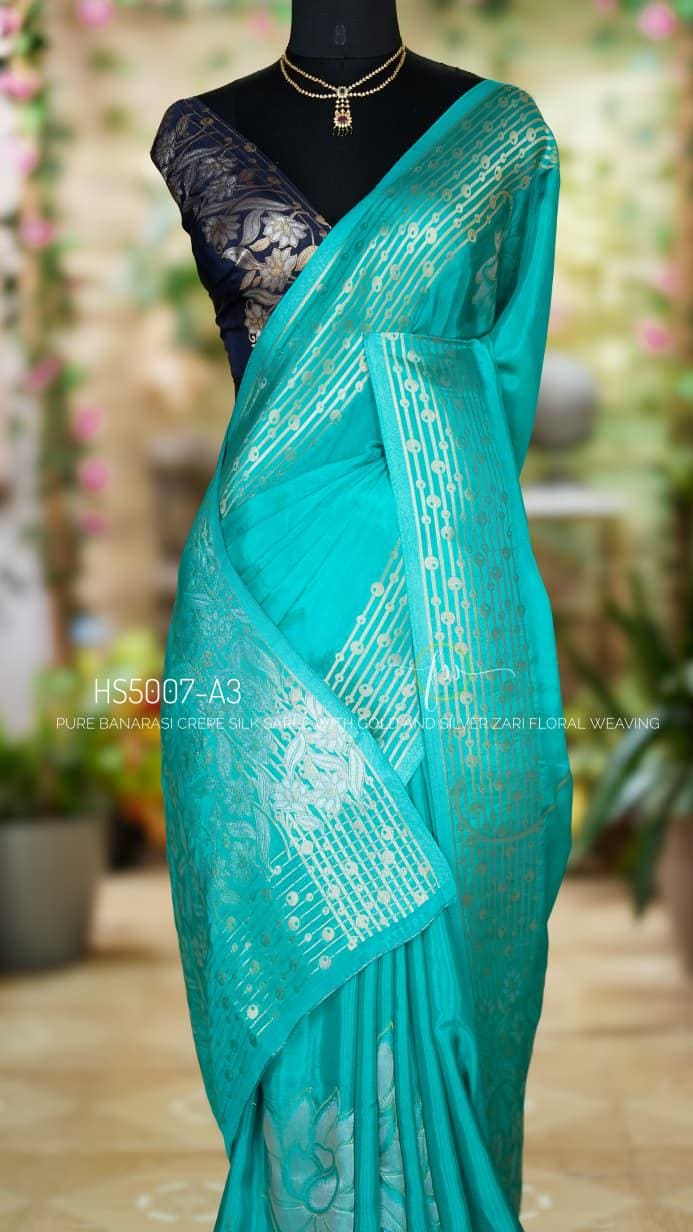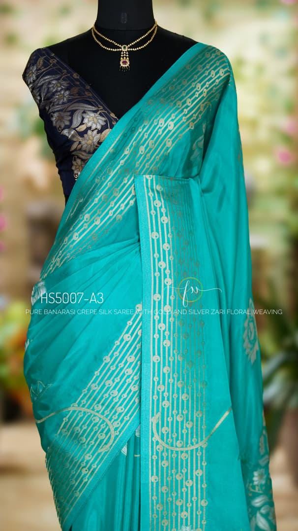 Elevate your ethnic wardrobe with this turquoise Banarasi crepe silk saree, combining elegance, tradition, and luxury in one stunning ensemble.