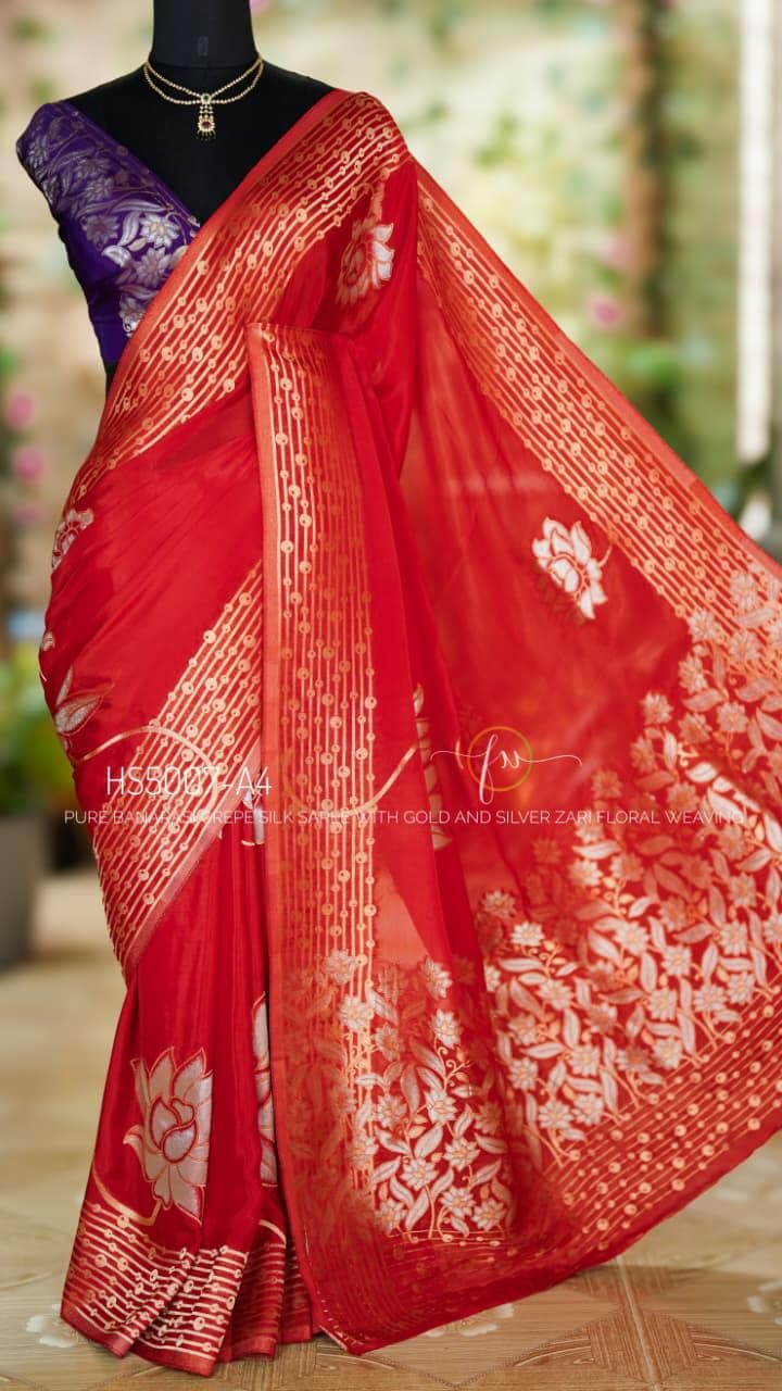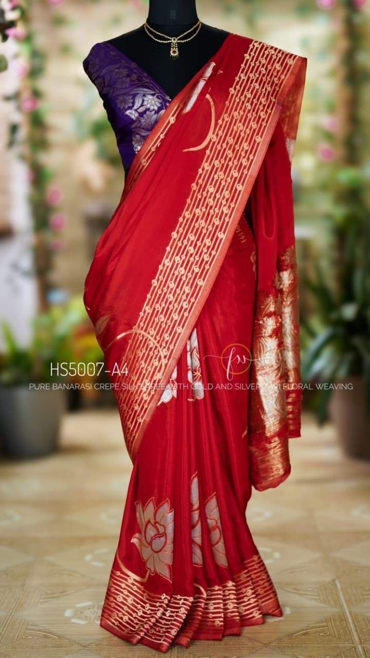 Make a grand statement on your special day with this stunning Red Banarasi Crepe Silk Saree, featuring exquisite gold and silver zari floral weaving. A perfect choice for brides, wedding guests, and festive occasions, this saree showcases the timeless elegance of traditional Banarasi craftsmanship combined with luxurious crepe silk for a regal look.
