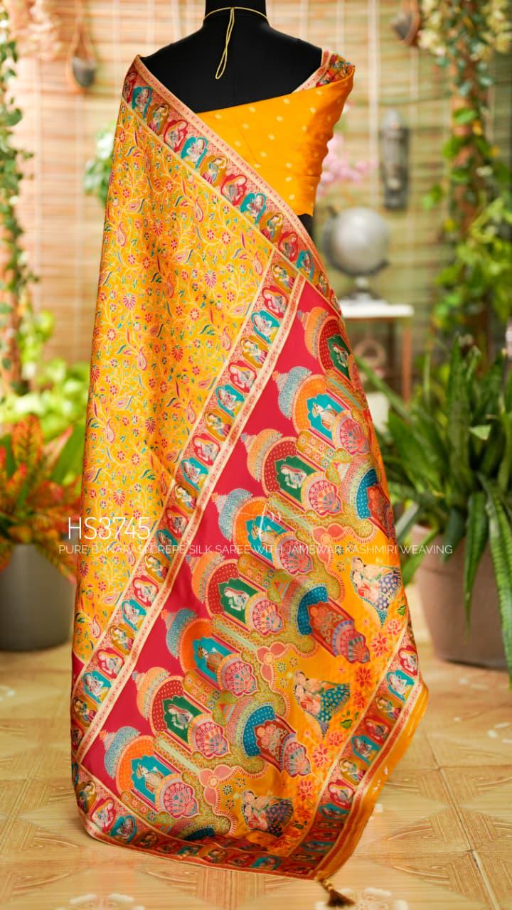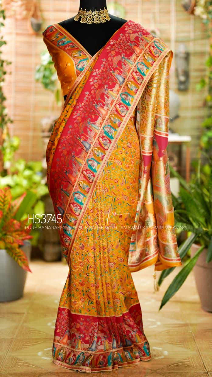 Crafted from premium crepe silk, this saree offers a soft, smooth, and lightweight drape that enhances your silhouette while ensuring comfort throughout long ceremonies. The rich yellow color radiates joy and celebration, while the detailed Jamawar Kashmiri weaving adds texture, depth, and a regal touch. Its intricate patterns and luxurious finish make it perfect for weddings, receptions, festive gatherings, and cultural celebrations where you want to shine with sophistication.