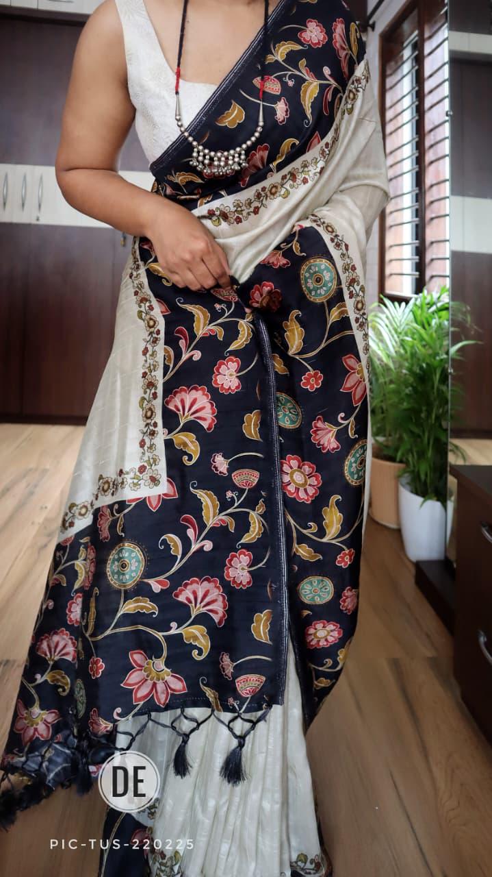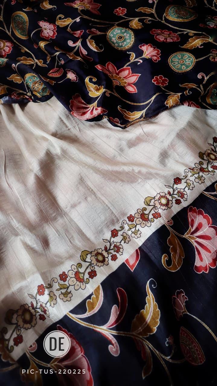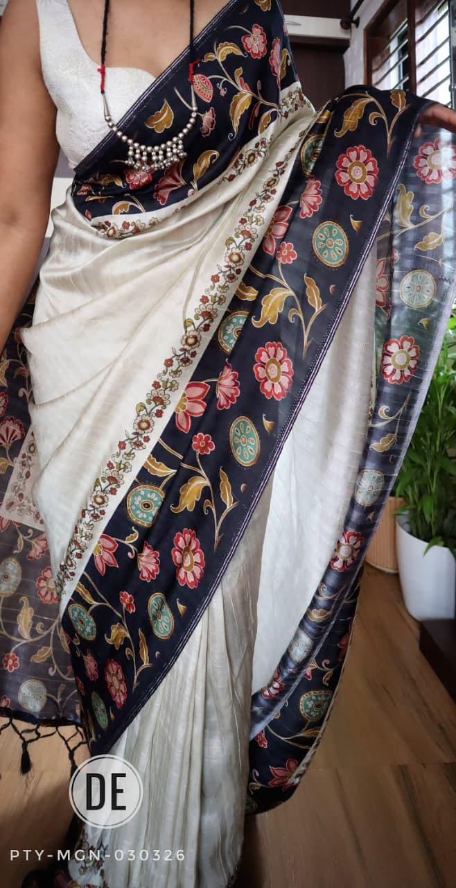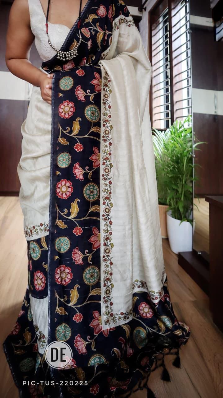 Add this cream tussar silk saree with navy Kalamkari border to your collection and enjoy the perfect combination of traditional craftsmanship, comfort, and modern ethnic elegance for every special occasion.