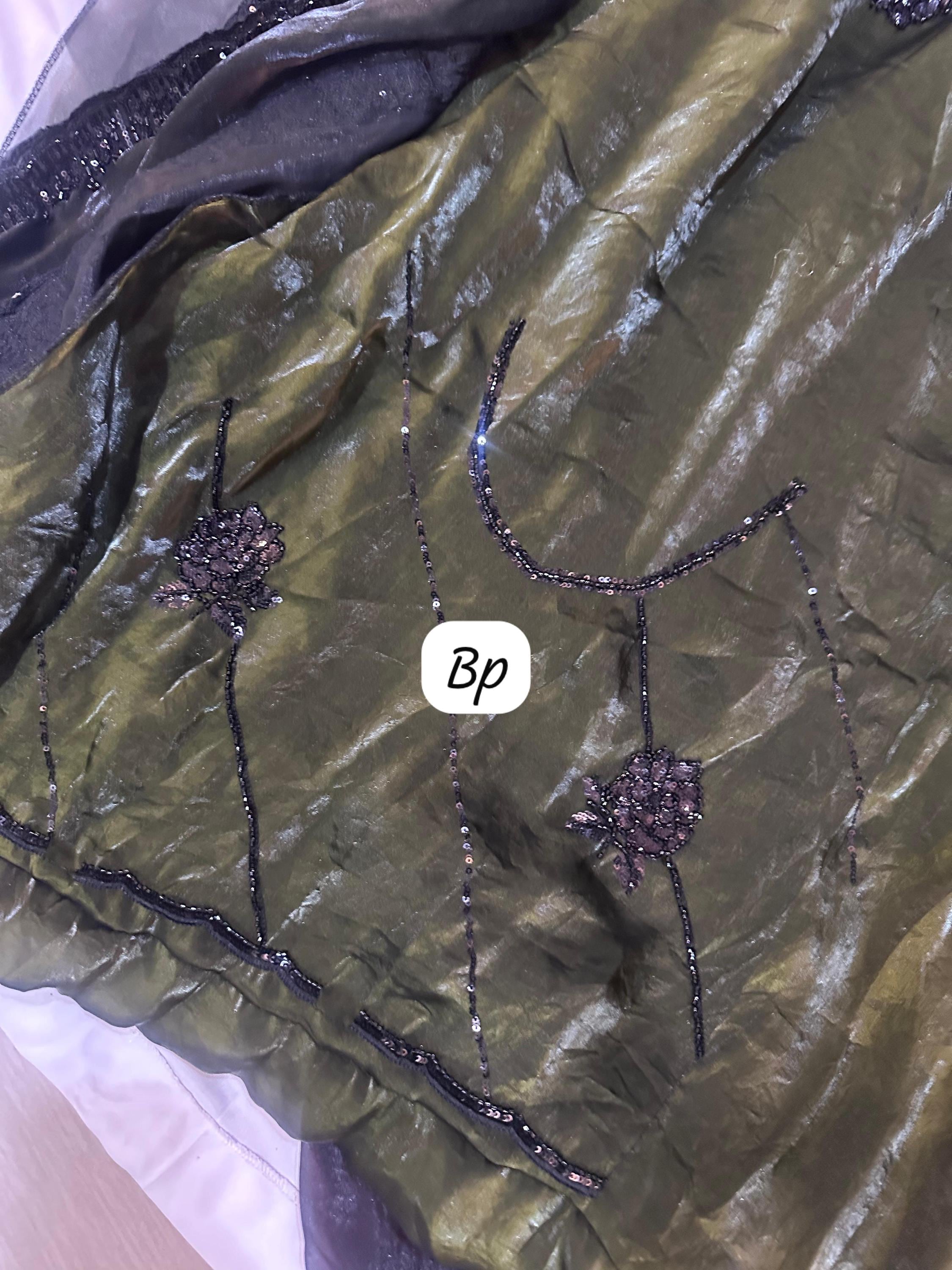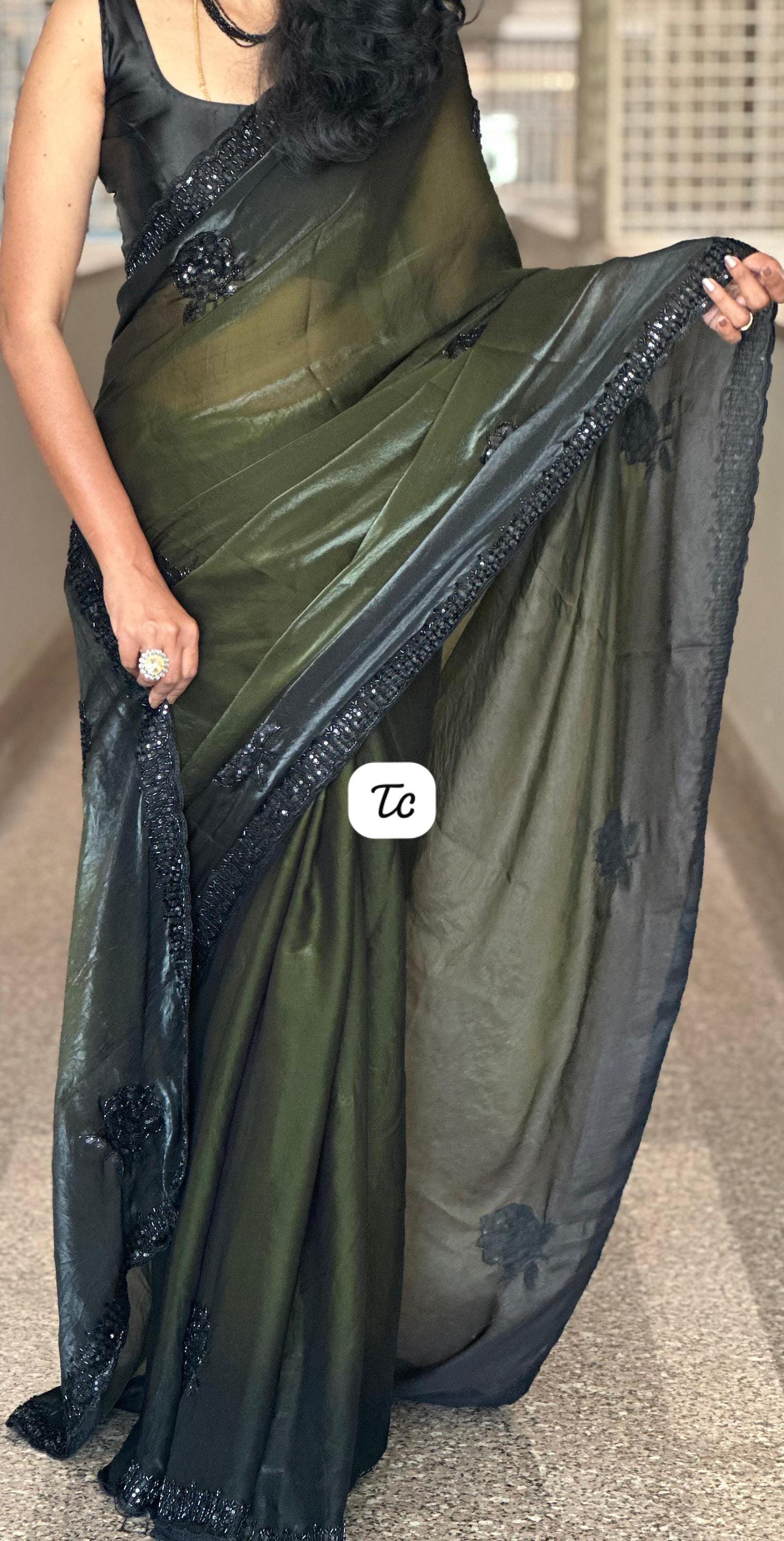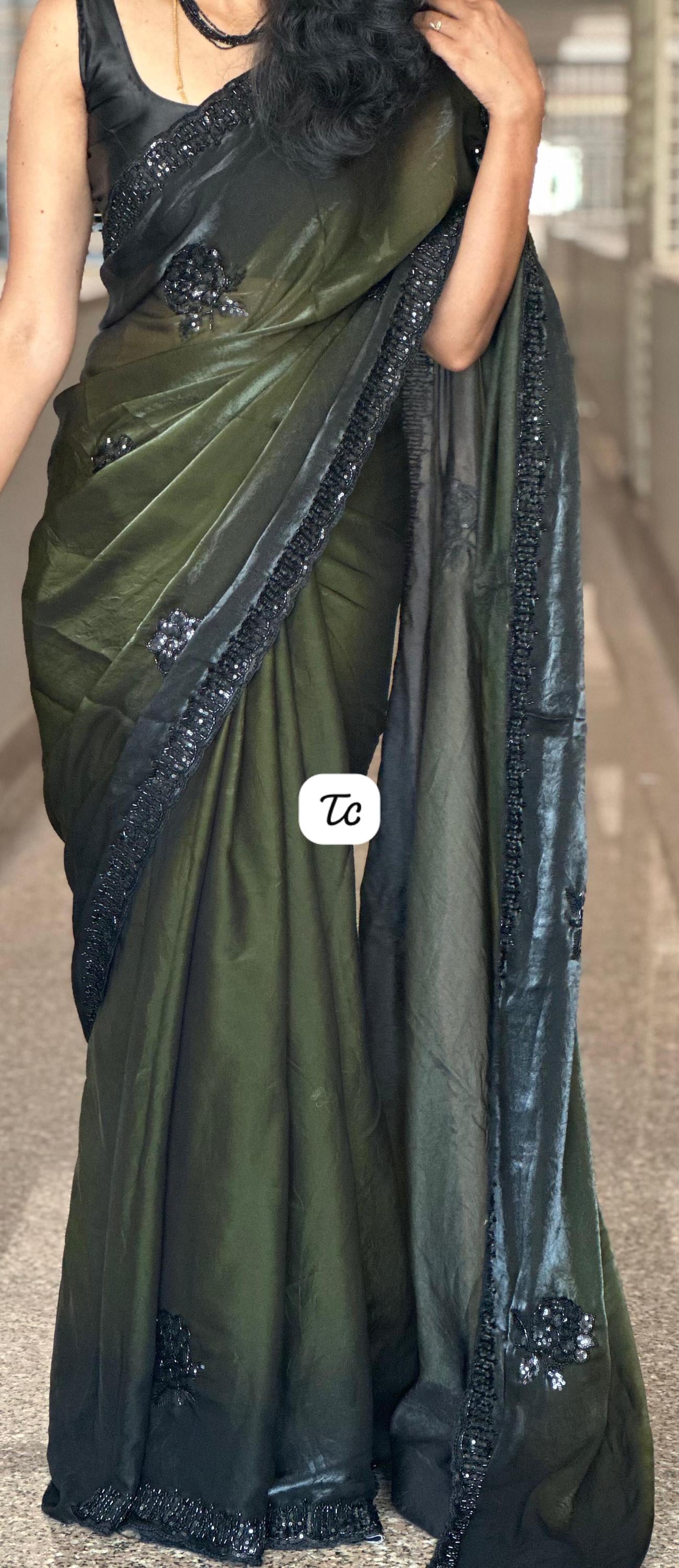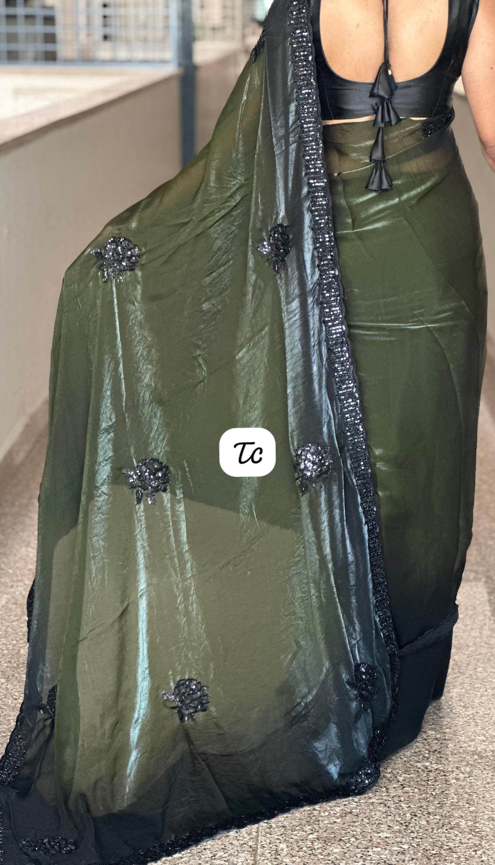 Make a bold and elegant statement with this stunning Olive Green Black Ombre Saree crafted in Shimmer Tissue Organza, designed for modern women who love refined glamour. The unique ombre blend of olive green merging into deep black creates a striking visual gradient, offering a contemporary and sophisticated appeal perfect for evening occasions.