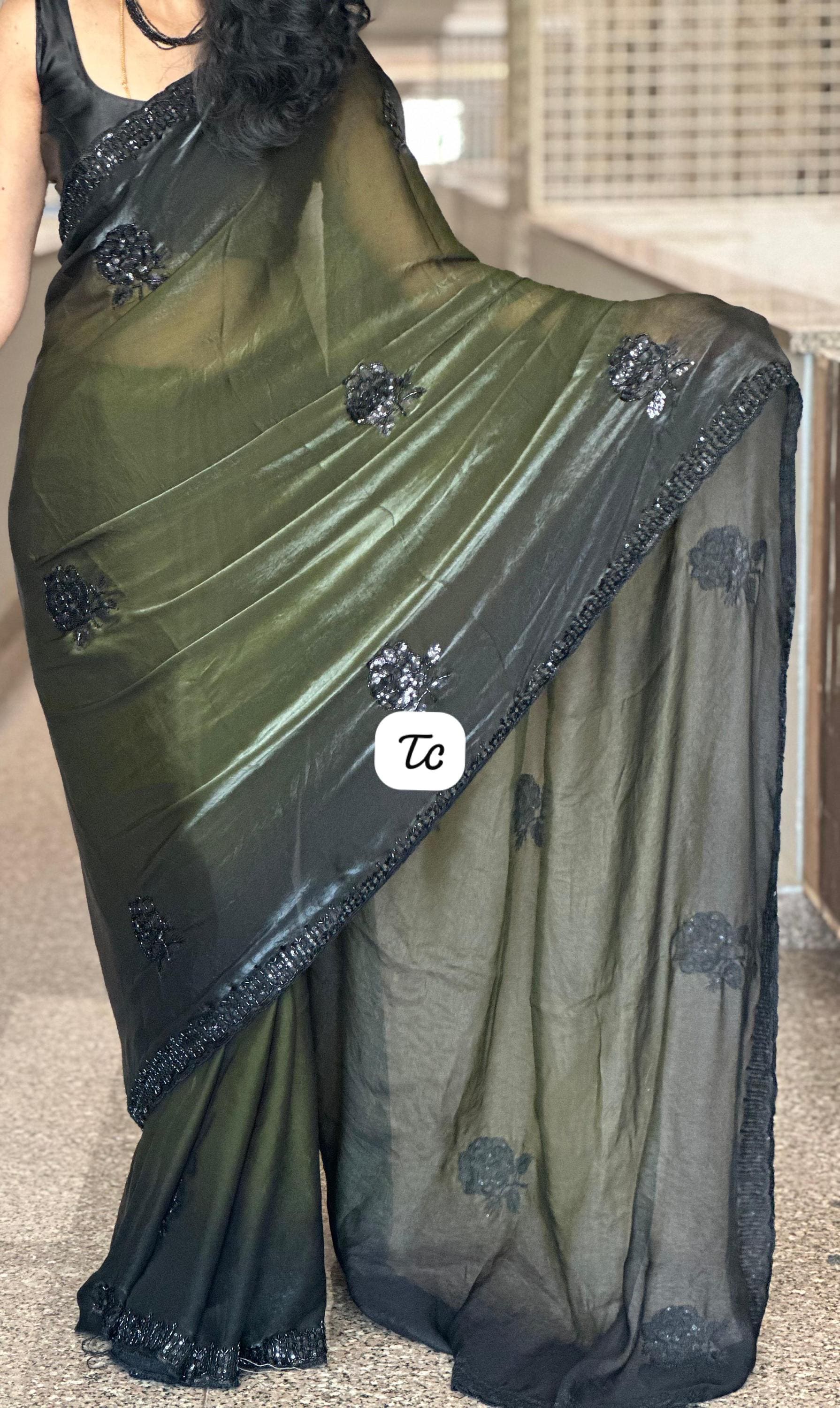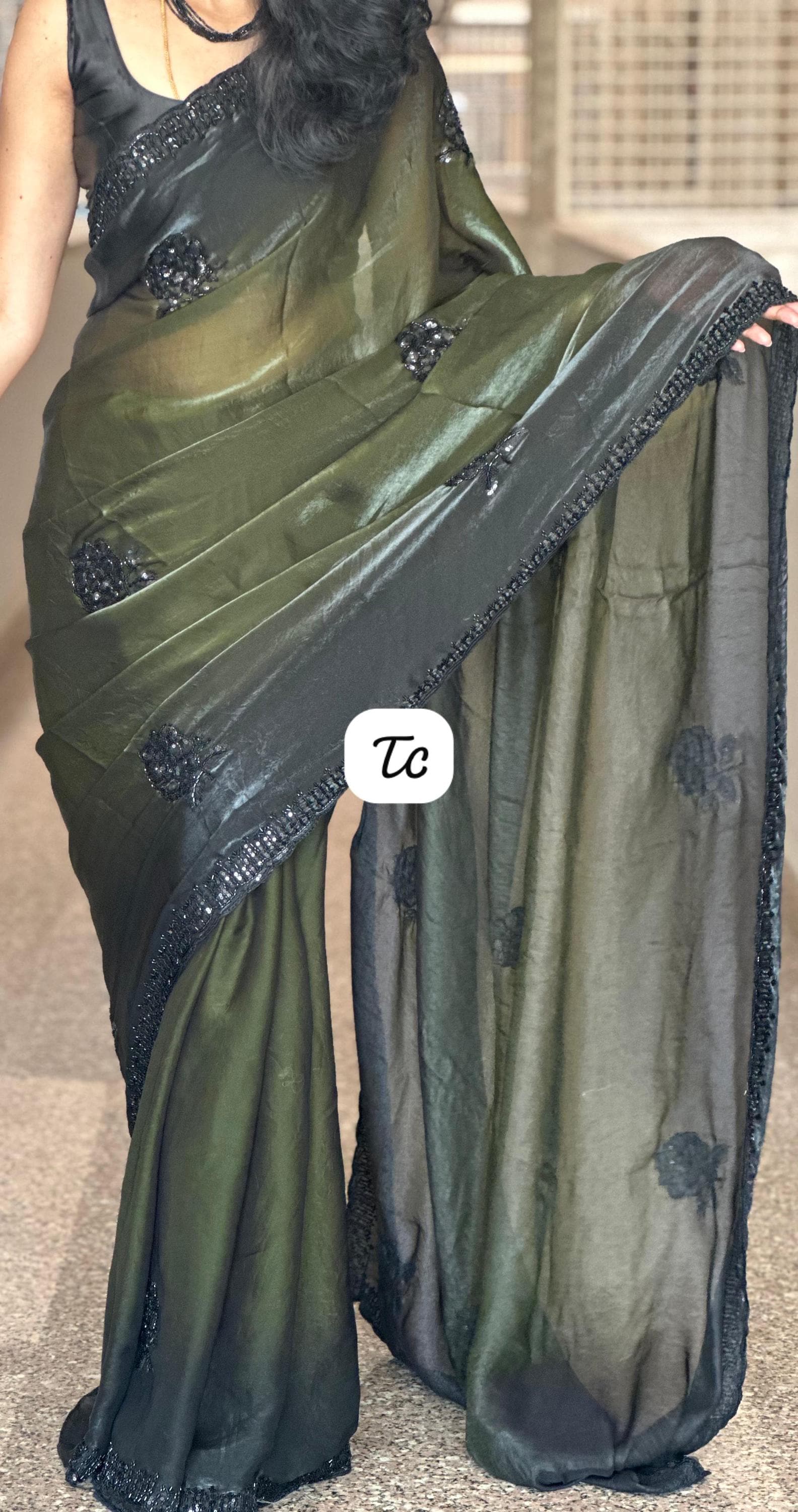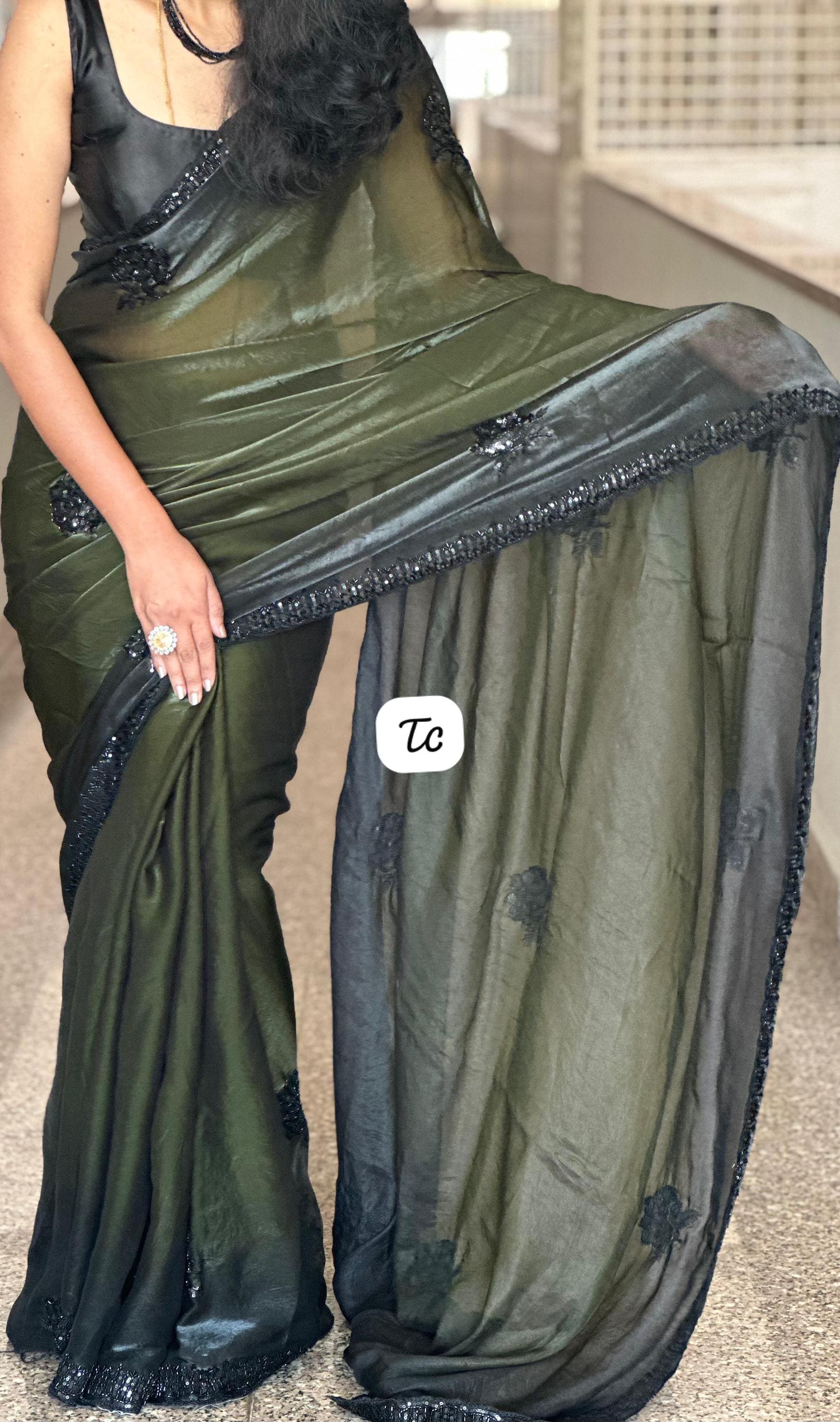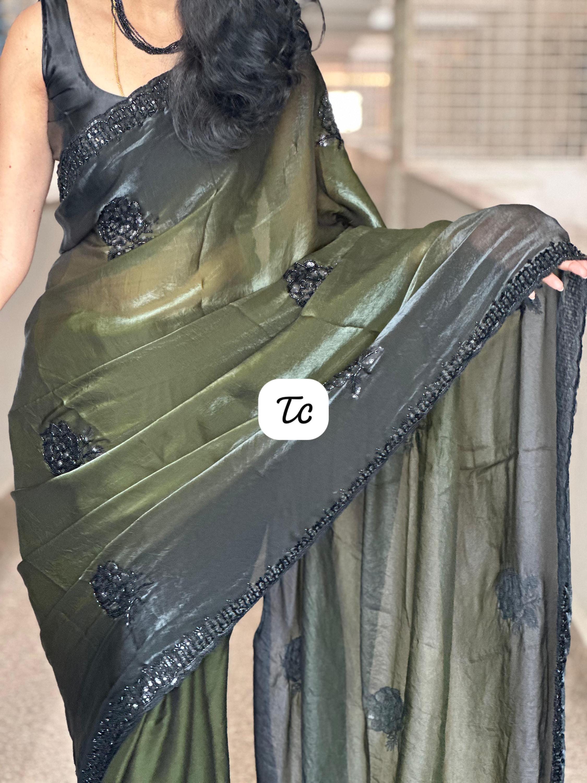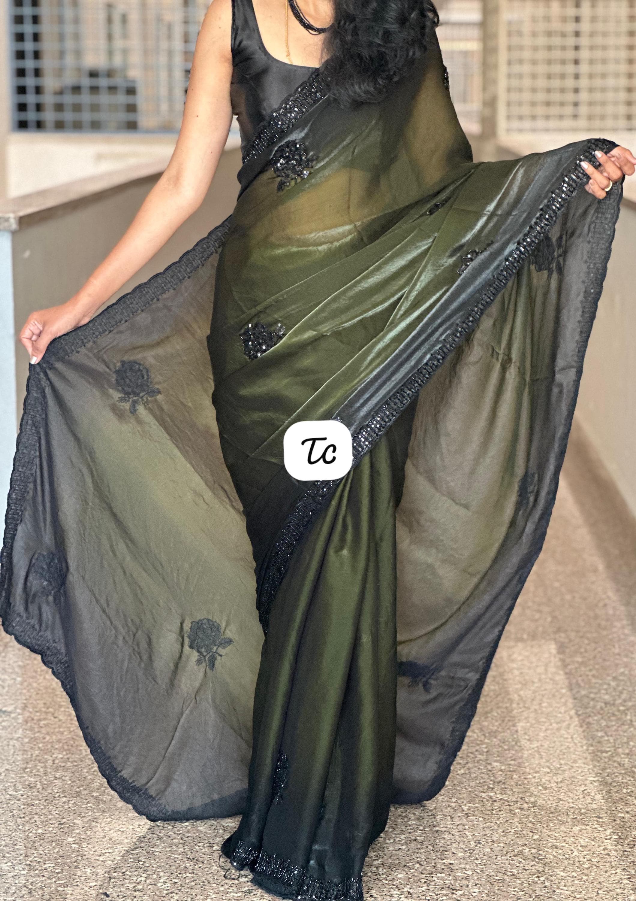 Make a bold and elegant statement with this stunning Olive Green Black Ombre Saree crafted in Shimmer Tissue Organza, designed for modern women who love refined glamour. The unique ombre blend of olive green merging into deep black creates a striking visual gradient, offering a contemporary and sophisticated appeal perfect for evening occasions.