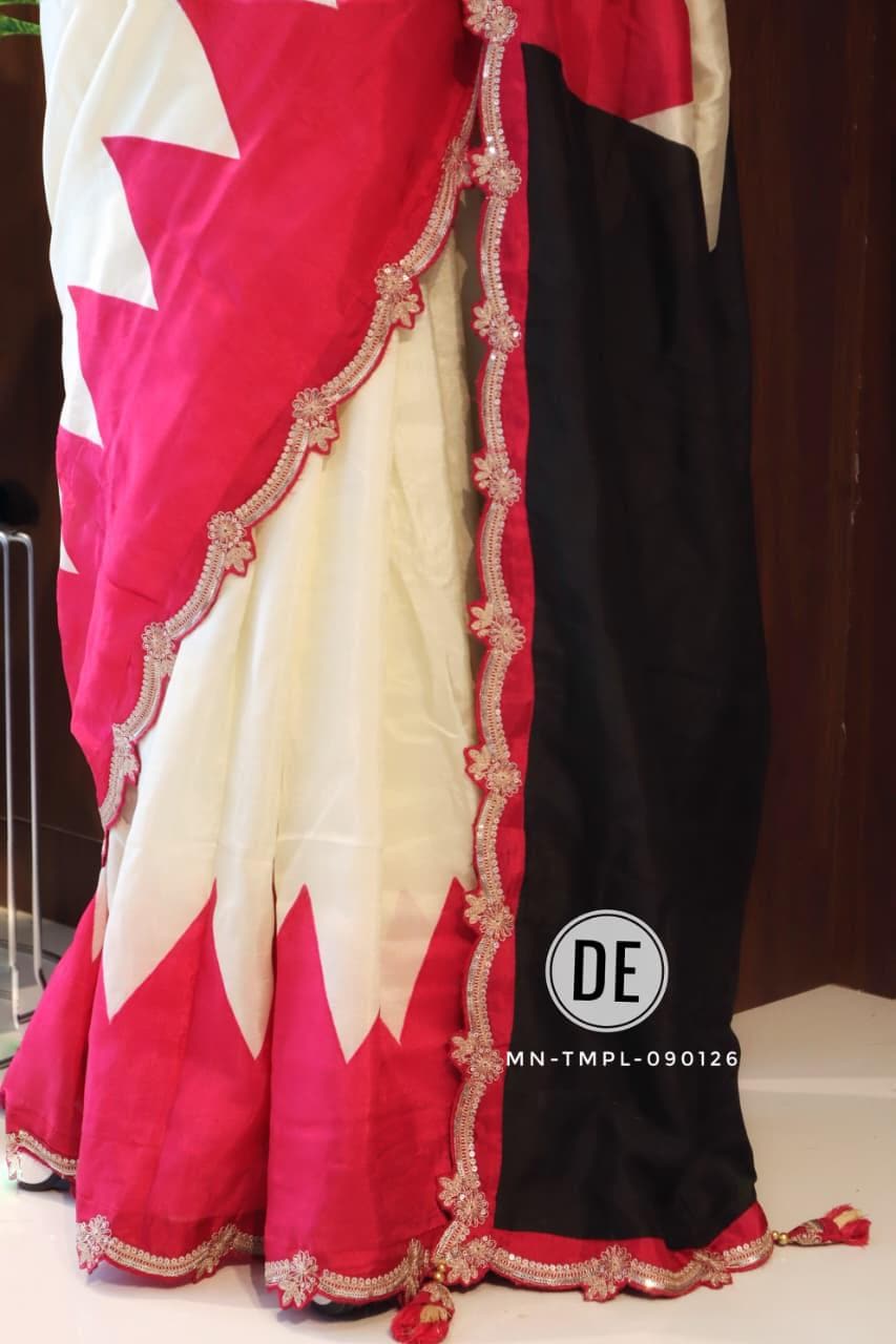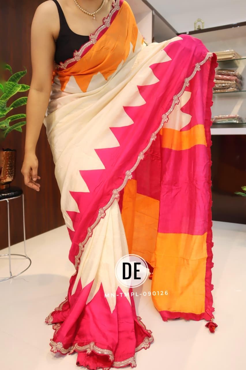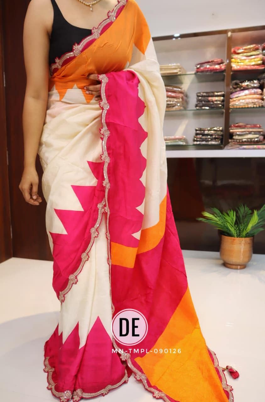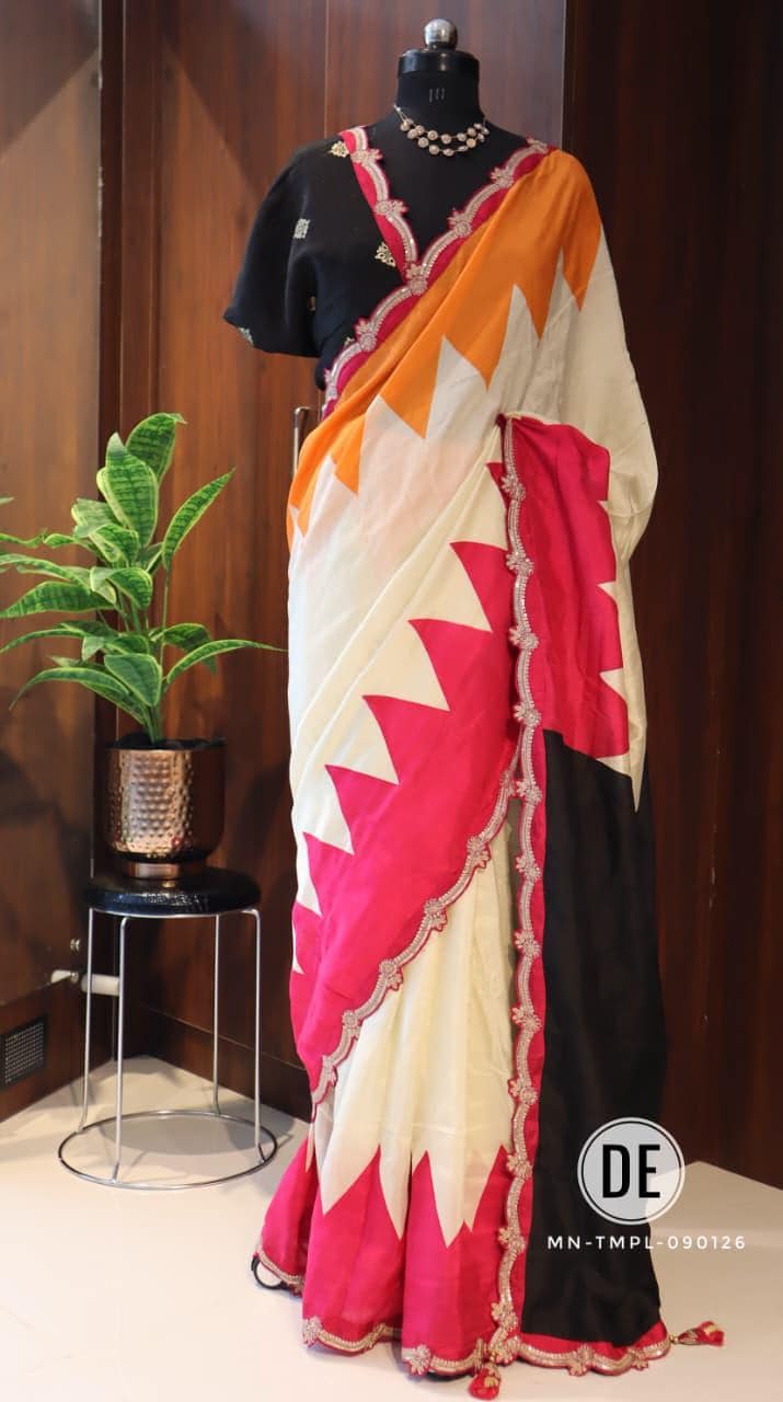 The bold colorblock combination of bright pink and lively orange creates a cheerful and eye-catching appeal, making it an ideal choice for daytime functions. The modern geometric pattern adds a contemporary twist, while the delicately designed scalloped embroidered border enhances the saree with a touch of intricate craftsmanship and feminine charm.