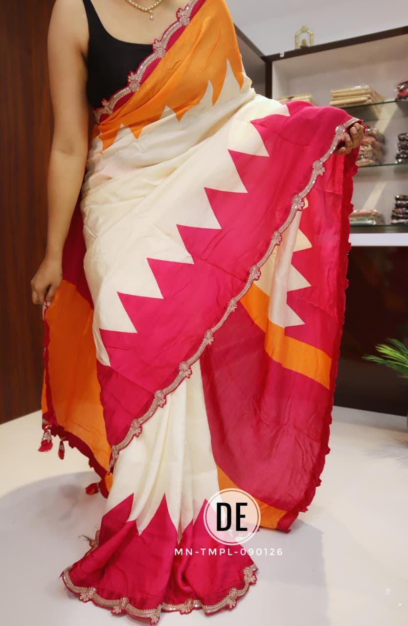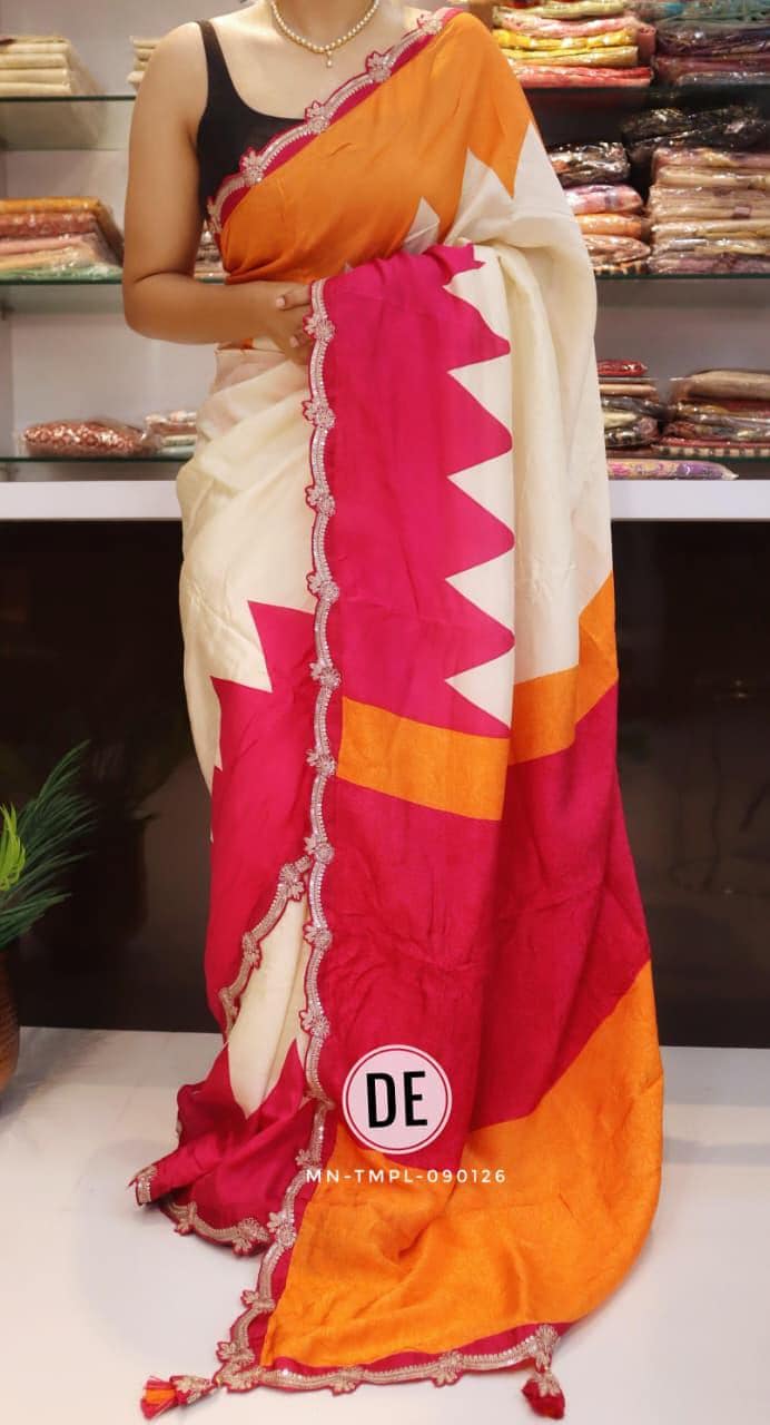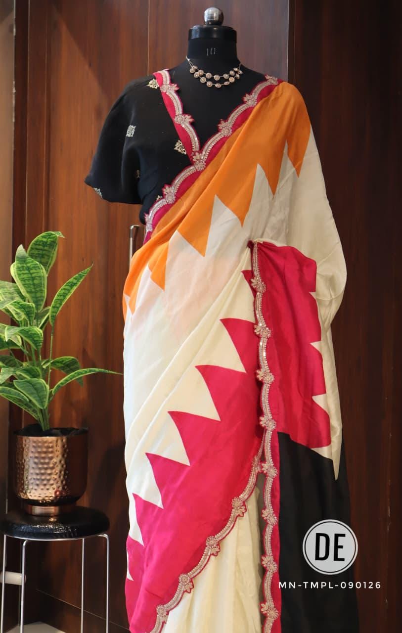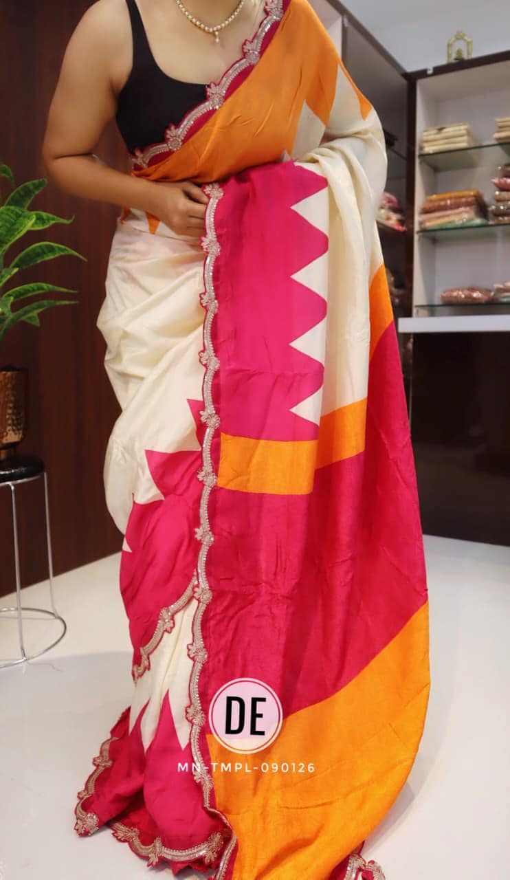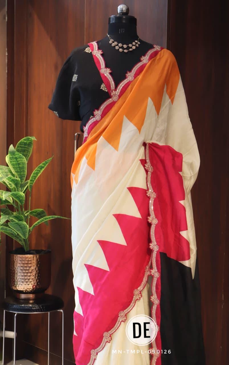 The bold colorblock combination of bright pink and lively orange creates a cheerful and eye-catching appeal, making it an ideal choice for daytime functions. The modern geometric pattern adds a contemporary twist, while the delicately designed scalloped embroidered border enhances the saree with a touch of intricate craftsmanship and feminine charm.