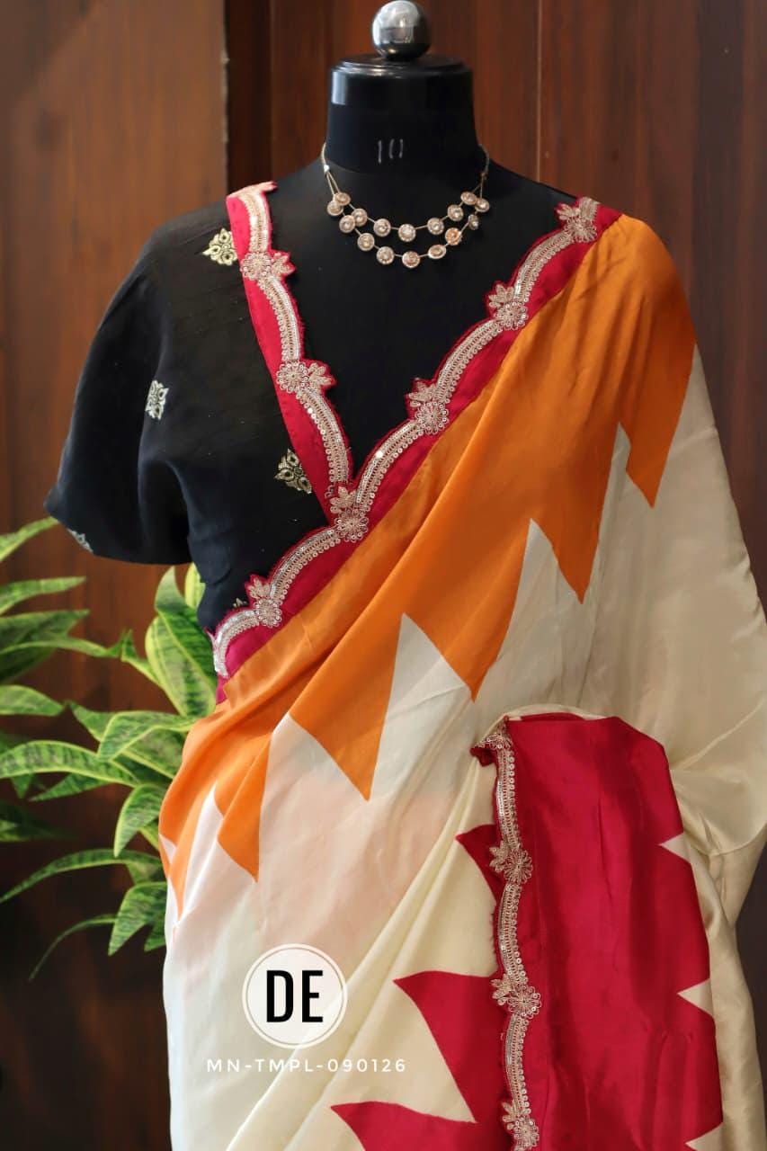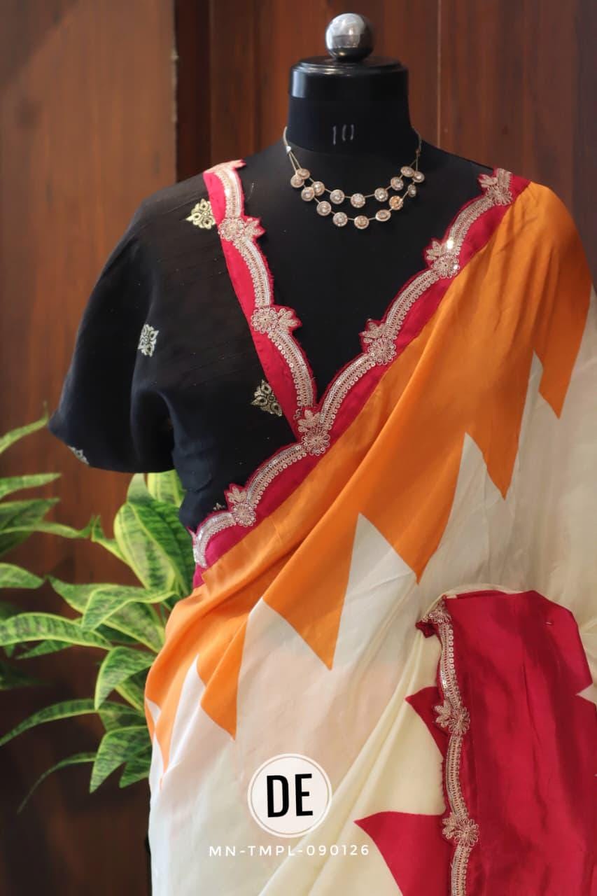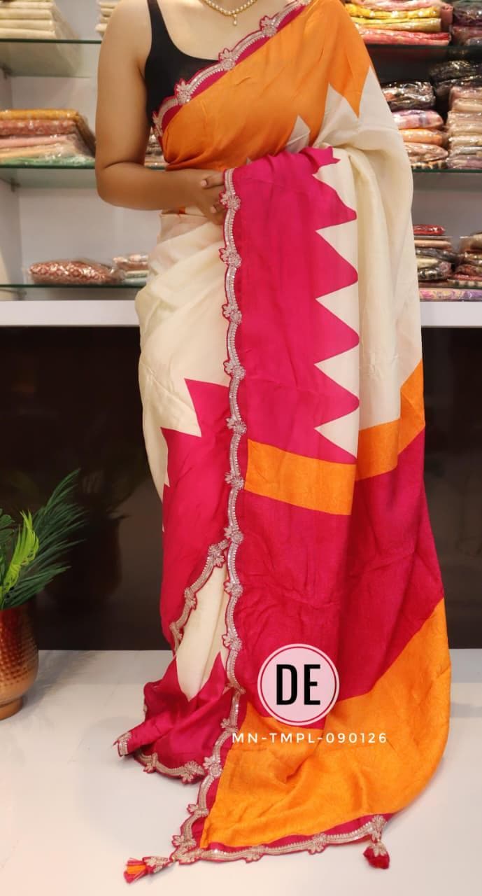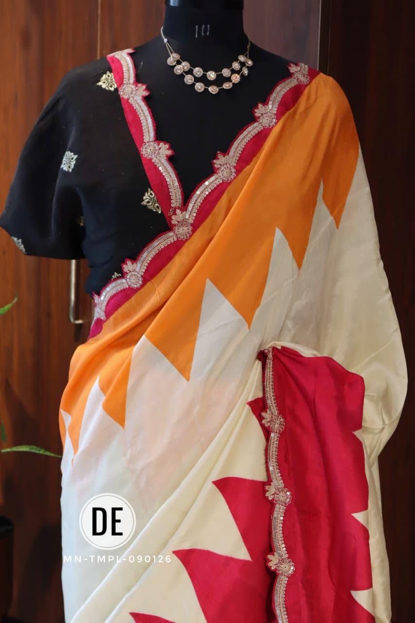 The bold colorblock combination of bright pink and lively orange creates a cheerful and eye-catching appeal, making it an ideal choice for daytime functions. The modern geometric pattern adds a contemporary twist, while the delicately designed scalloped embroidered border enhances the saree with a touch of intricate craftsmanship and feminine charm.