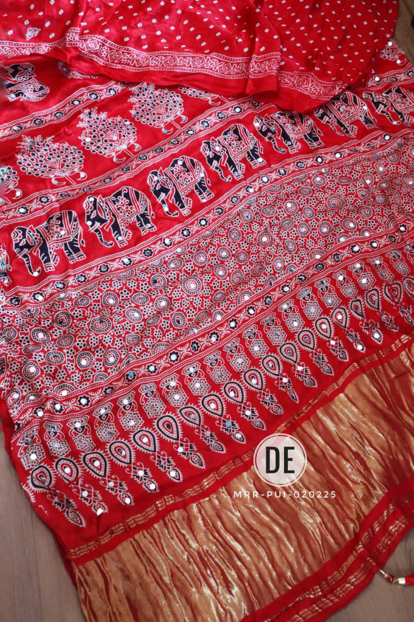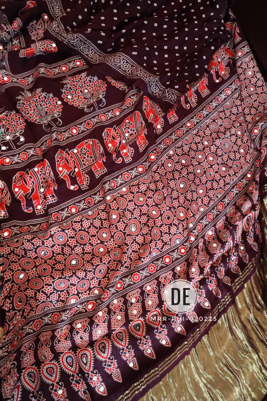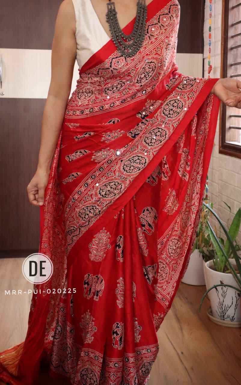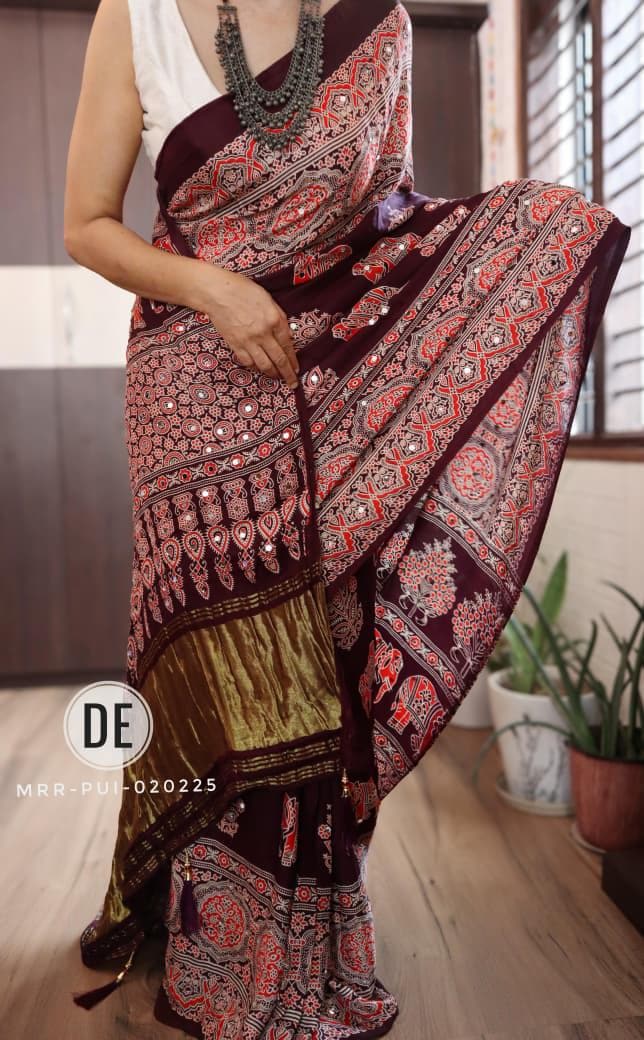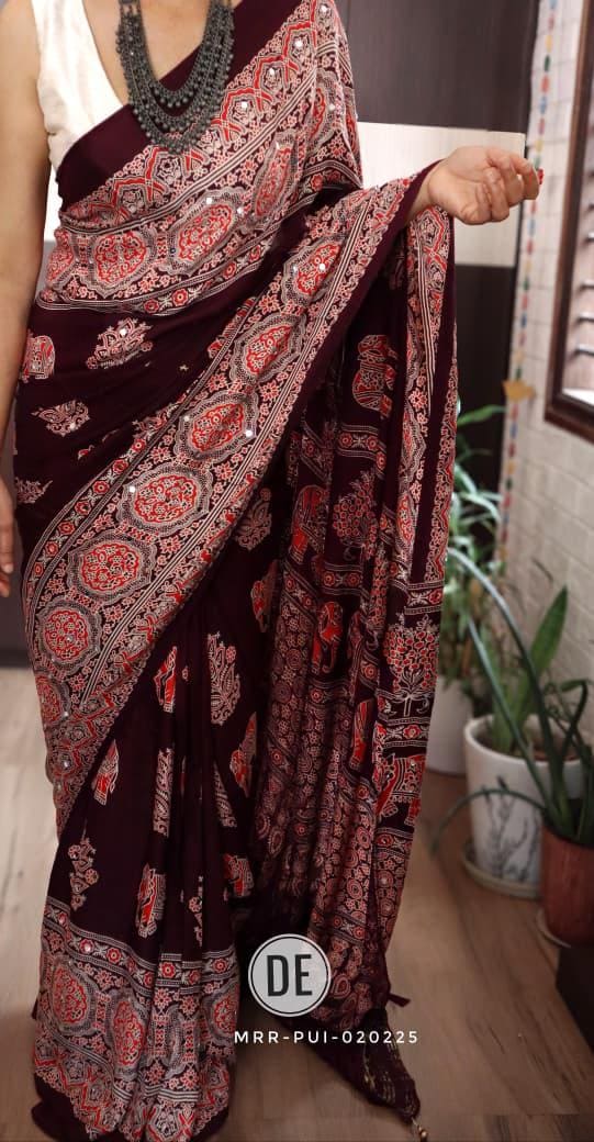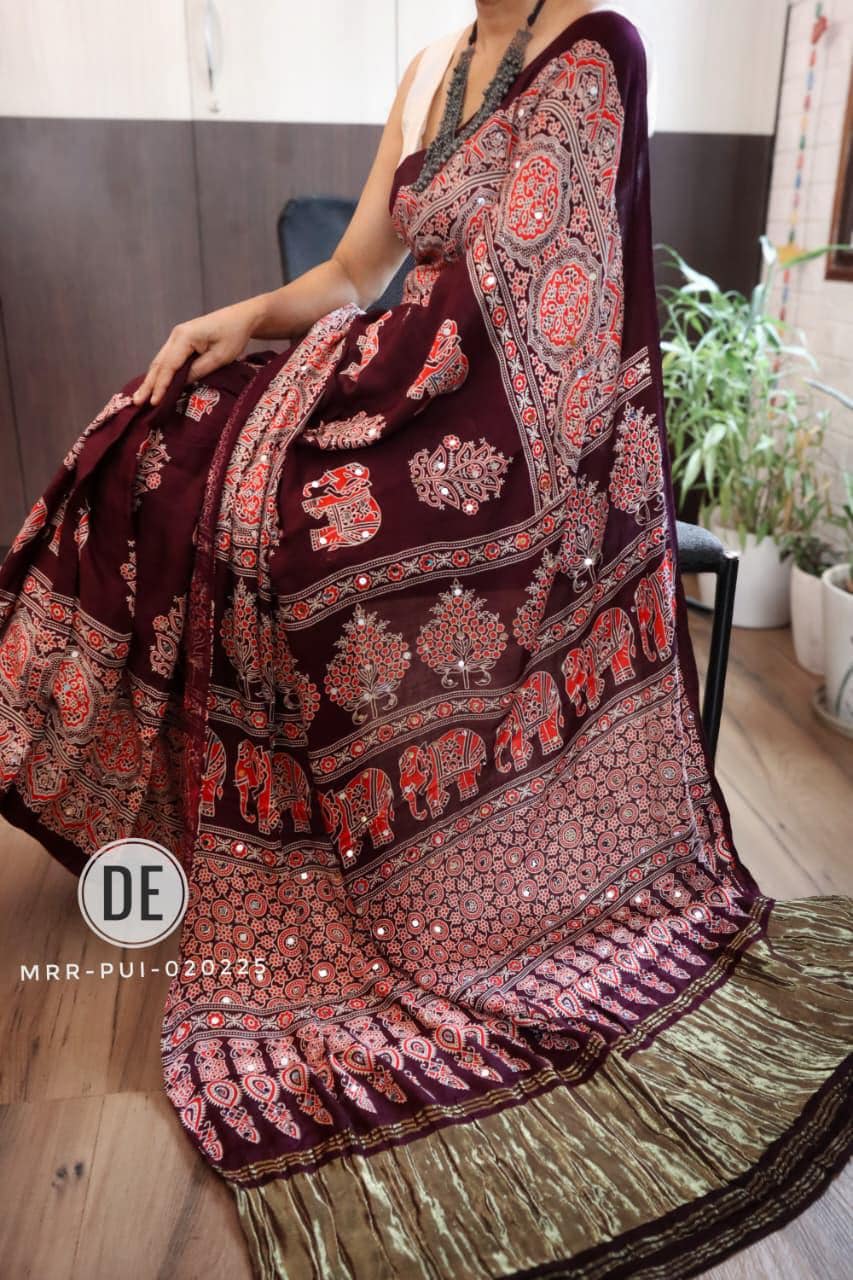 The deep maroon base exudes richness and sophistication, while the intricate Ajrakh motifs reflect centuries-old Indian artistry, making this saree a standout piece for festive occasions, cultural events, and casual gatherings. The subtle mirror work adds a hint of sparkle and charm, enhancing the bohemian ethnic vibe and catching the light beautifully with every movement.