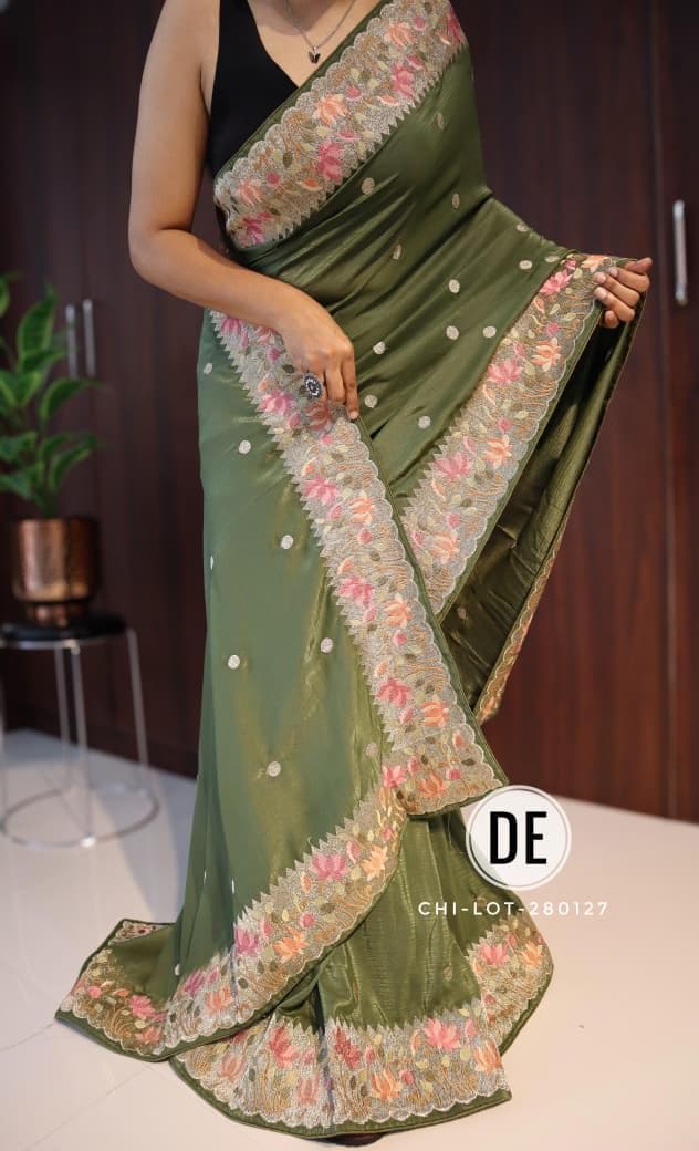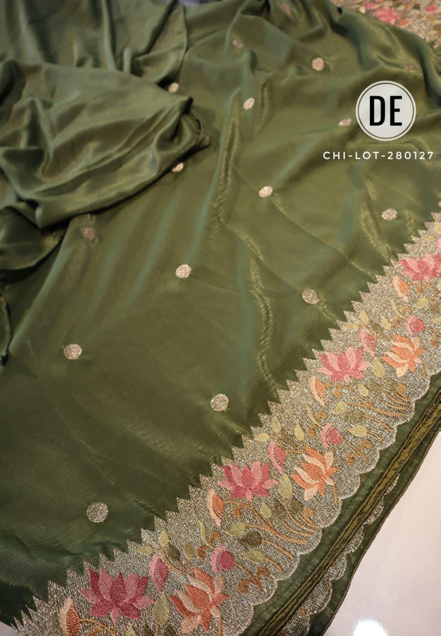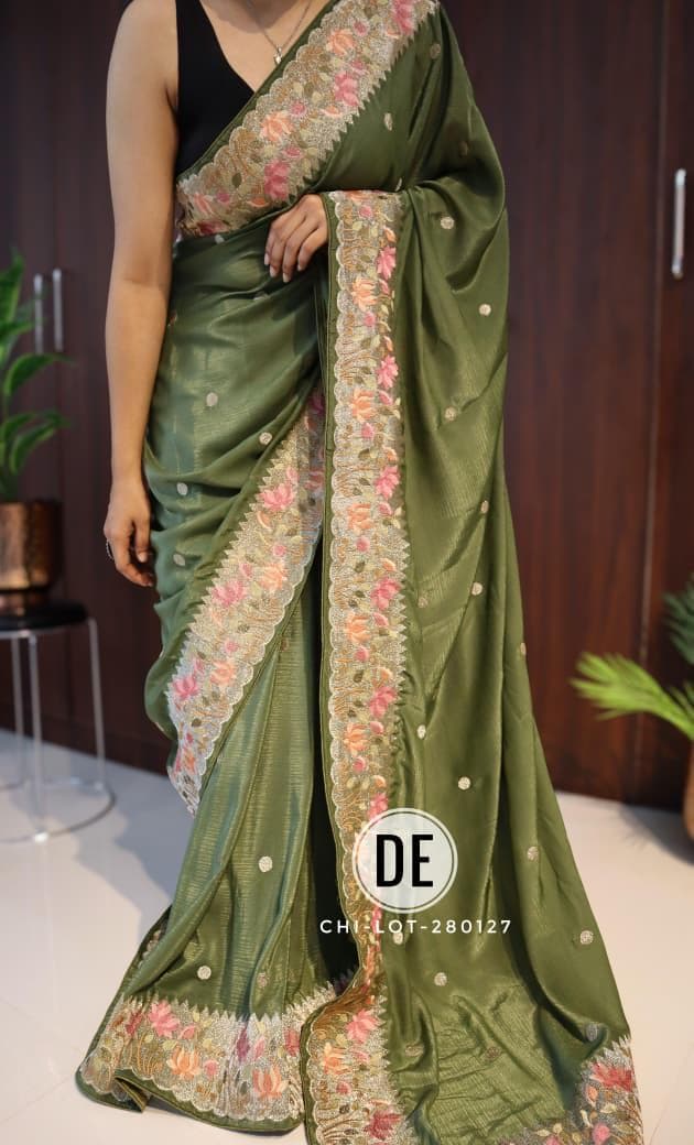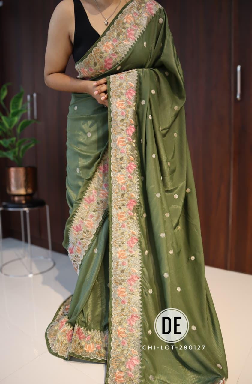 The rich olive green shade exudes serenity and elegance, making it an ideal choice for daytime wedding functions, mehendi rituals, and festive gatherings. Its highlight is the delicately scalloped floral embroidery along the border, which adds a feminine and artistic touch, combining traditional craftsmanship with contemporary design.