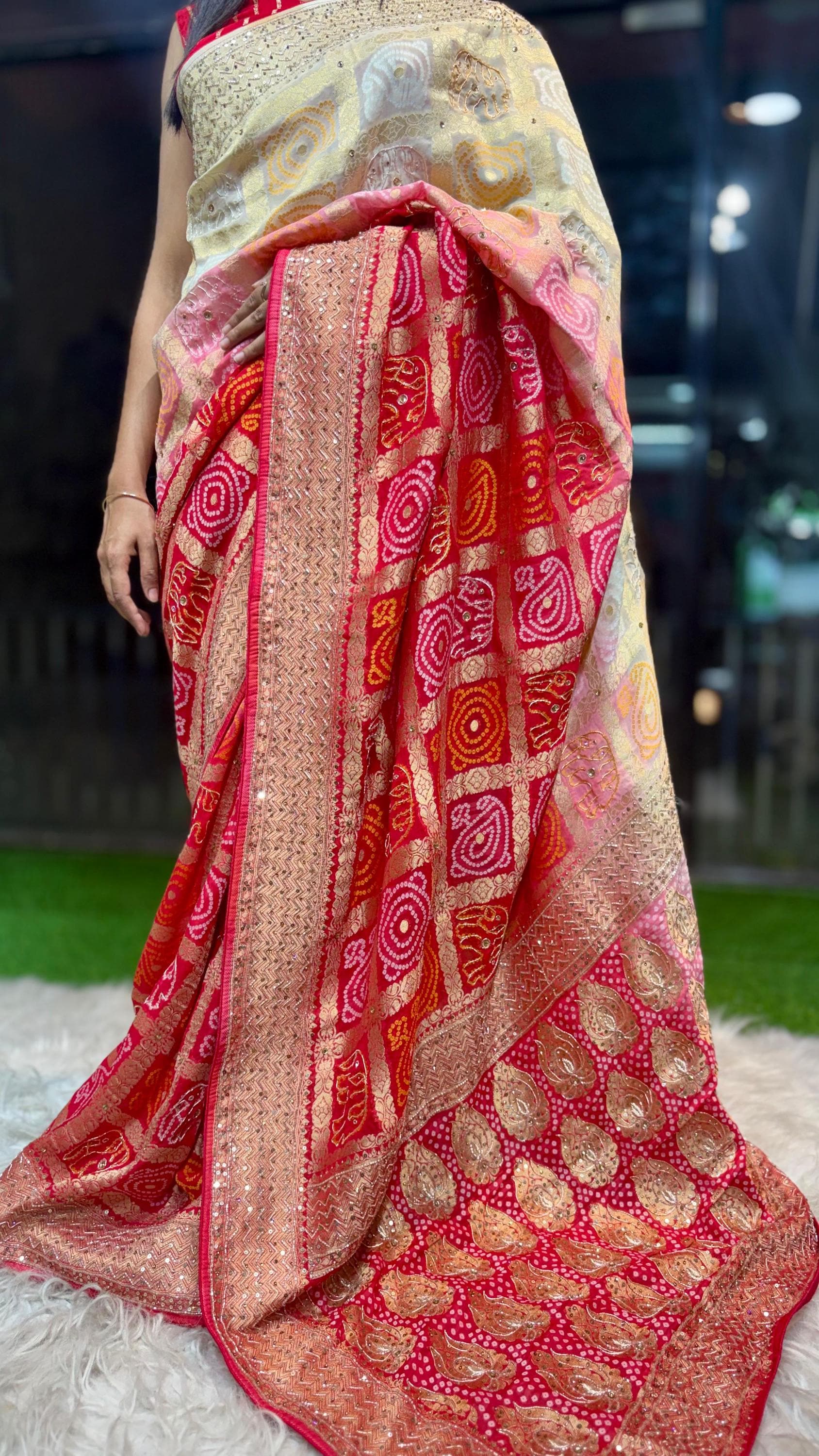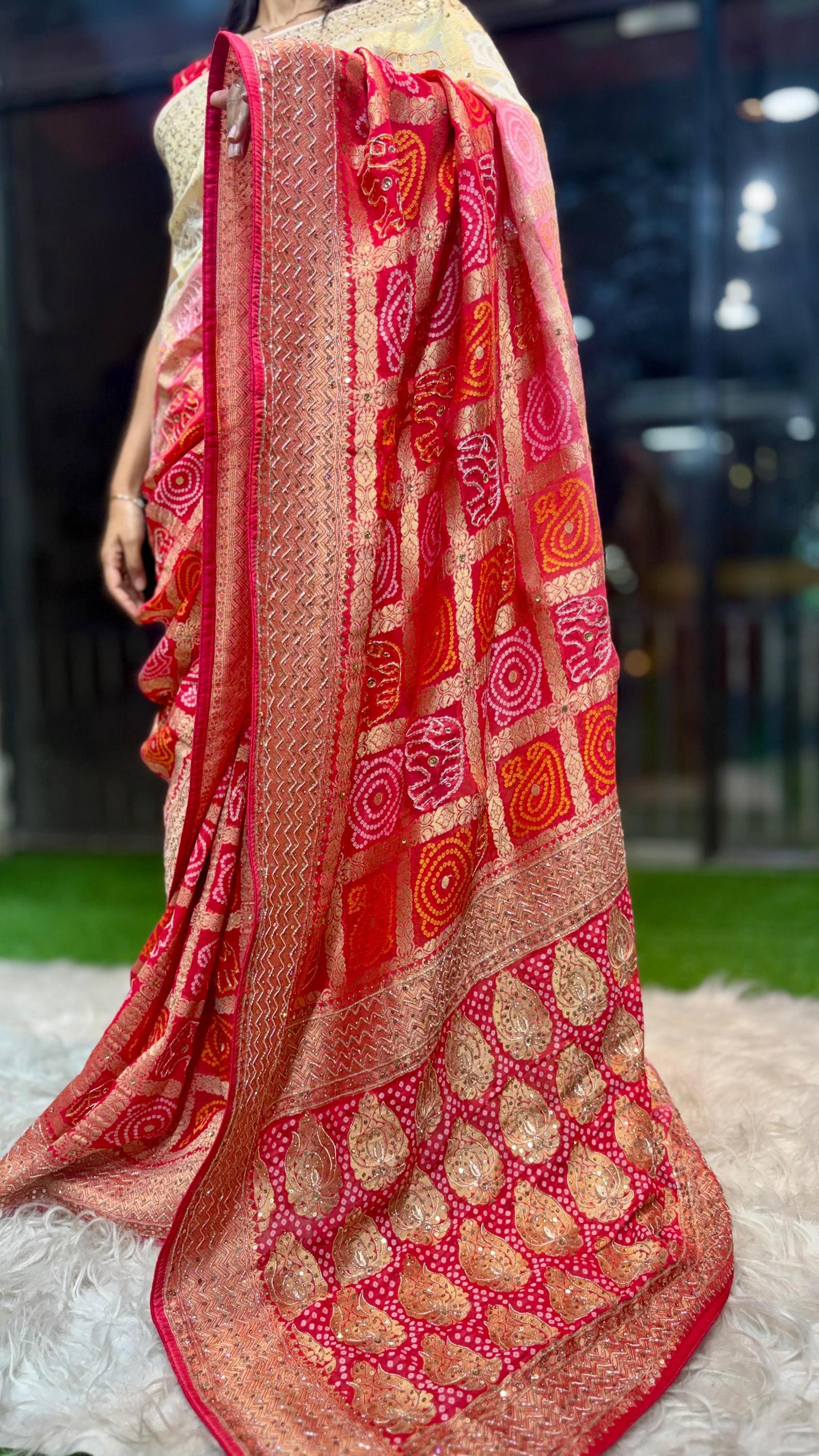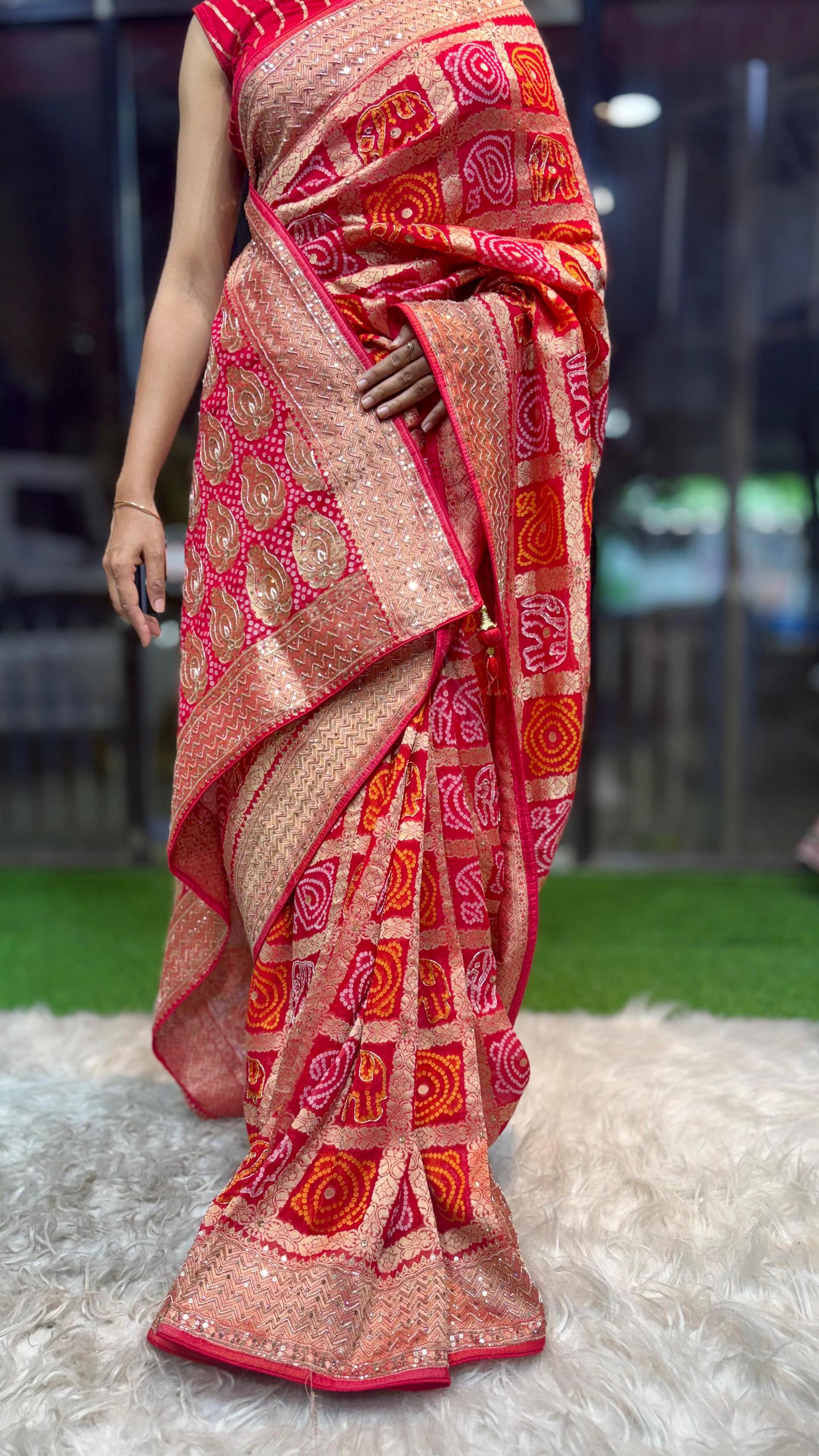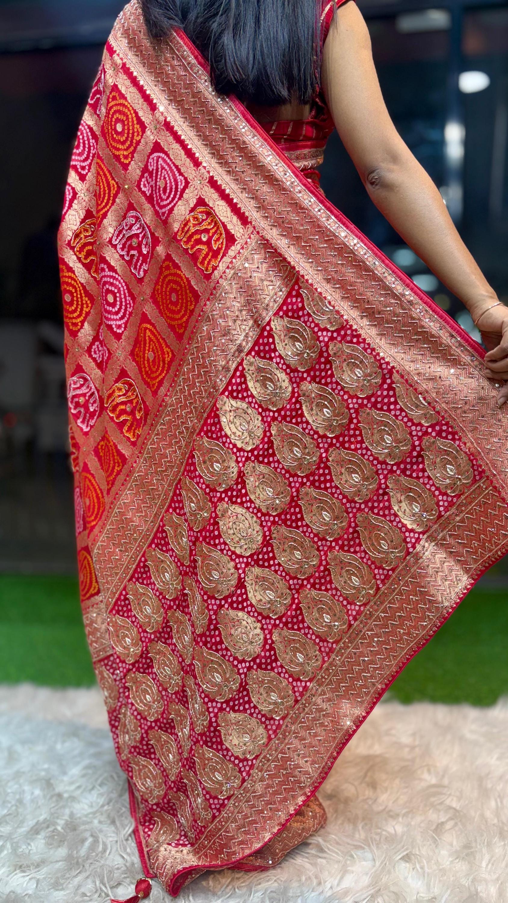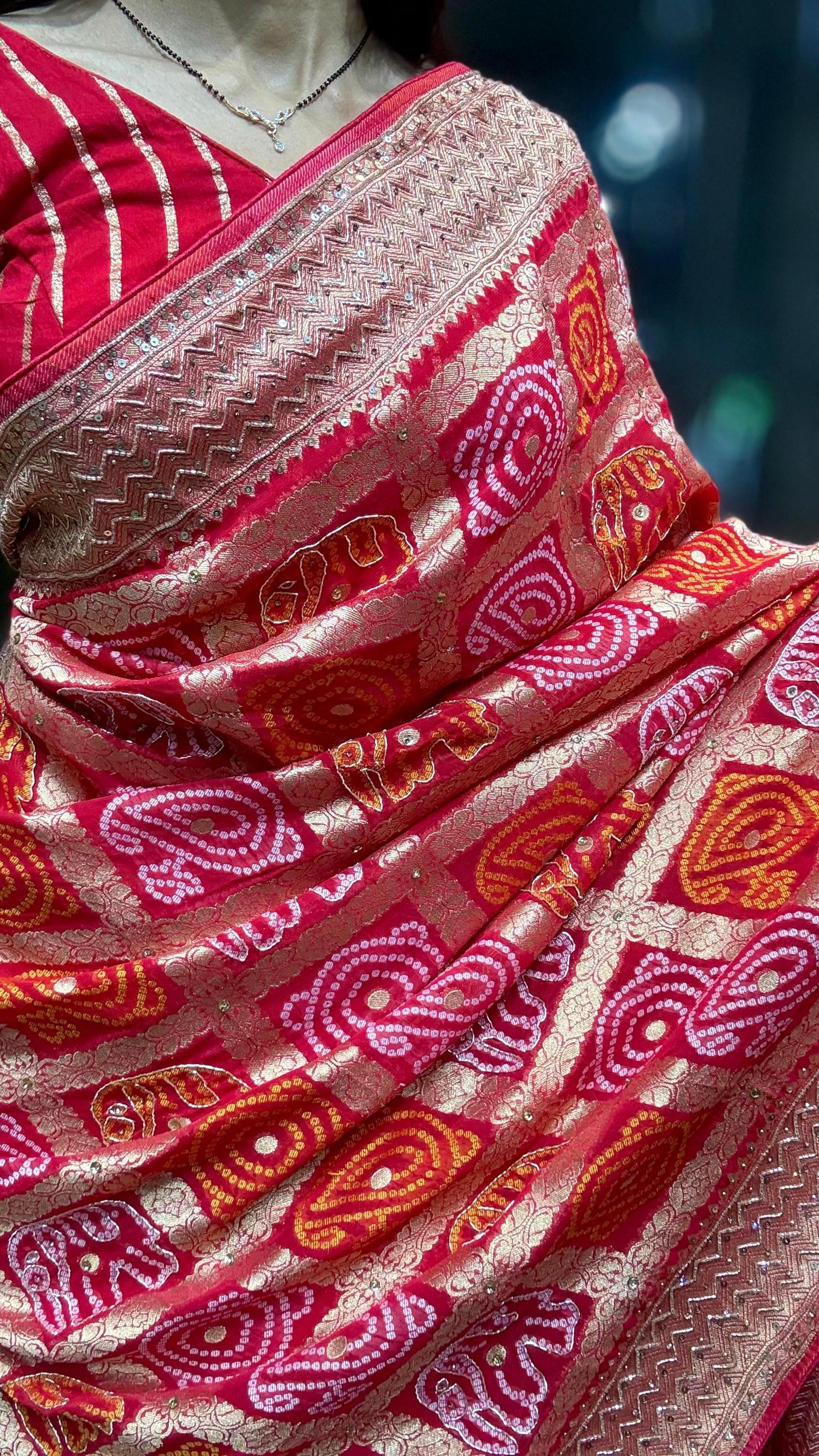 Celebrate timeless tradition and regal elegance with this Red Gharchola Bandhani Saree featuring a Gold Zari Banarasi Weave, specially crafted for Indian brides and festive occasions. Made from premium silk, this saree combines the rich heritage of Banarasi weaving with the intricate Bandhani tie-dye technique, offering a luxurious texture and a graceful drape that enhances your bridal silhouette.