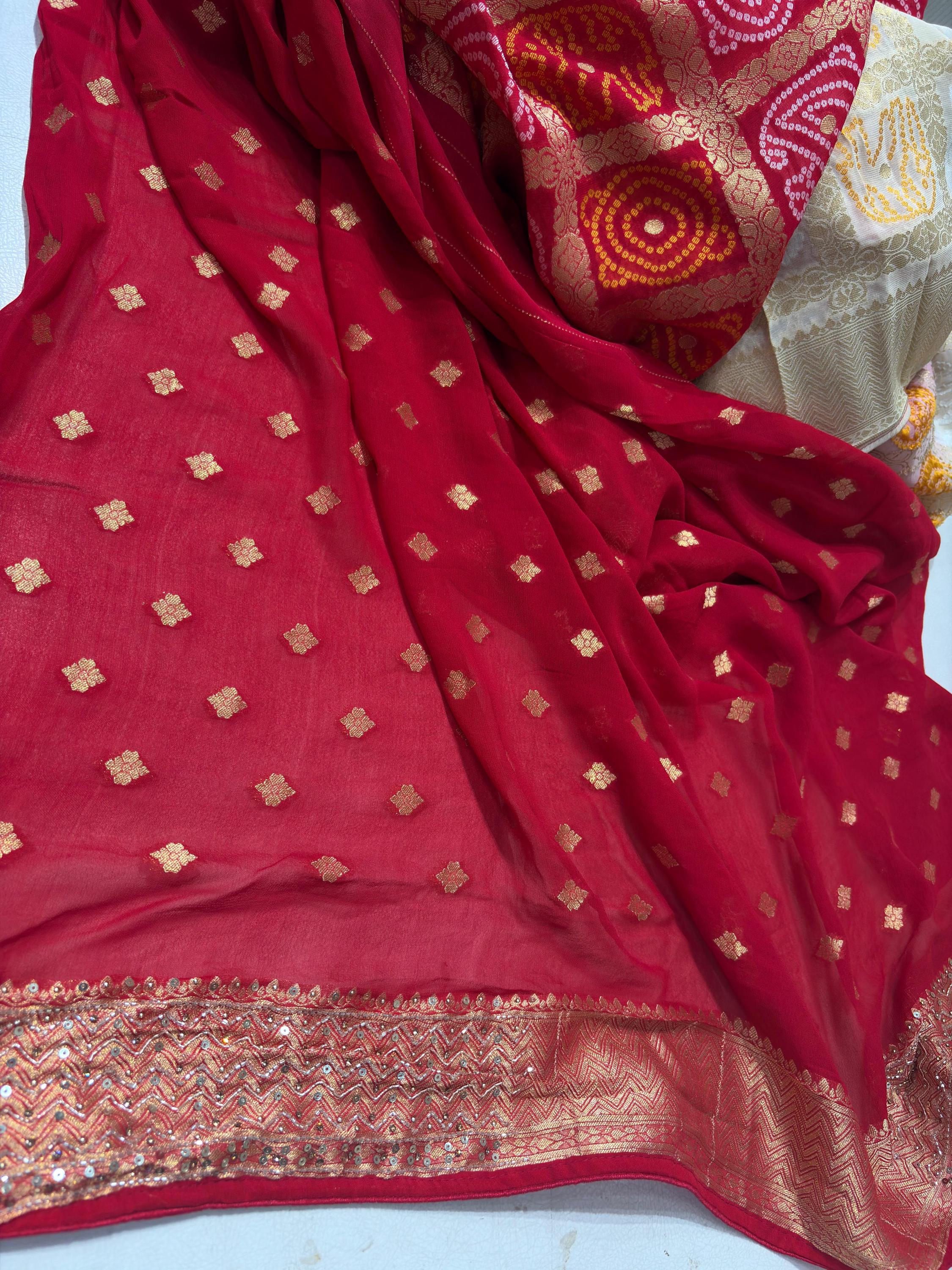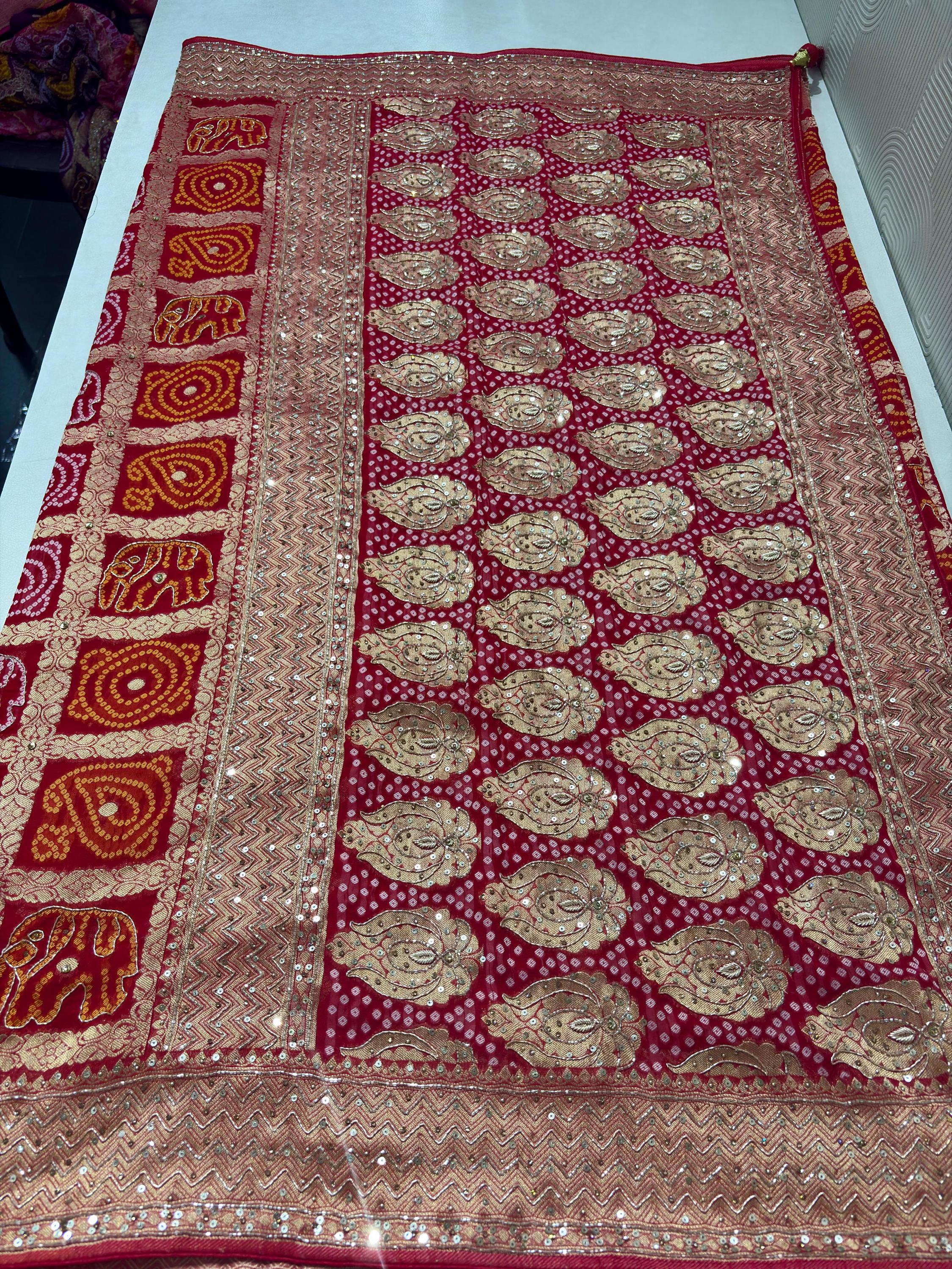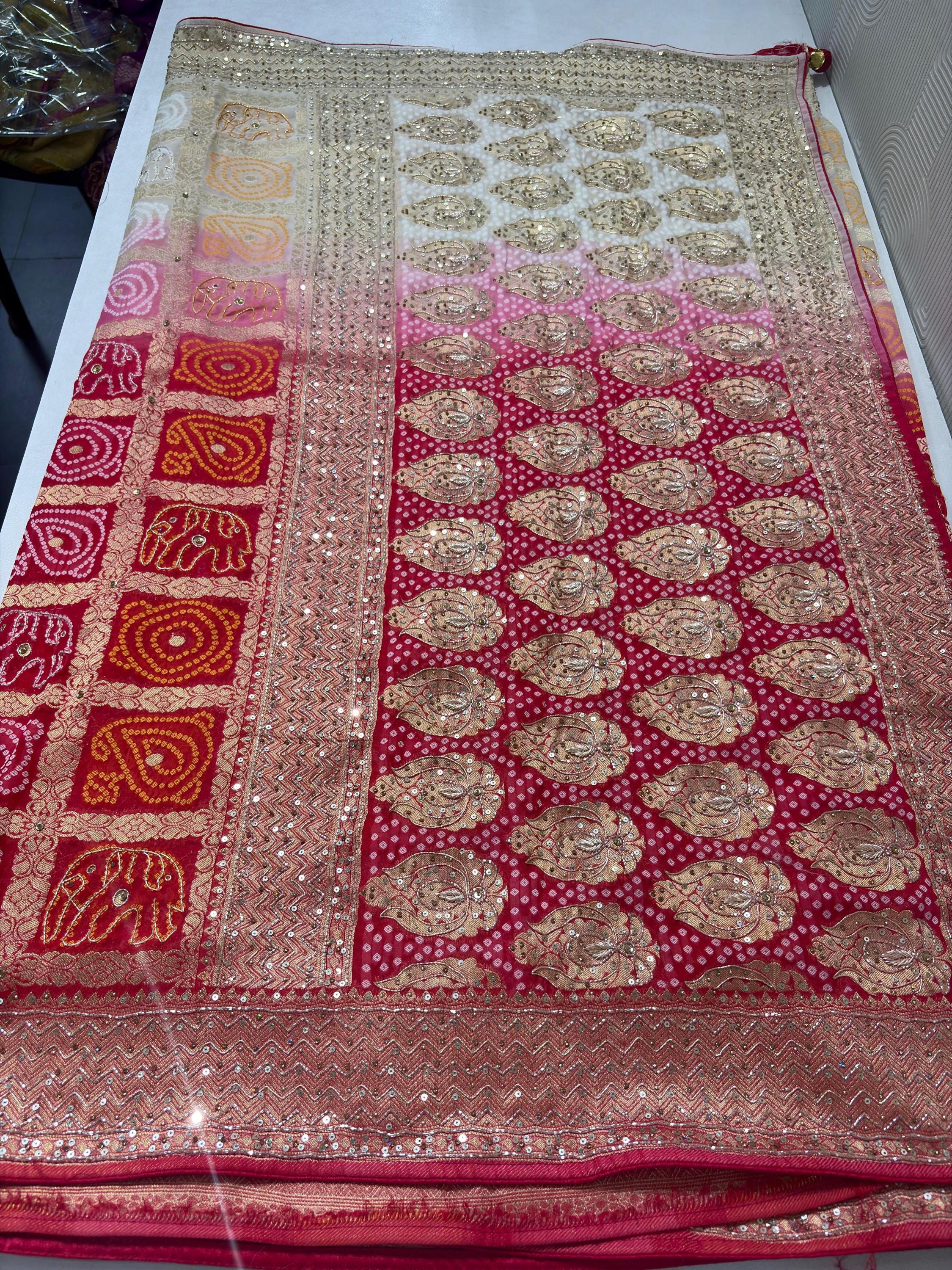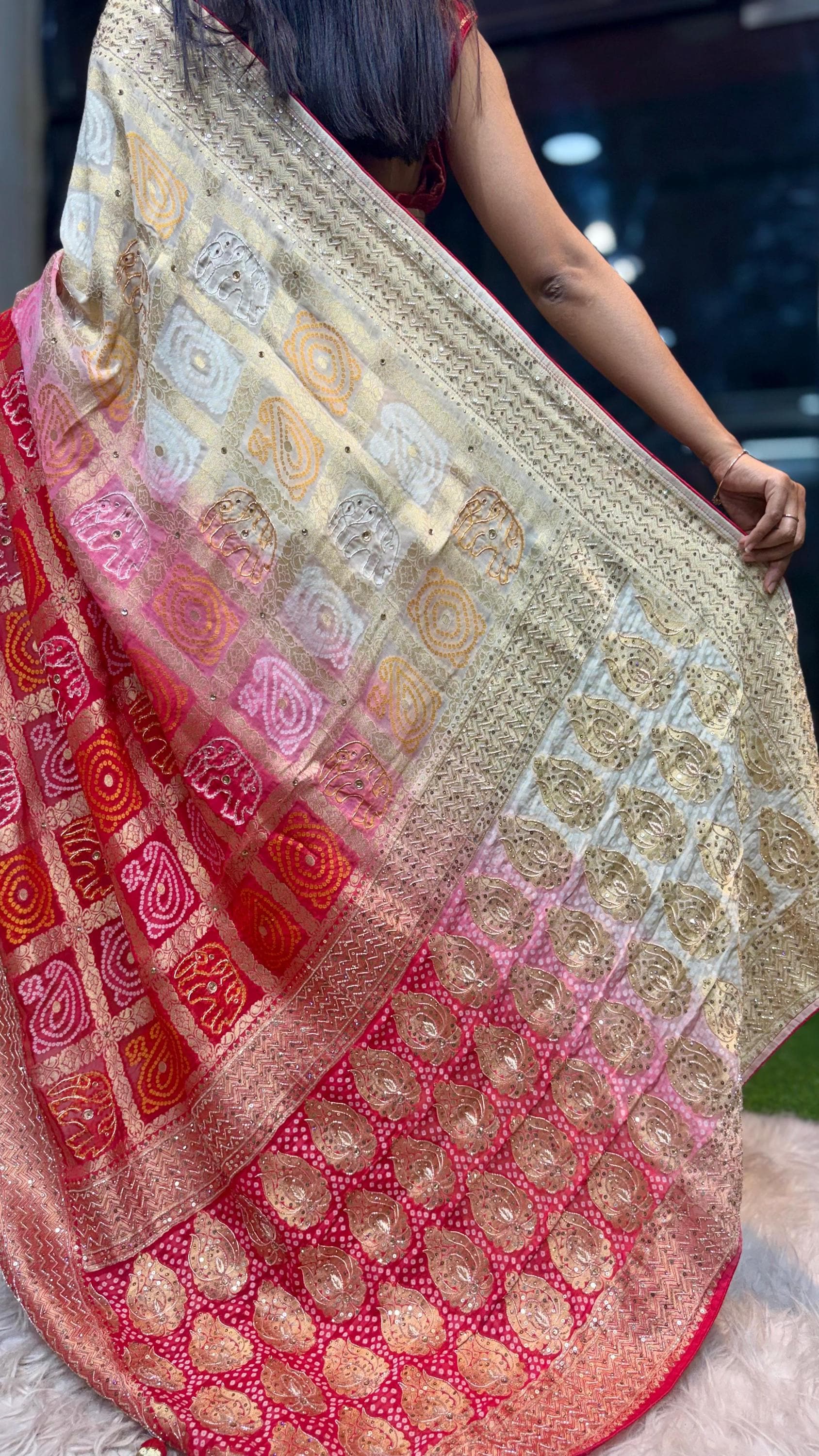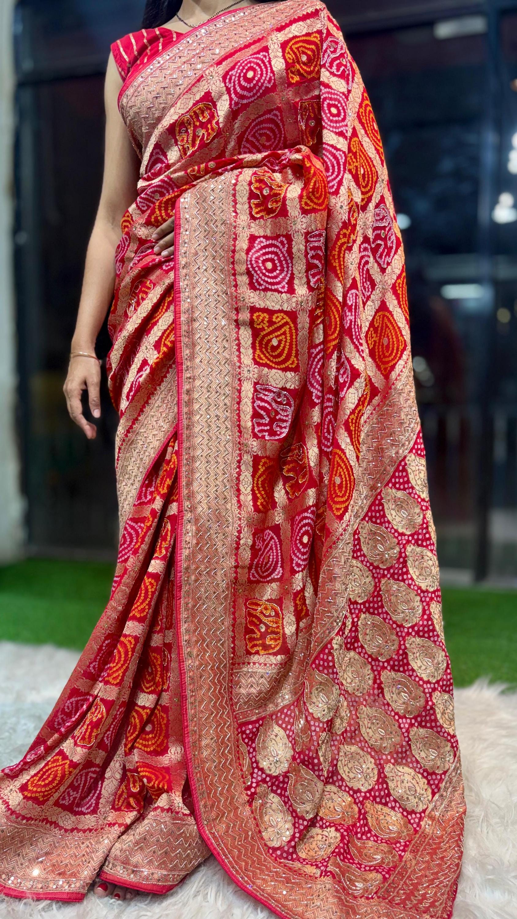 Celebrate timeless tradition and regal elegance with this Red Gharchola Bandhani Saree featuring a Gold Zari Banarasi Weave, specially crafted for Indian brides and festive occasions. Made from premium silk, this saree combines the rich heritage of Banarasi weaving with the intricate Bandhani tie-dye technique, offering a luxurious texture and a graceful drape that enhances your bridal silhouette.