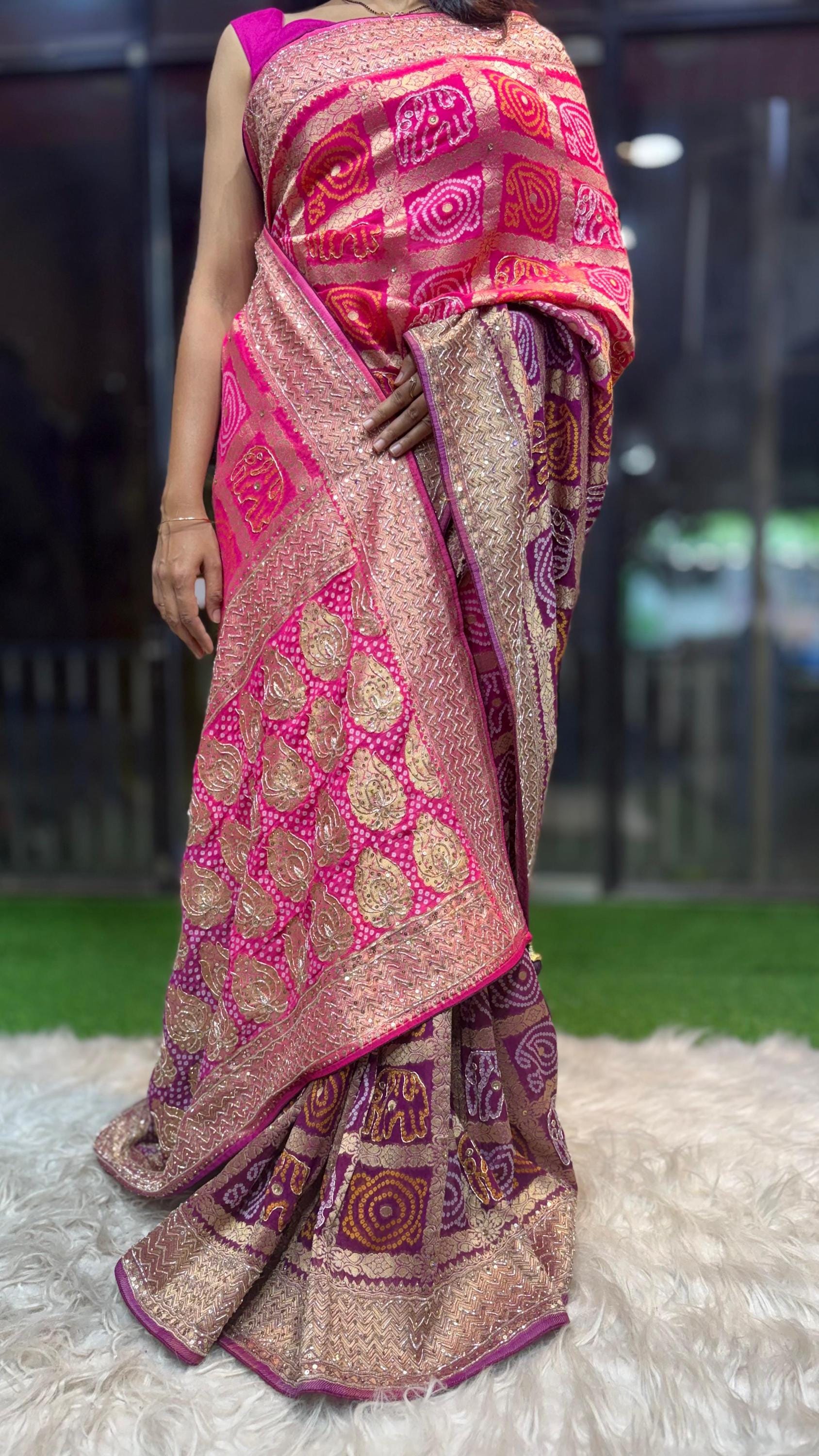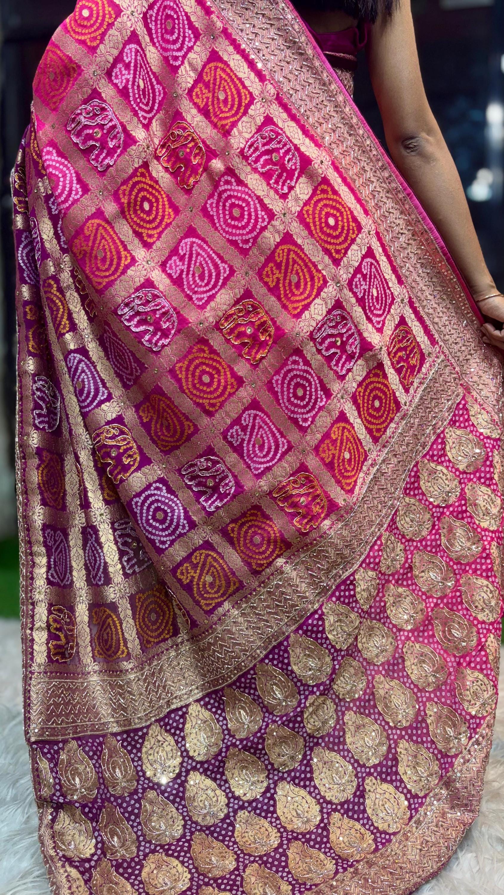 Celebrate vibrant tradition and timeless elegance with this Pink & Purple Ombre Bandhani Saree featuring a Gold Zari Gharchola Weave, crafted for Indian weddings and festive occasions. Made from premium silk or soft fabric, this saree combines the intricate Bandhani tie-dye technique with a luxurious ombre gradient, seamlessly blending pink and purple hues for a striking, celebratory look.