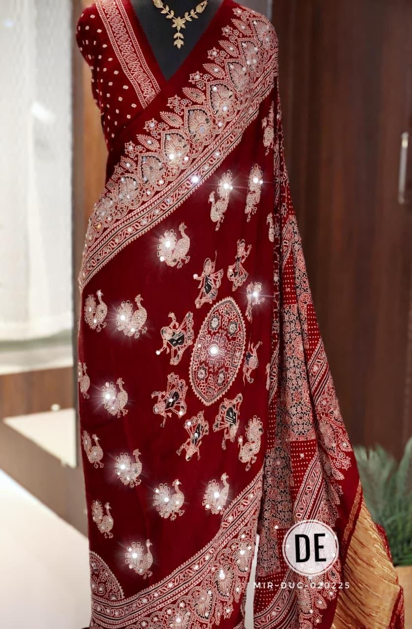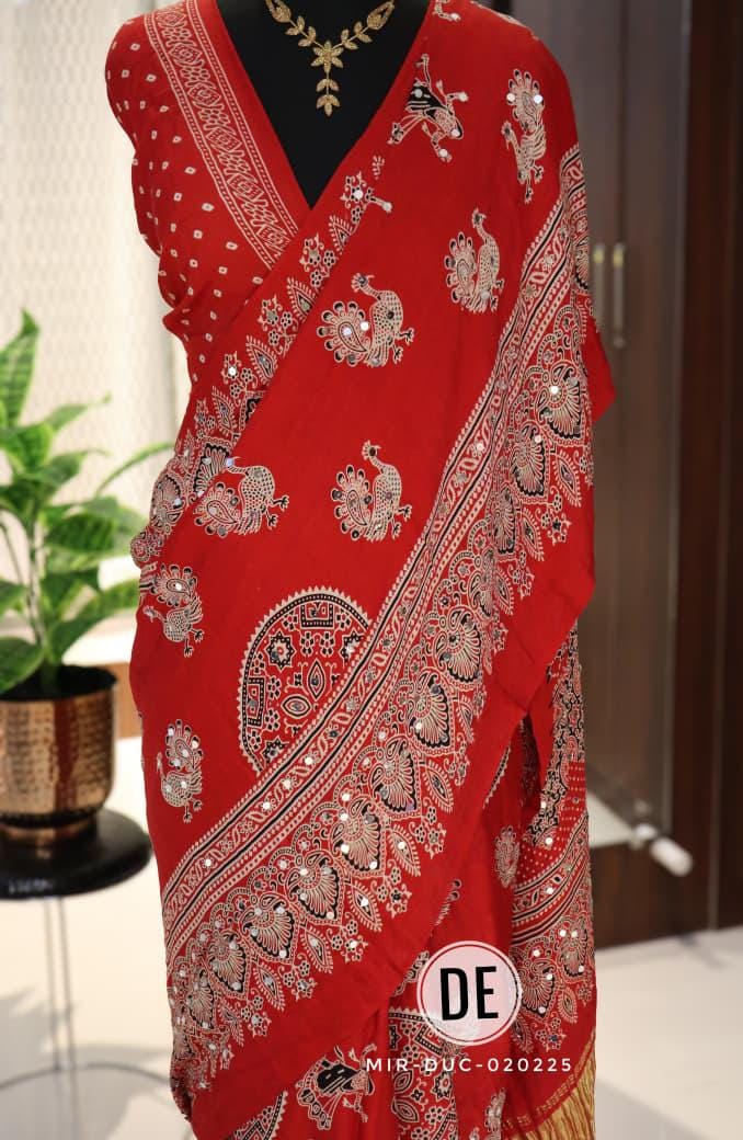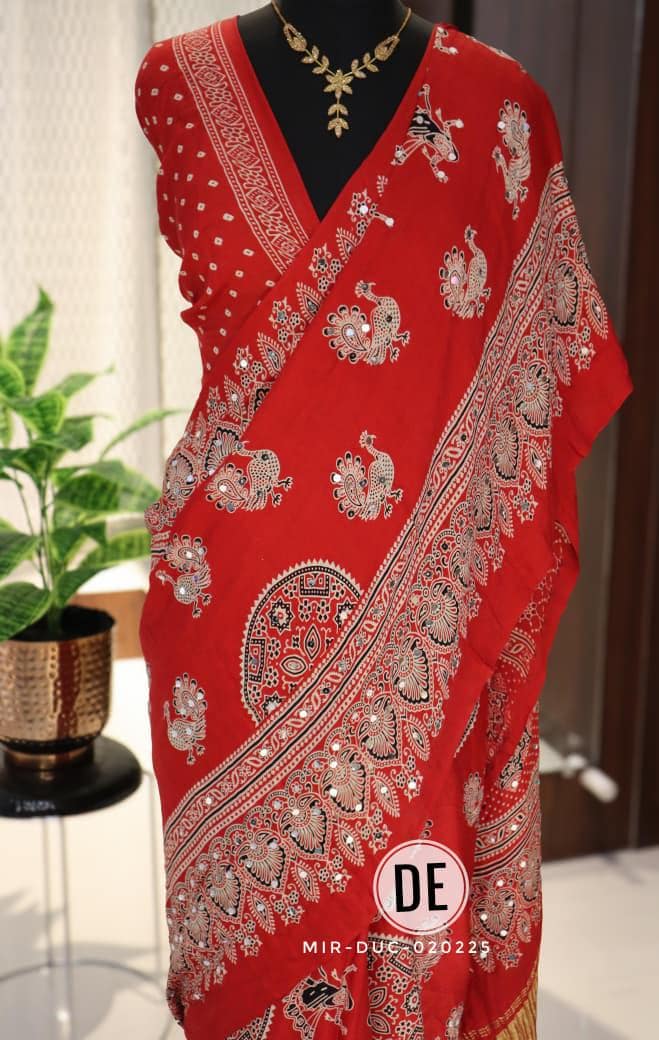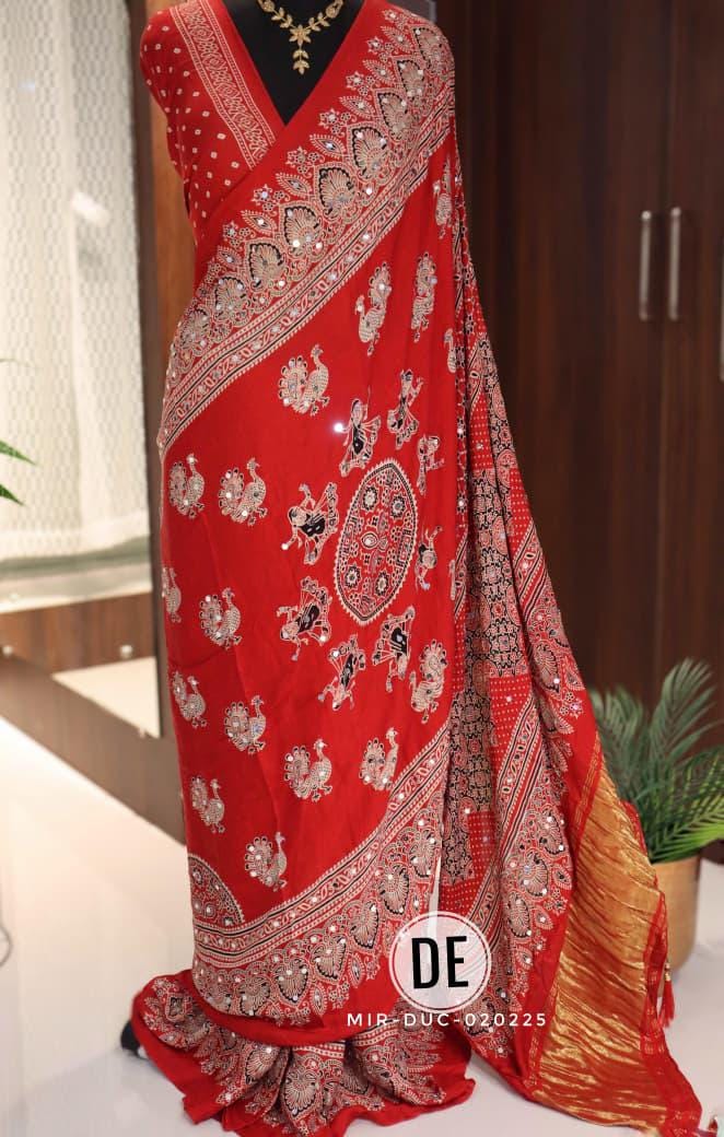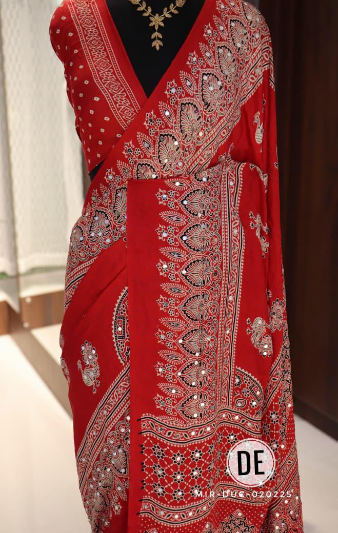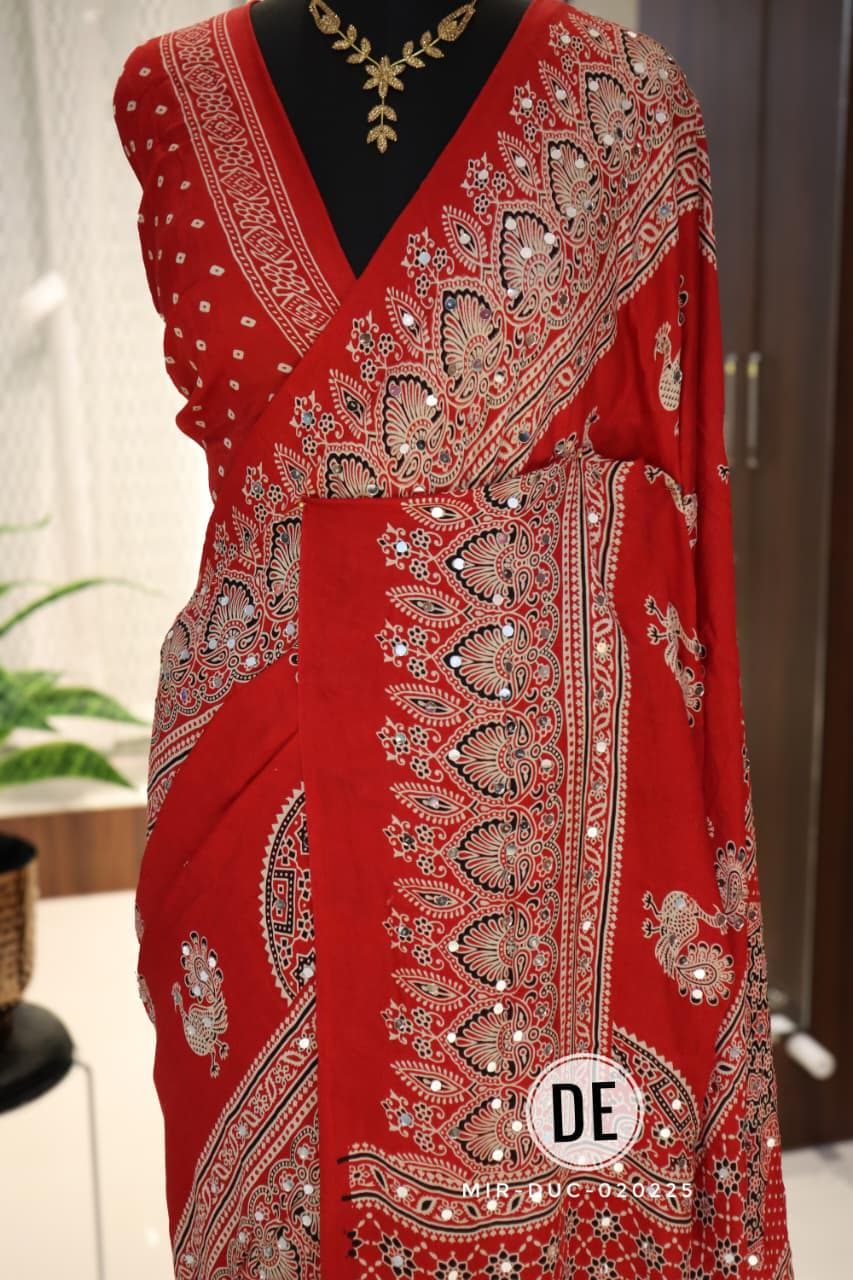 Celebrate the spirit of tradition and festive vibrance with this Red Mirror Work Saree featuring Traditional Gujarati Peacock Print and a Gold Tissue Pallu, designed for Navratri and special cultural occasions. Crafted from premium fabric, this saree combines intricate mirror embellishments with heritage-inspired peacock motifs, reflecting the rich artistry of Gujarati textile traditions.