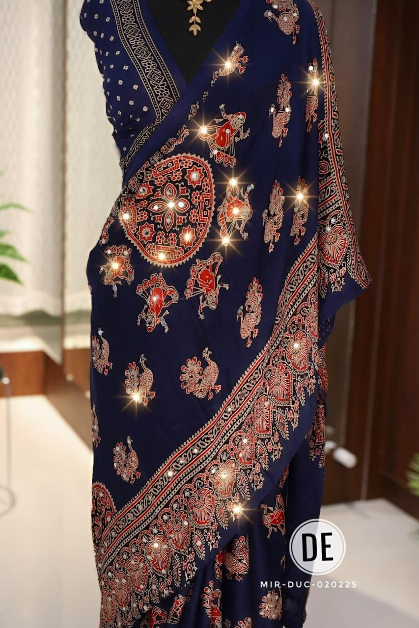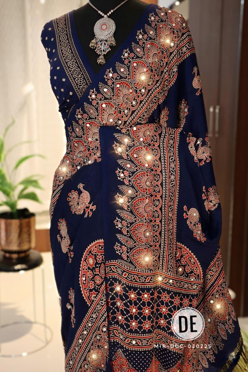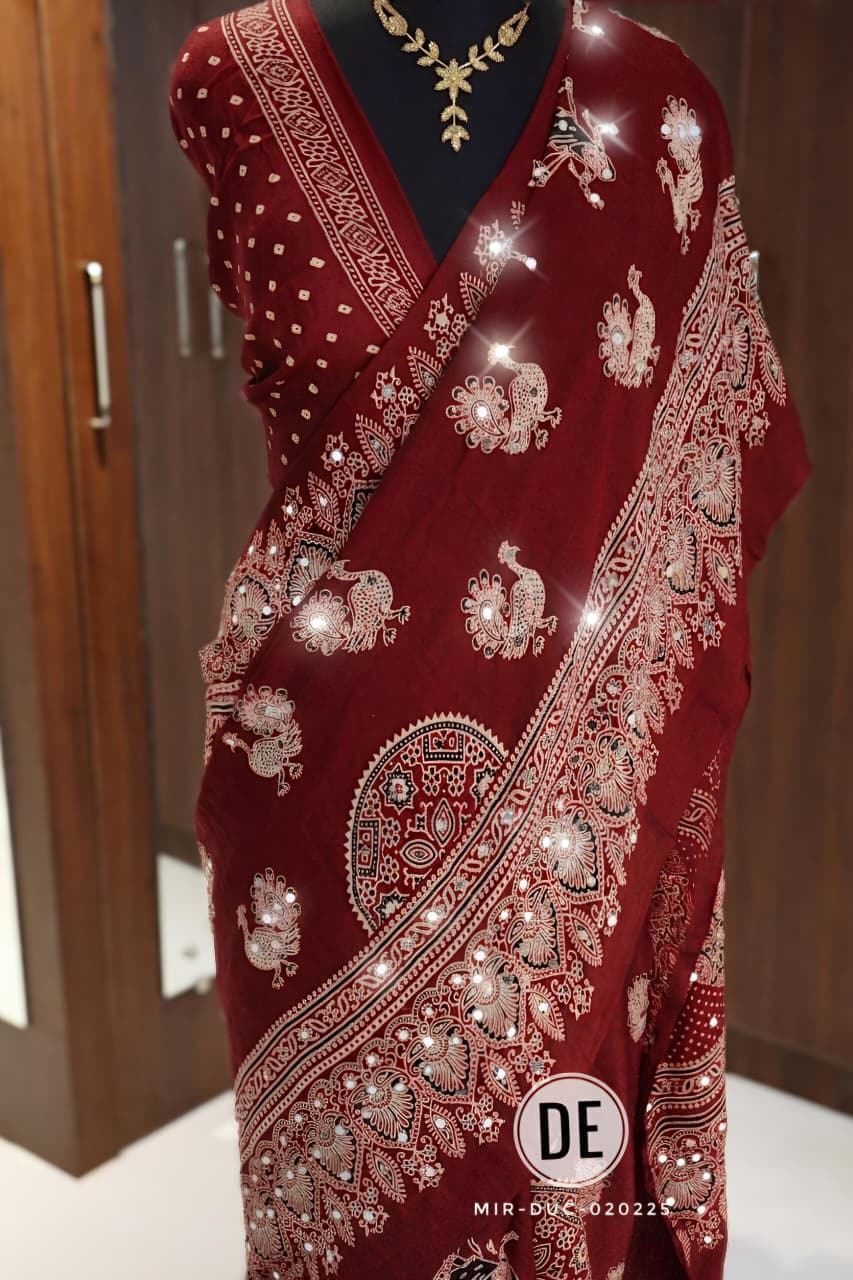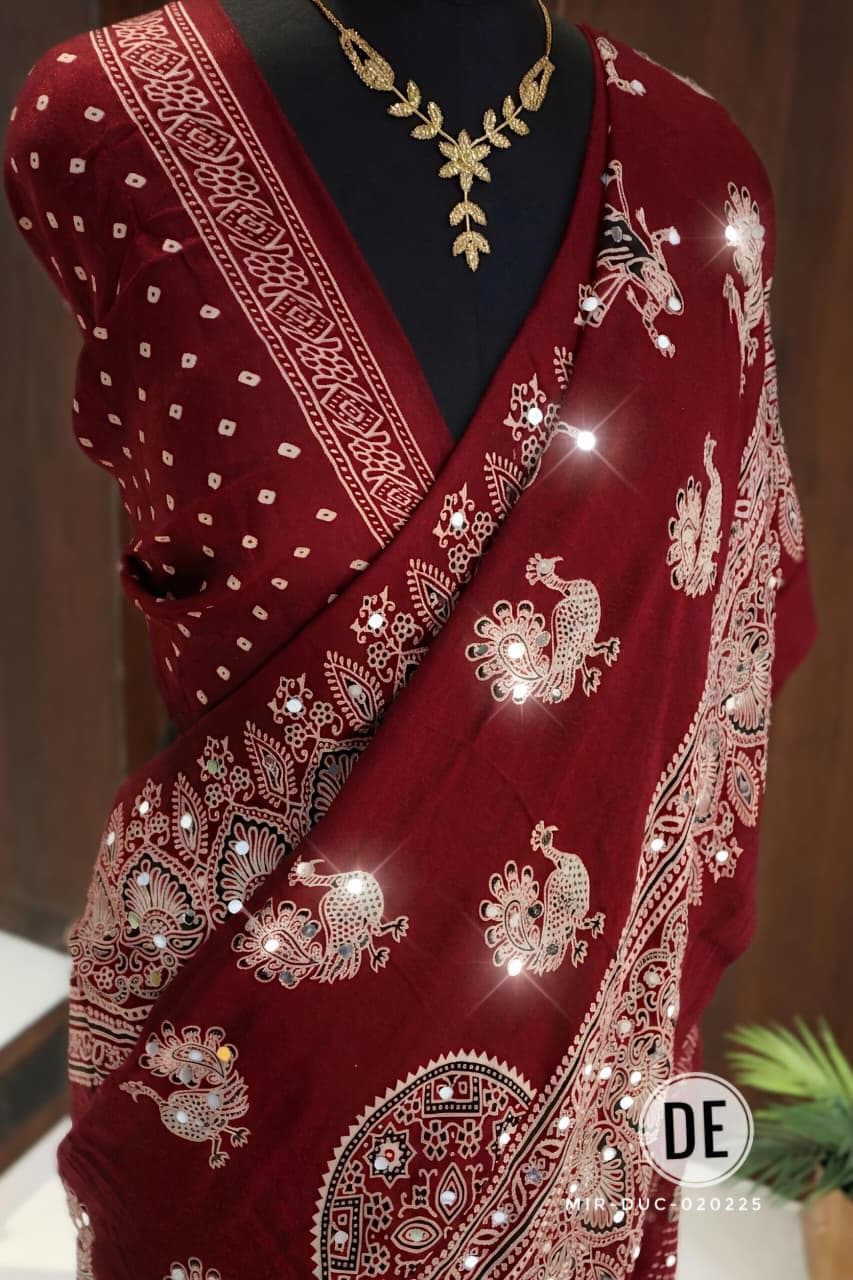 Celebrate the spirit of tradition and festive vibrance with this Red Mirror Work Saree featuring Traditional Gujarati Peacock Print and a Gold Tissue Pallu, designed for Navratri and special cultural occasions. Crafted from premium fabric, this saree combines intricate mirror embellishments with heritage-inspired peacock motifs, reflecting the rich artistry of Gujarati textile traditions.