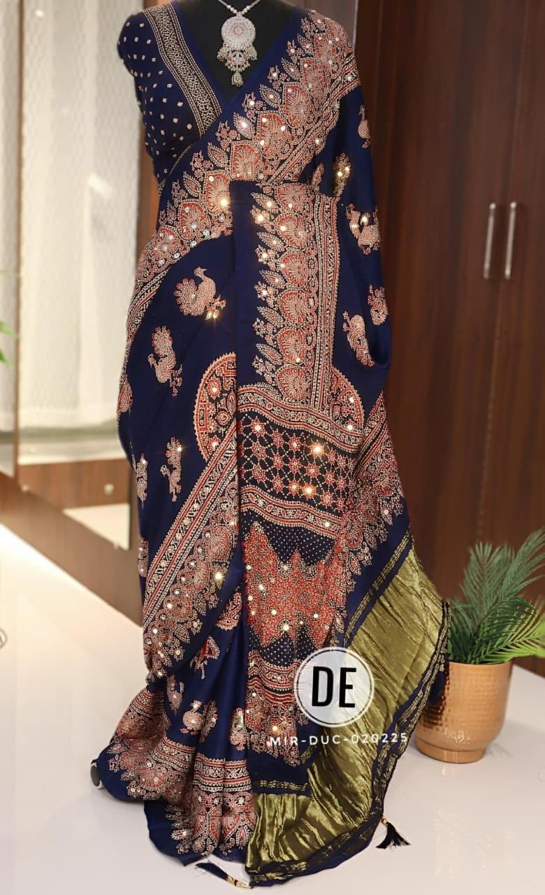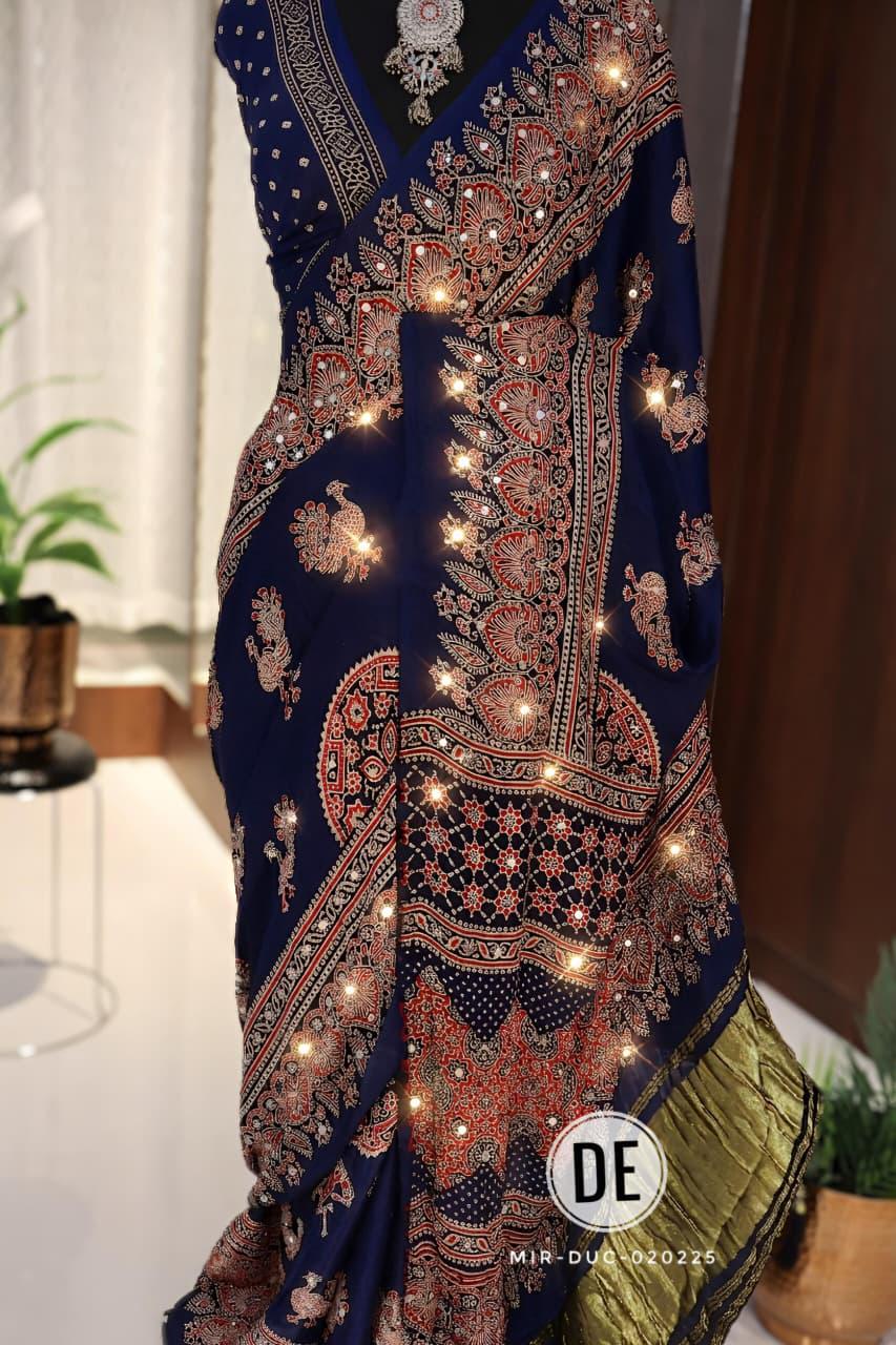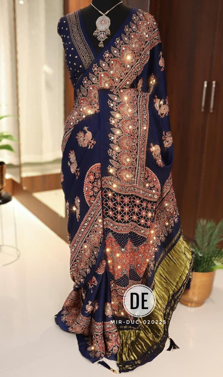 Lightweight yet elegant, this saree drapes effortlessly, providing comfort and ease of movement for long hours of celebration. Pair it with traditional jewelry, jhumkas, and embroidered footwear for a complete festive ensemble. Ideal for Navratri, Diwali, and cultural events, this saree is a perfect blend of heritage craftsmanship, vibrant color, and contemporary style, ensuring you make a statement wherever you go.