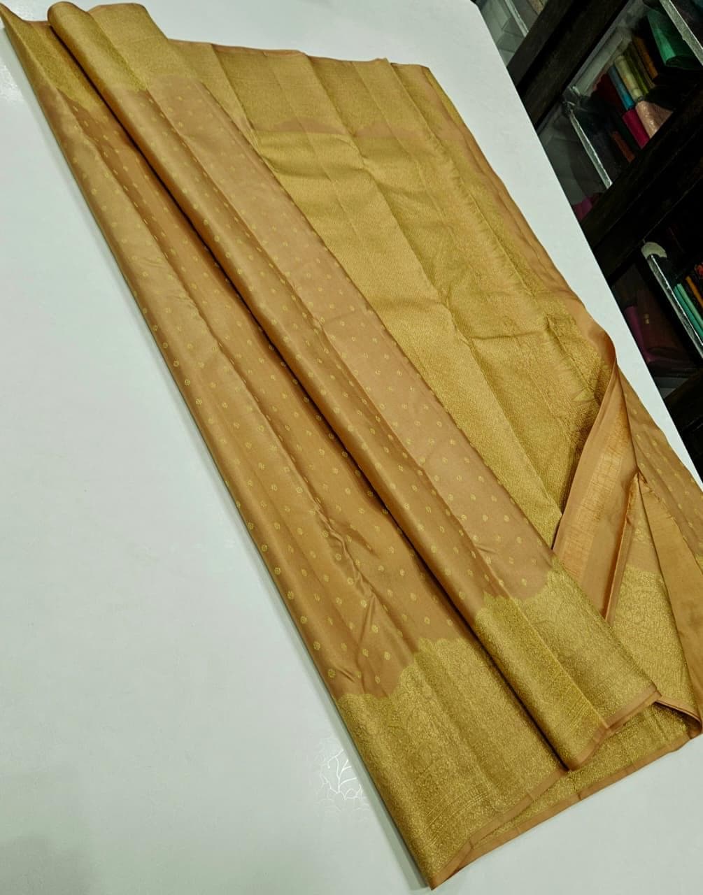 The brocade weaving across the saree features delicate traditional patterns that lend depth and dimension to the fabric without overpowering its soft color. The pallu is richly designed with elaborate zari detailing, complementing the border and adding a grand finishing touch to the overall look.