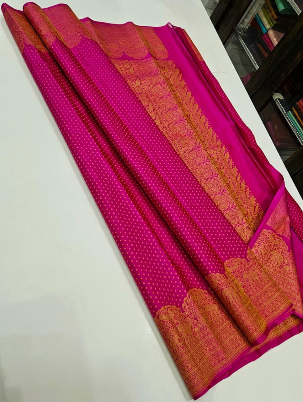 What truly sets this saree apart is its striking magenta pink floral border, which adds a bold and beautiful contrast to the pastel body. The border is intricately woven with traditional floral motifs in fine zari work, creating a harmonious balance between vibrancy and elegance. The detailed craftsmanship showcases the artistry of skilled weavers, making every inch of the saree visually captivating.