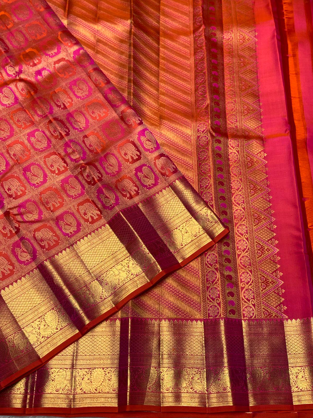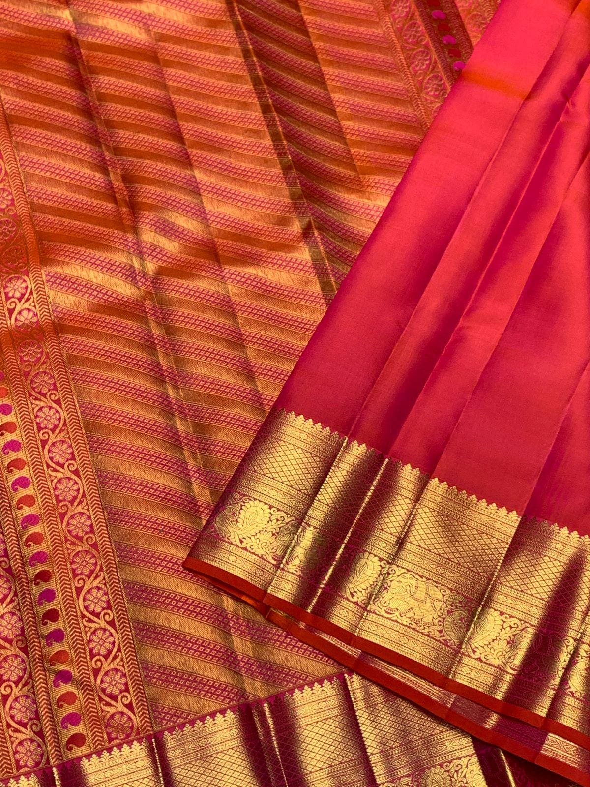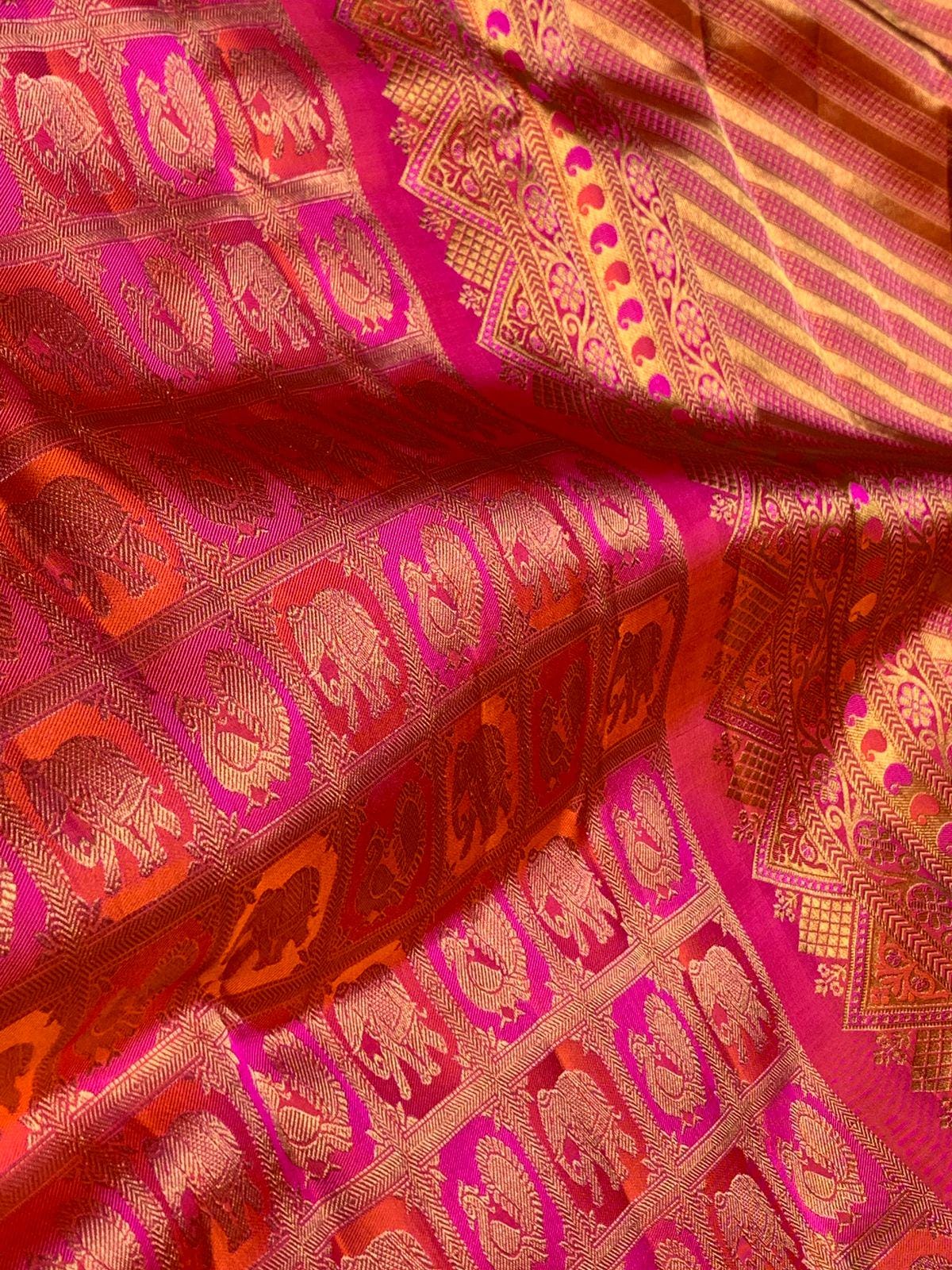 What truly sets this saree apart is its striking magenta pink floral border, which adds a bold and beautiful contrast to the pastel body. The border is intricately woven with traditional floral motifs in fine zari work, creating a harmonious balance between vibrancy and elegance. The detailed craftsmanship showcases the artistry of skilled weavers, making every inch of the saree visually captivating.