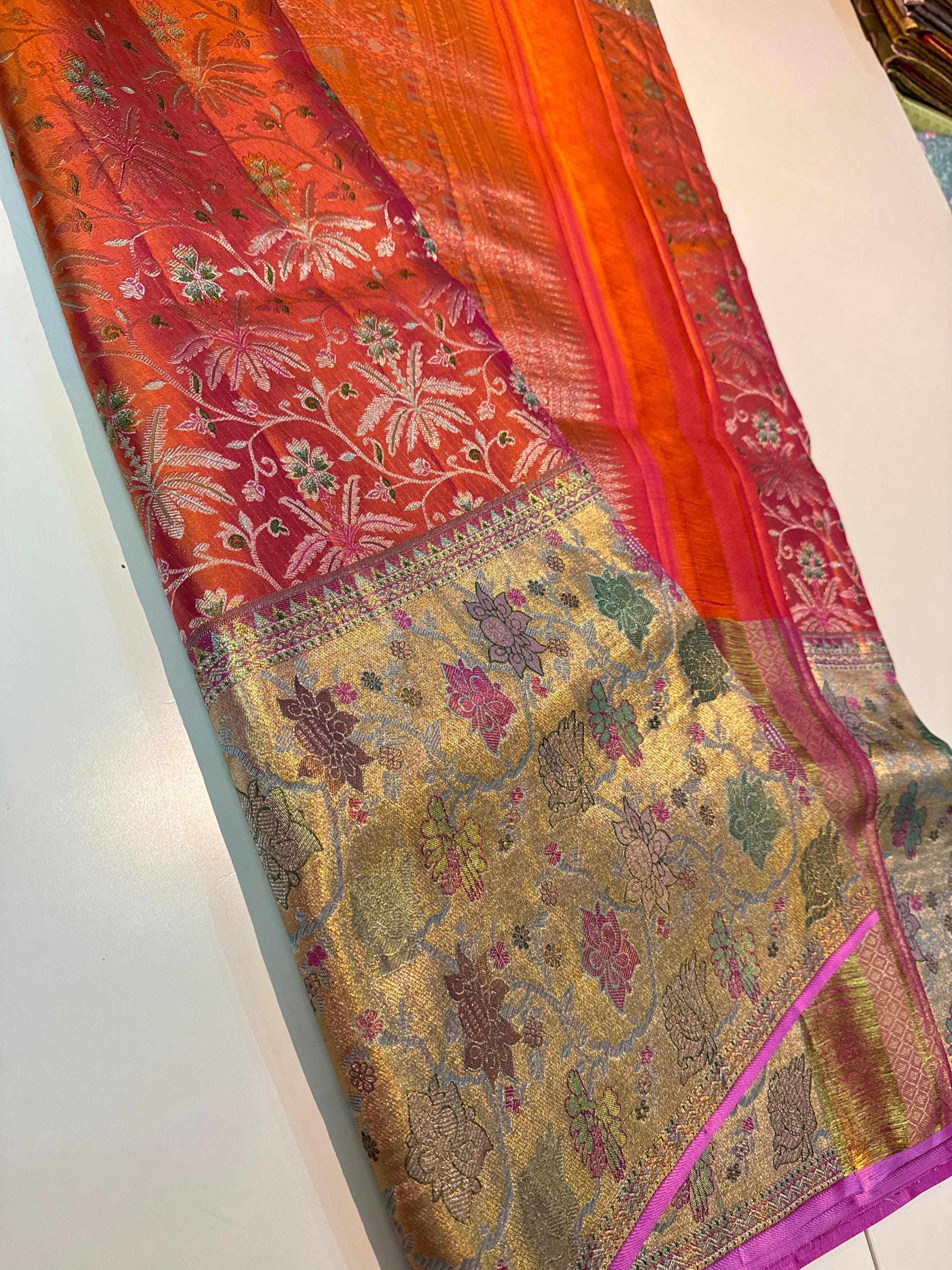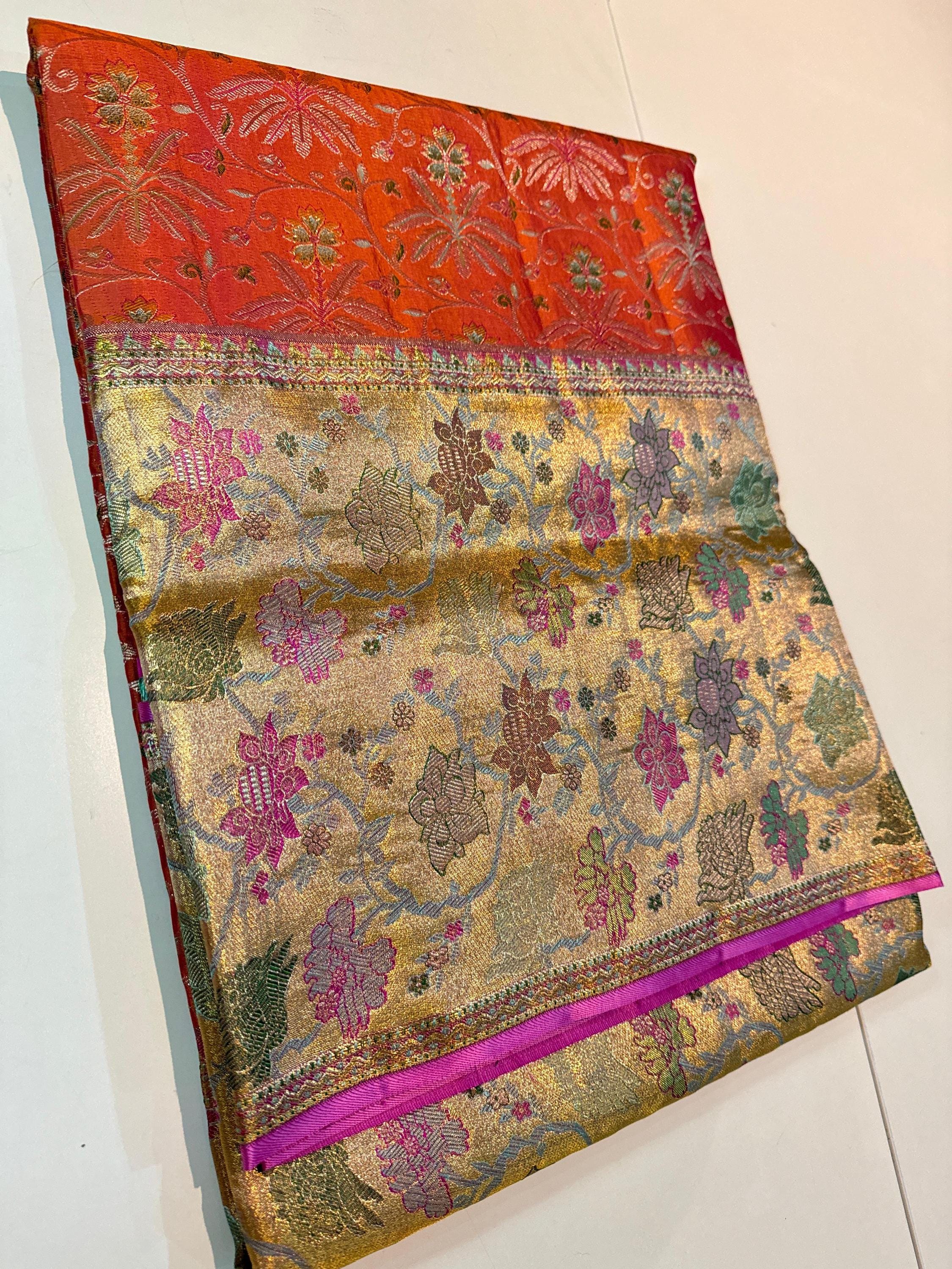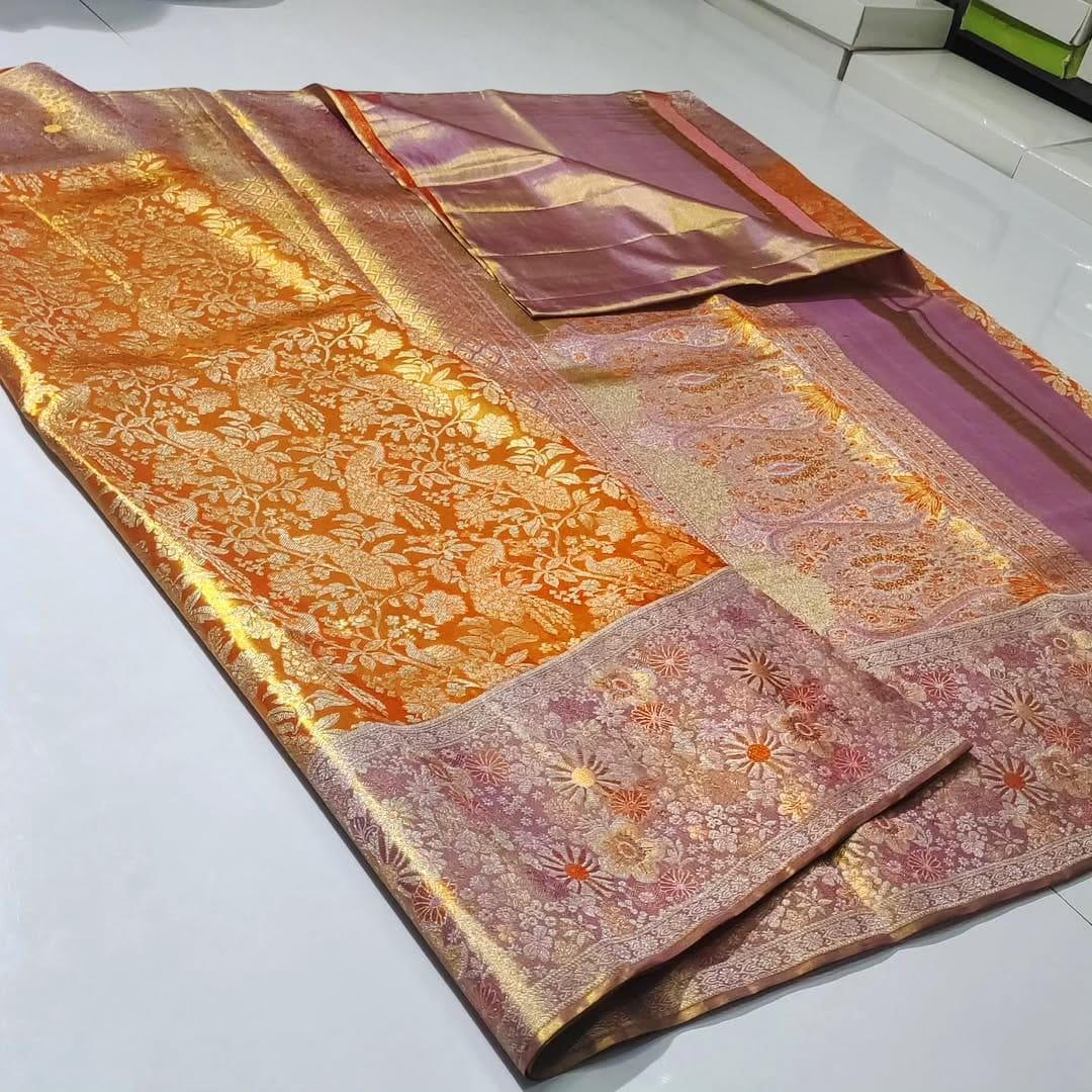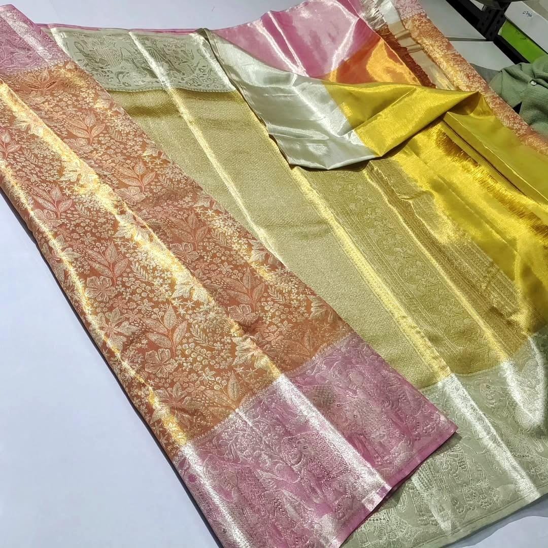 Pastel Tissue Silk Saree with Silver Zari Floral Brocade & Metallic Border