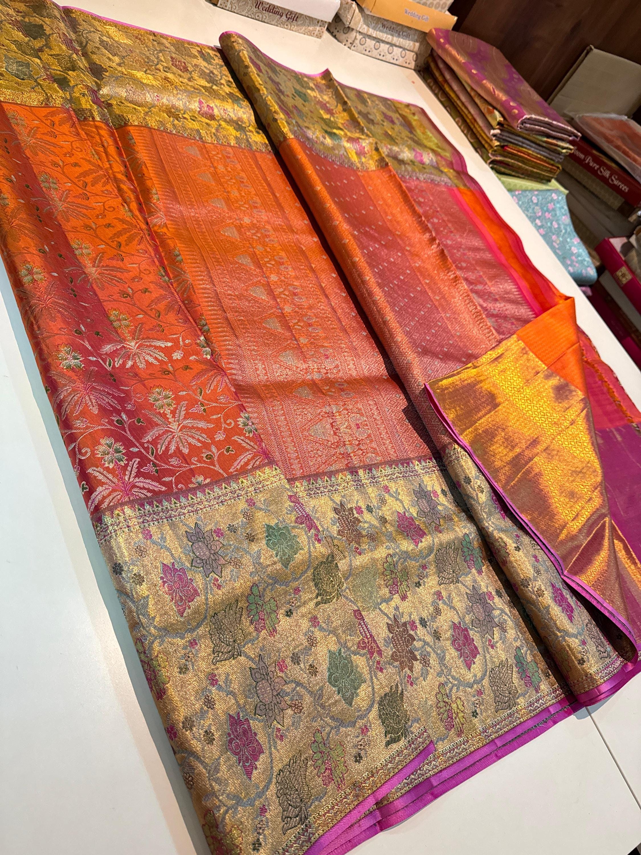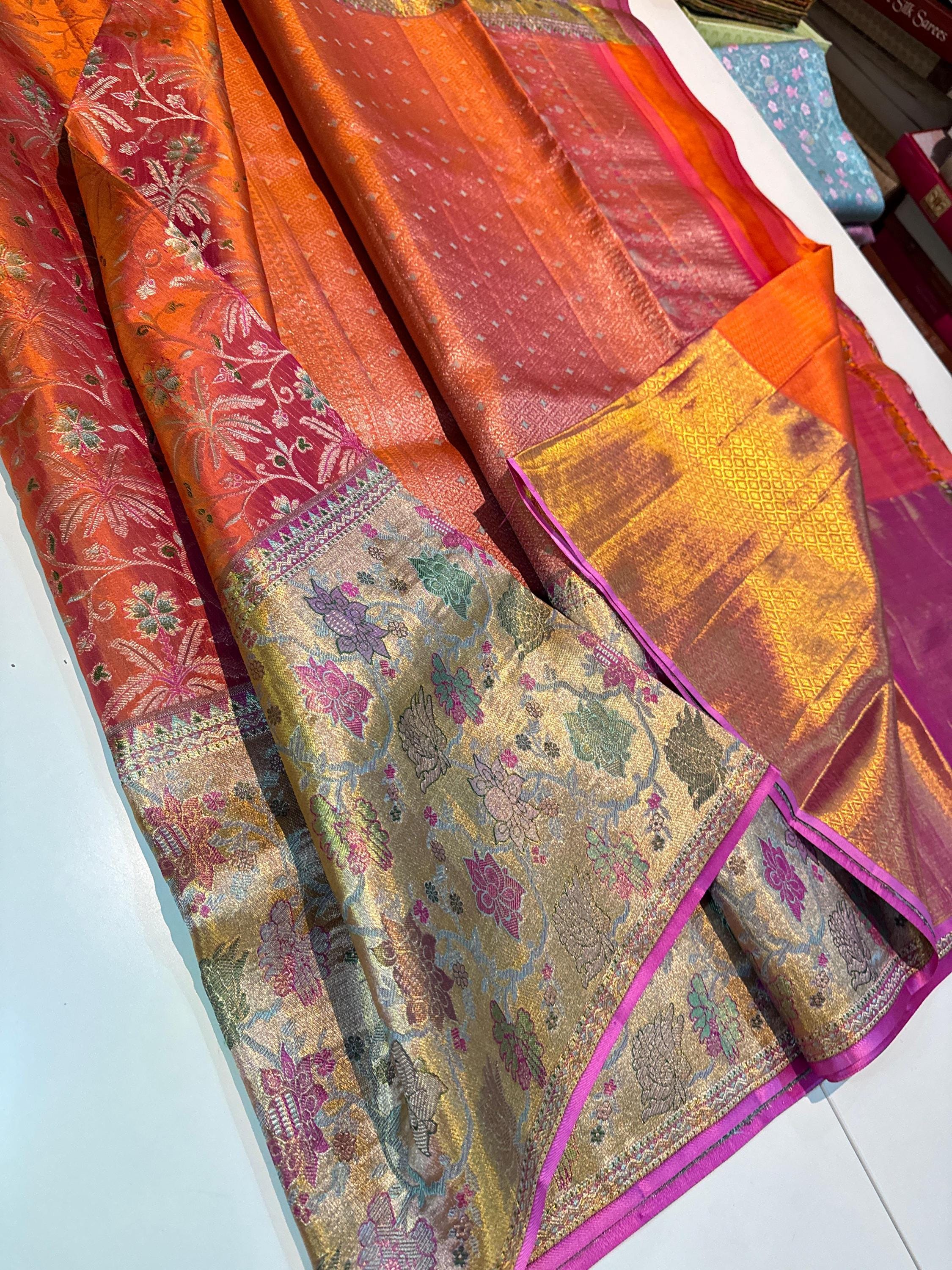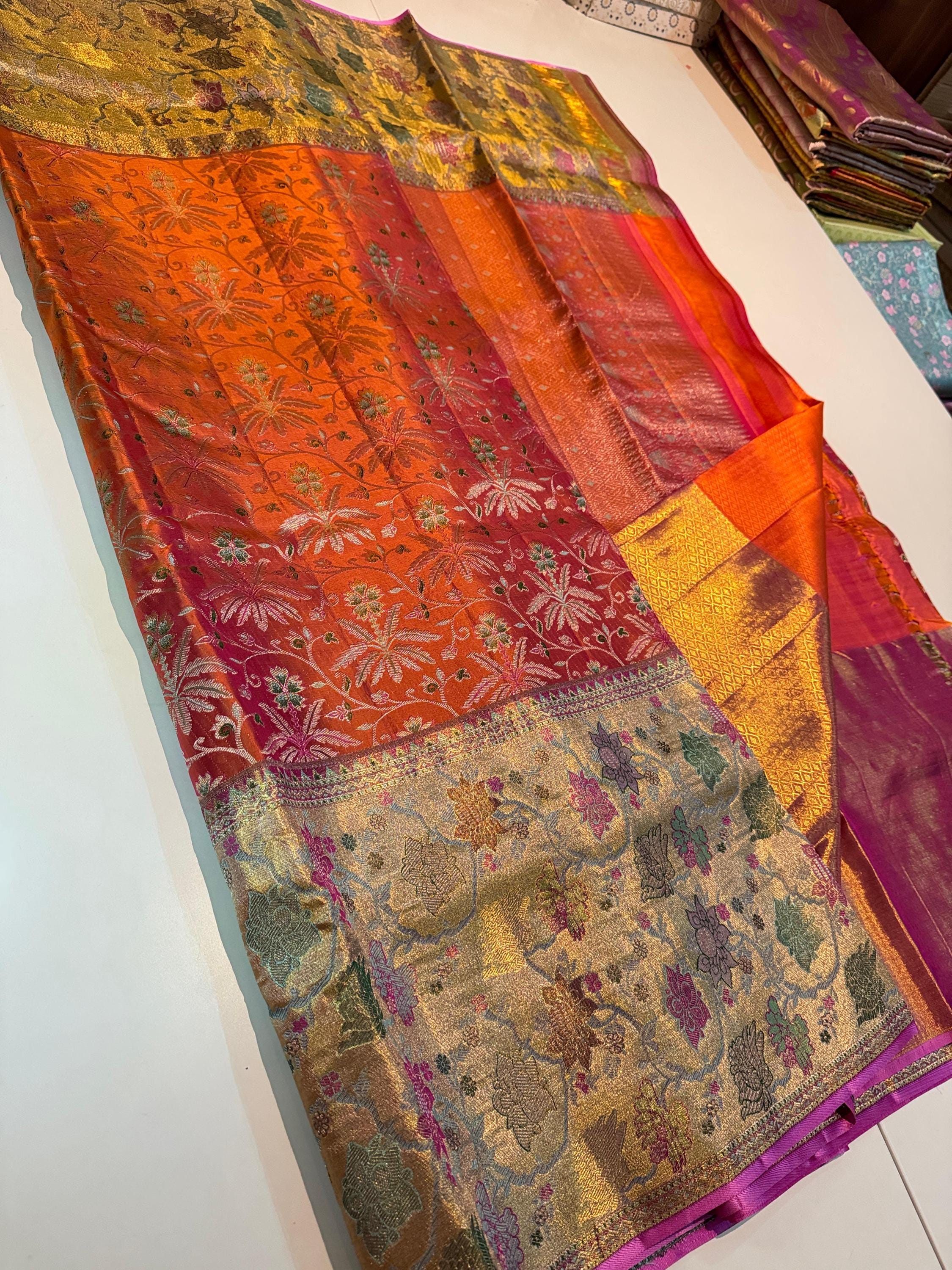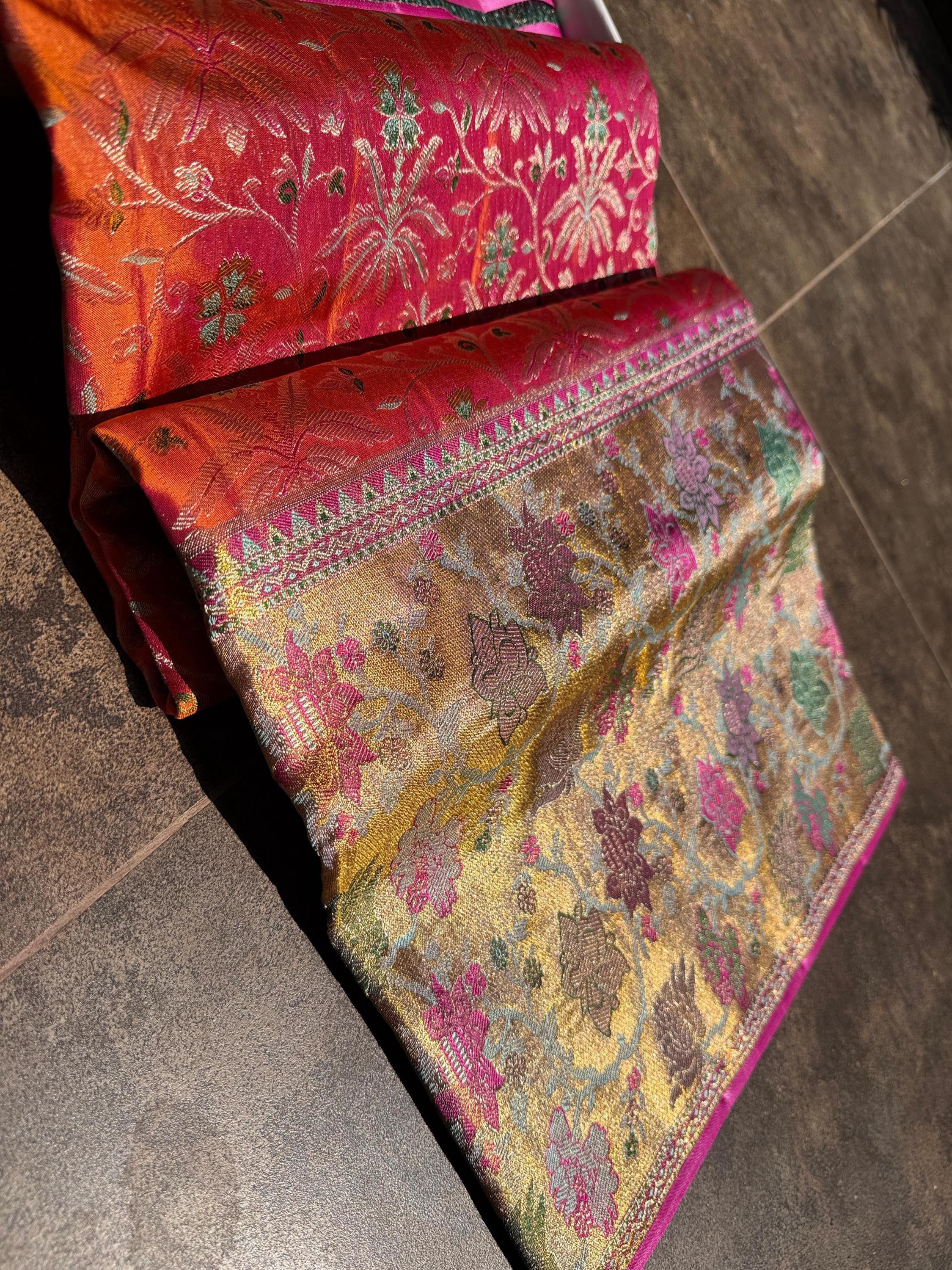Pastel Tissue Silk Saree with Silver Zari Floral Brocade & Metallic Border
