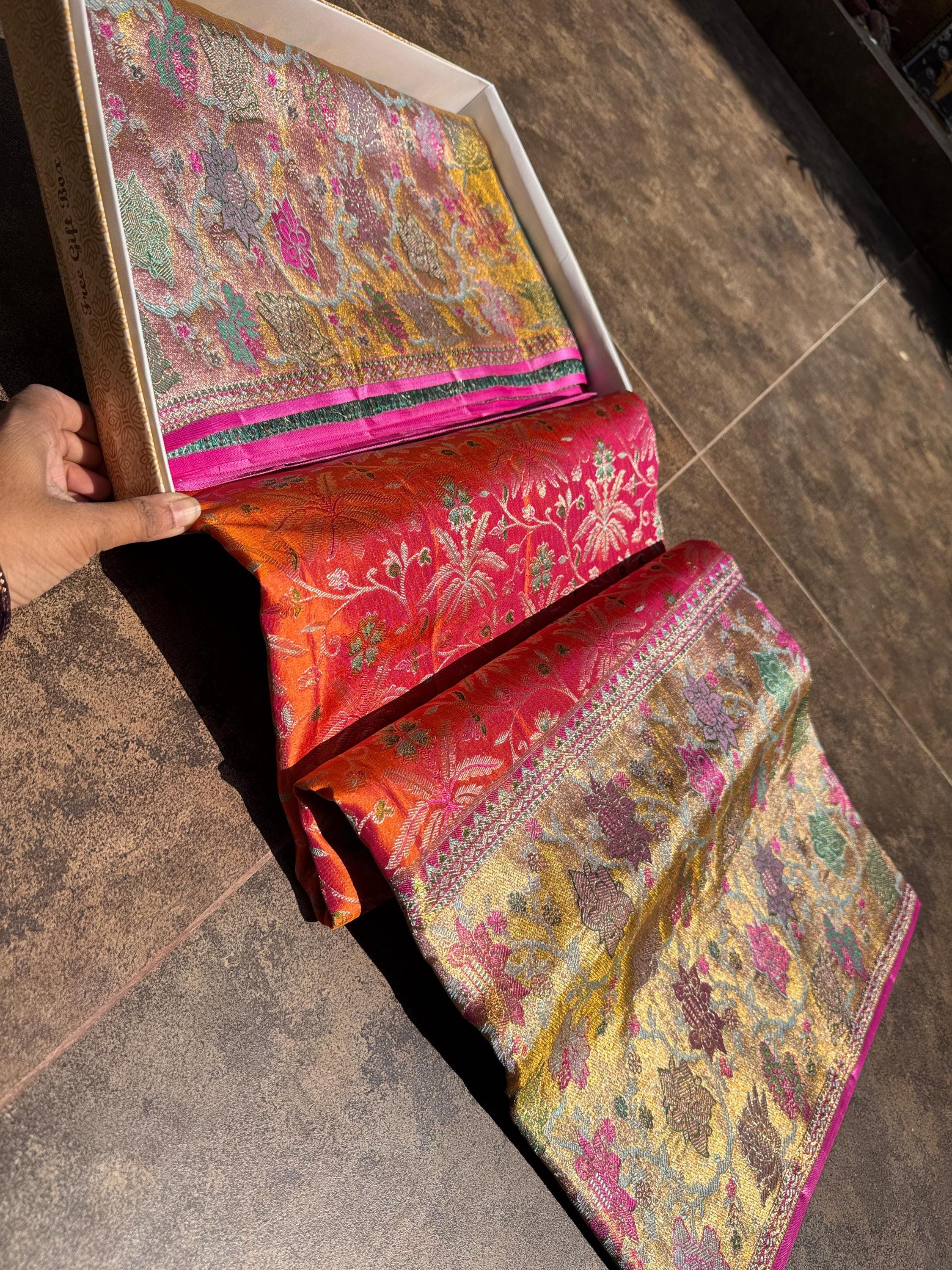 Golden Yellow Banarasi Silk Saree with Pastel Pink Silver Zari Border