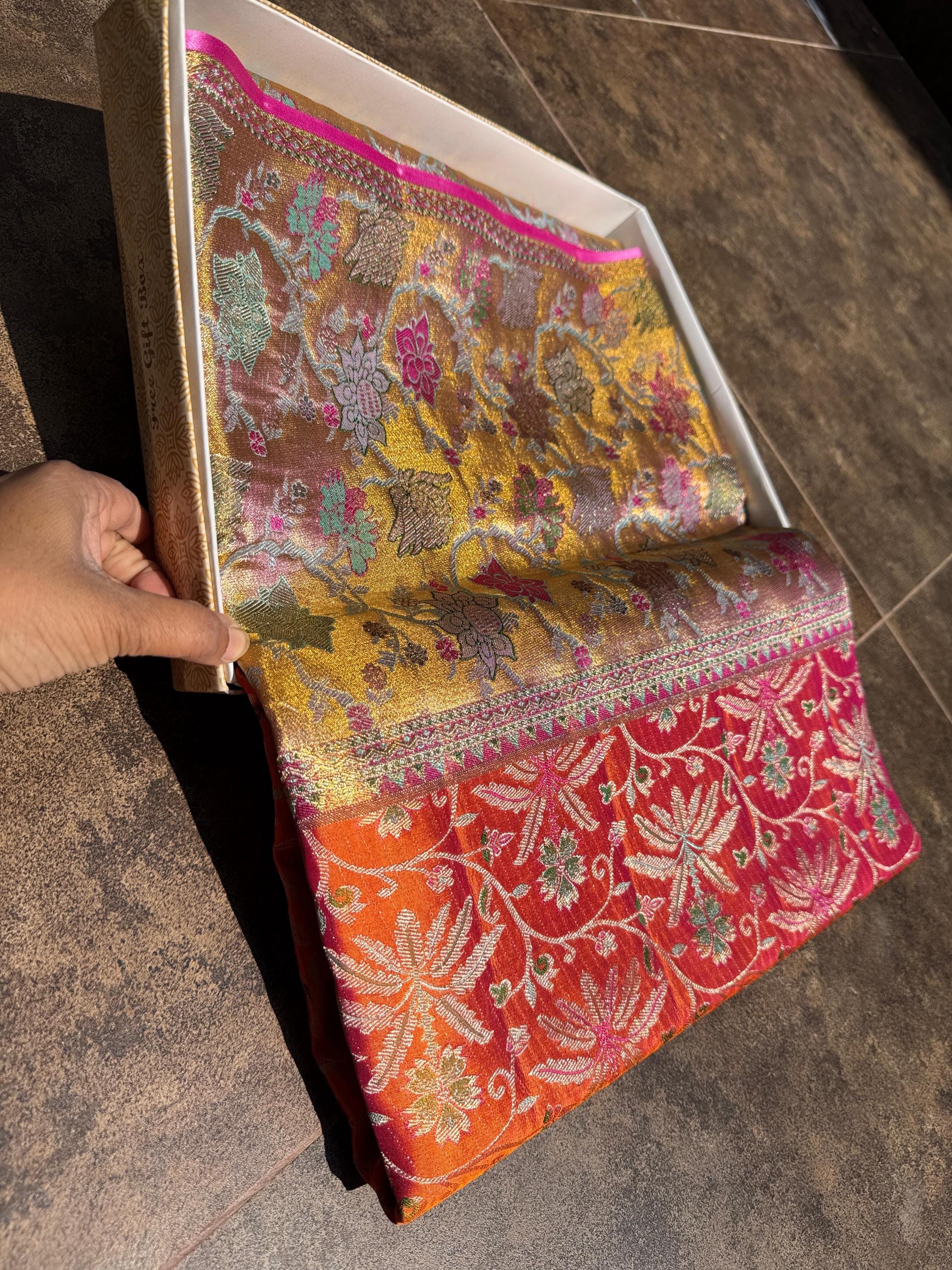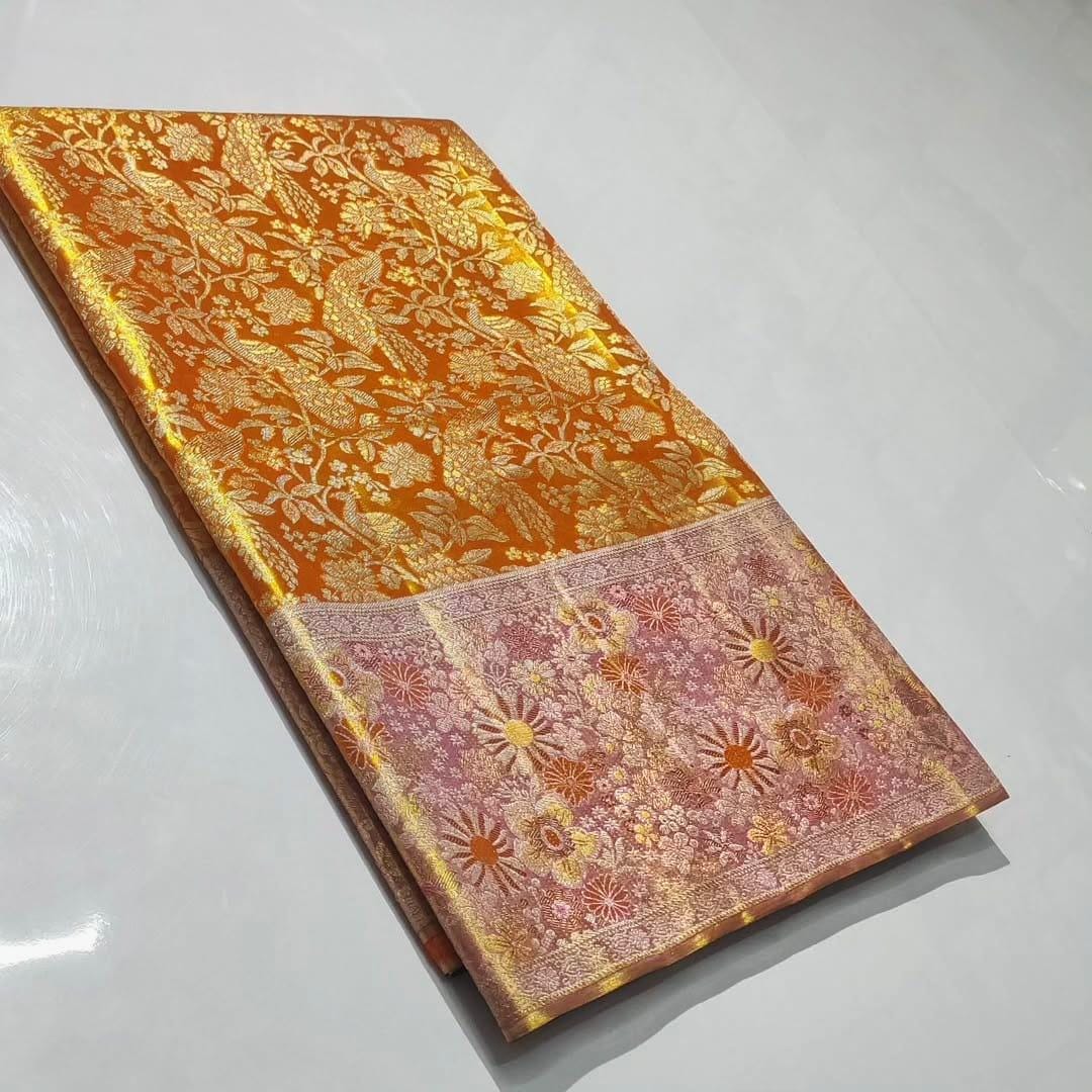 Step into elegance with this radiant golden yellow Banarasi silk saree, designed to capture the essence of timeless Indian craftsmanship. The rich tissue brocade weave is adorned with graceful peacock motifs, symbolizing beauty and prosperity, adding depth and artistry to the fabric.