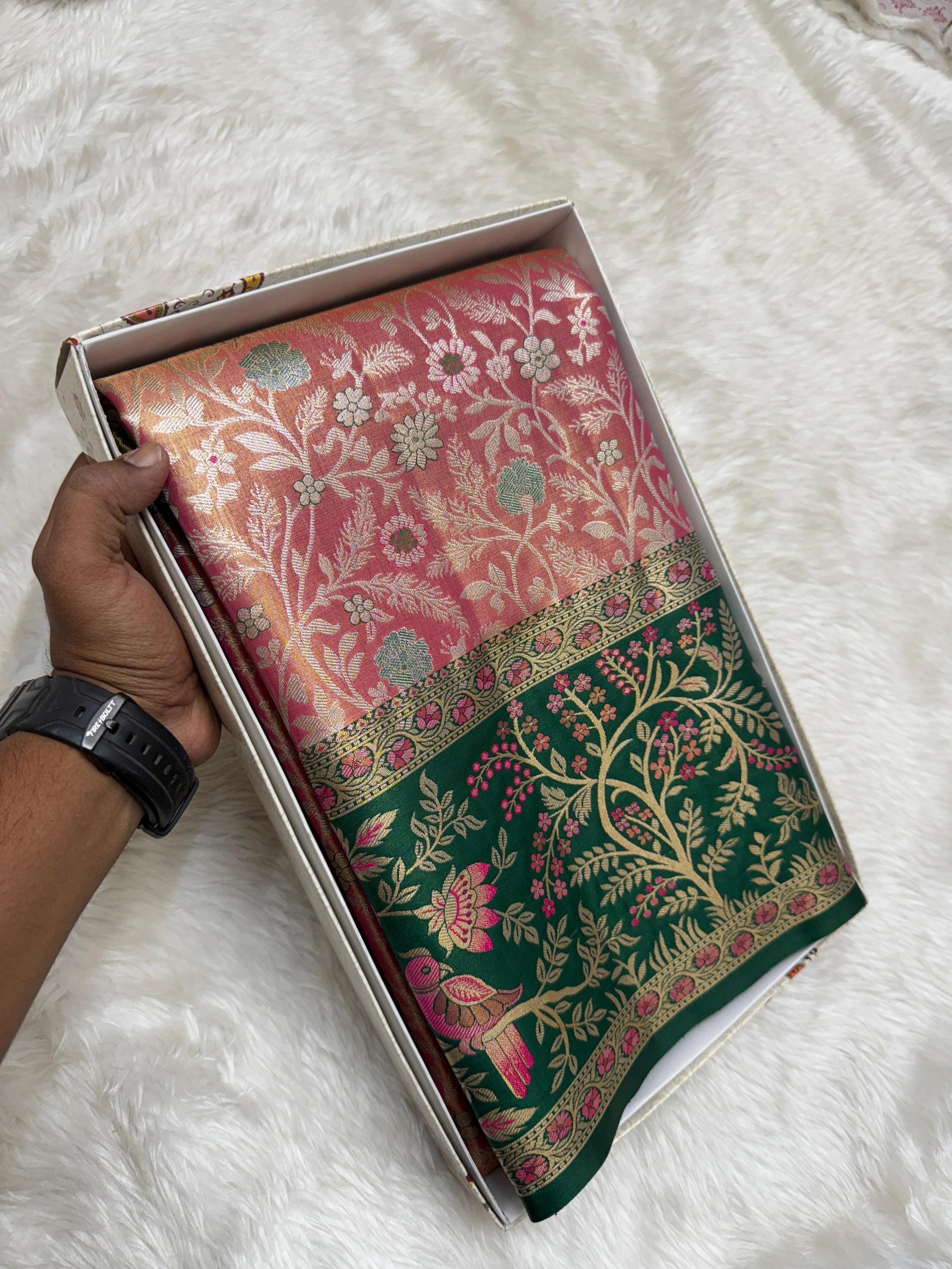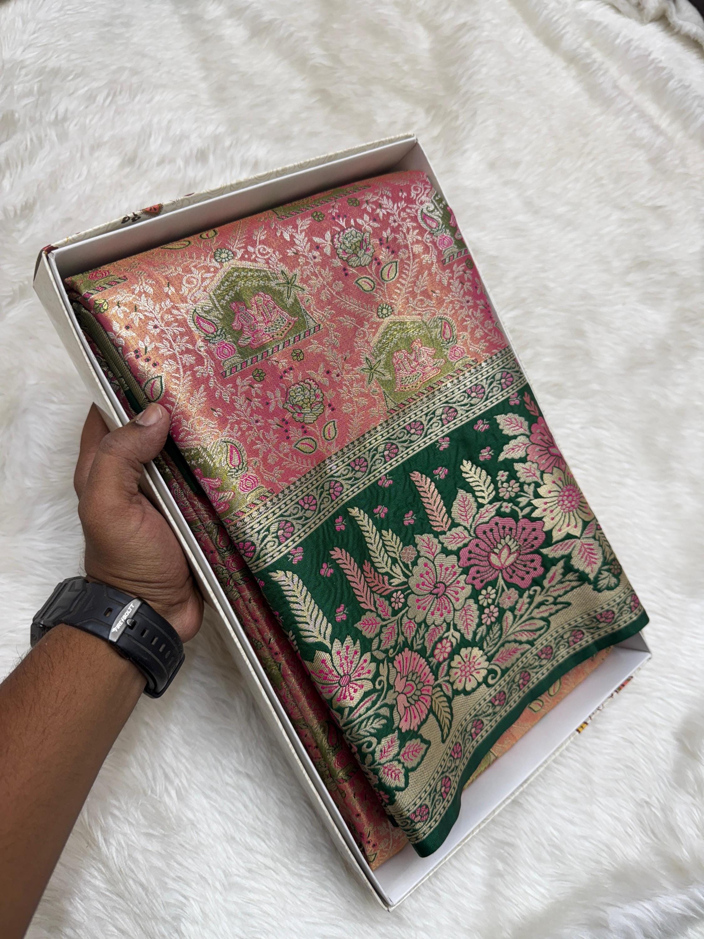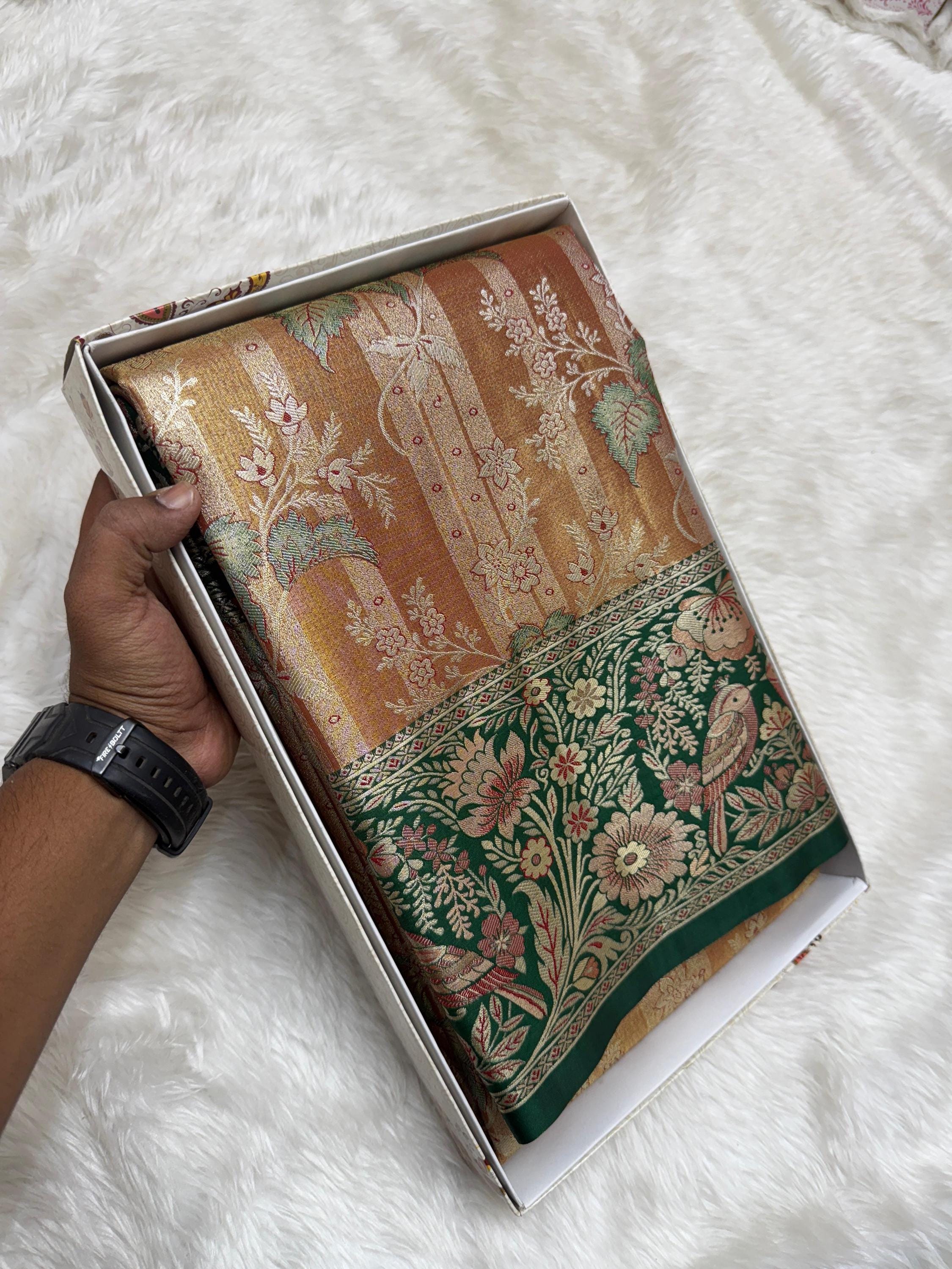 Copper Gold Banarasi Silk Saree with Green Meenakari Floral Border
