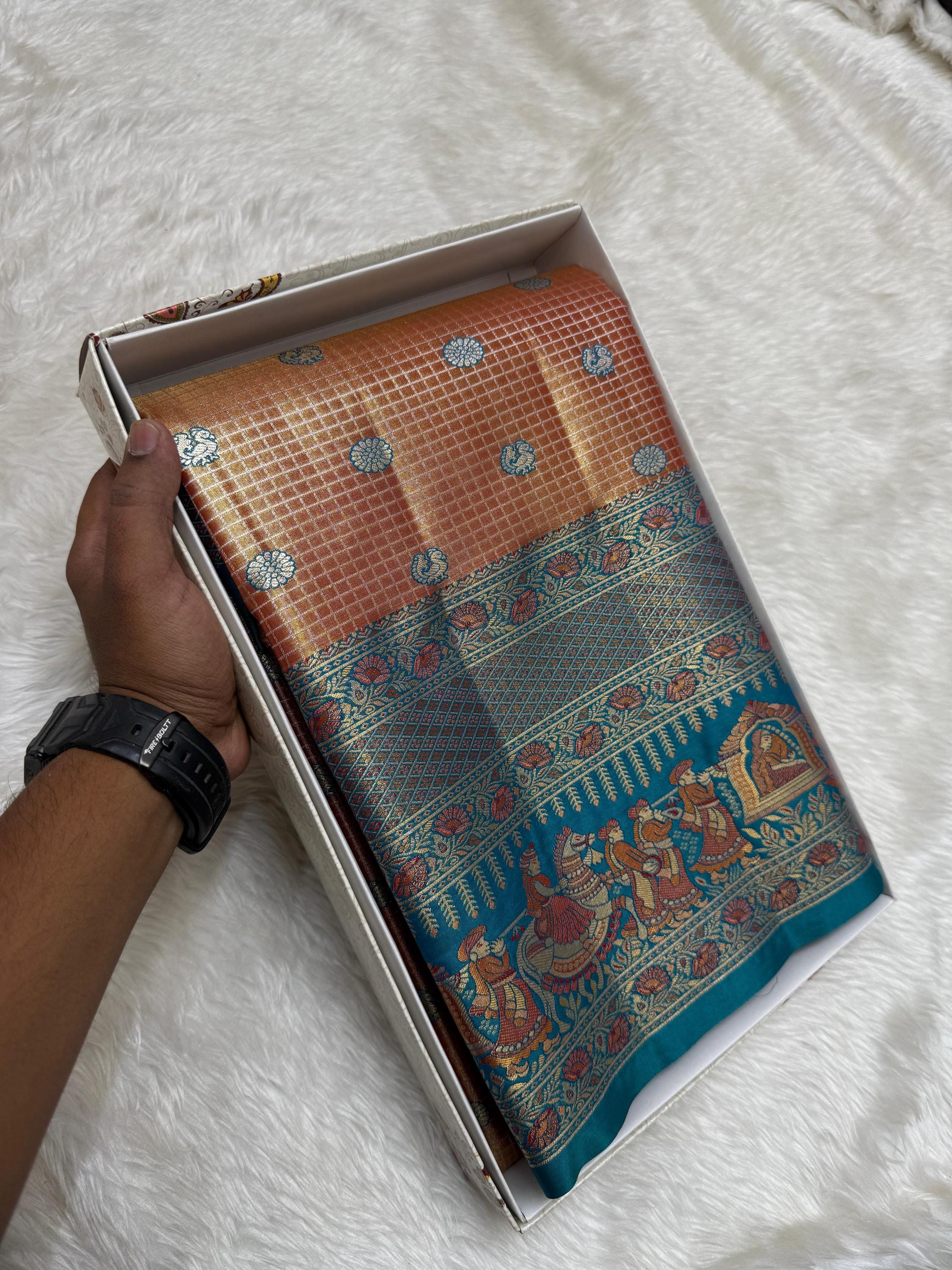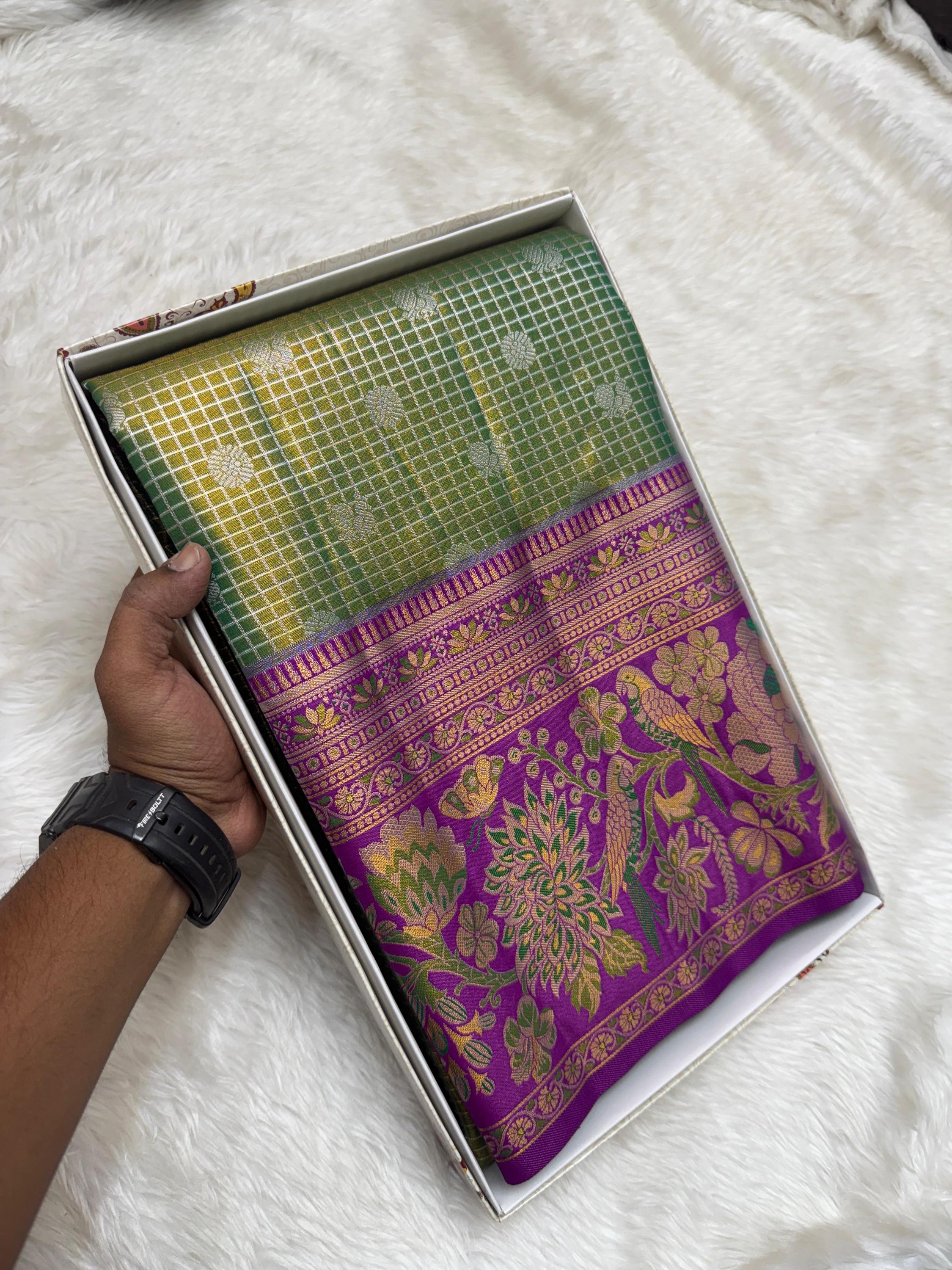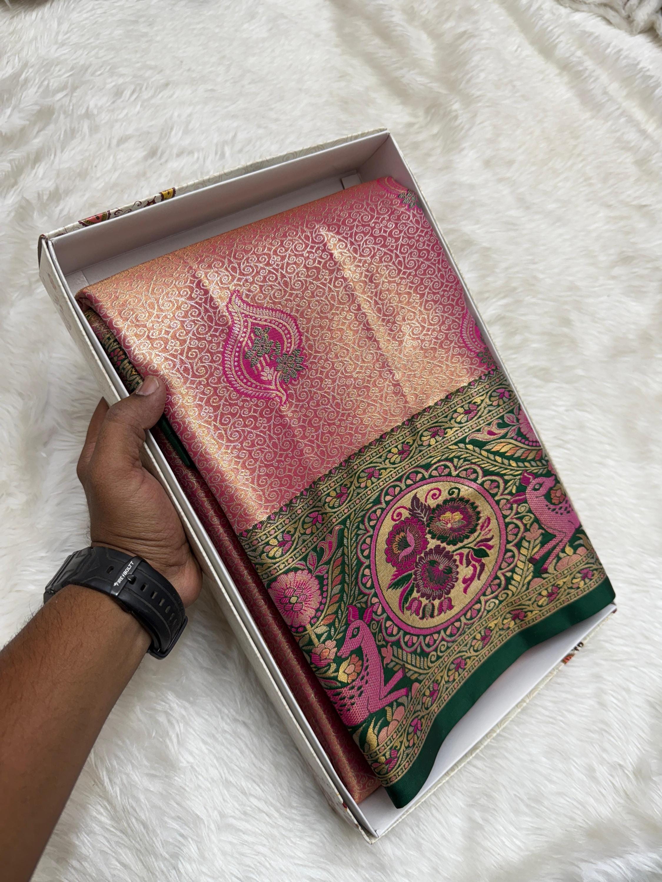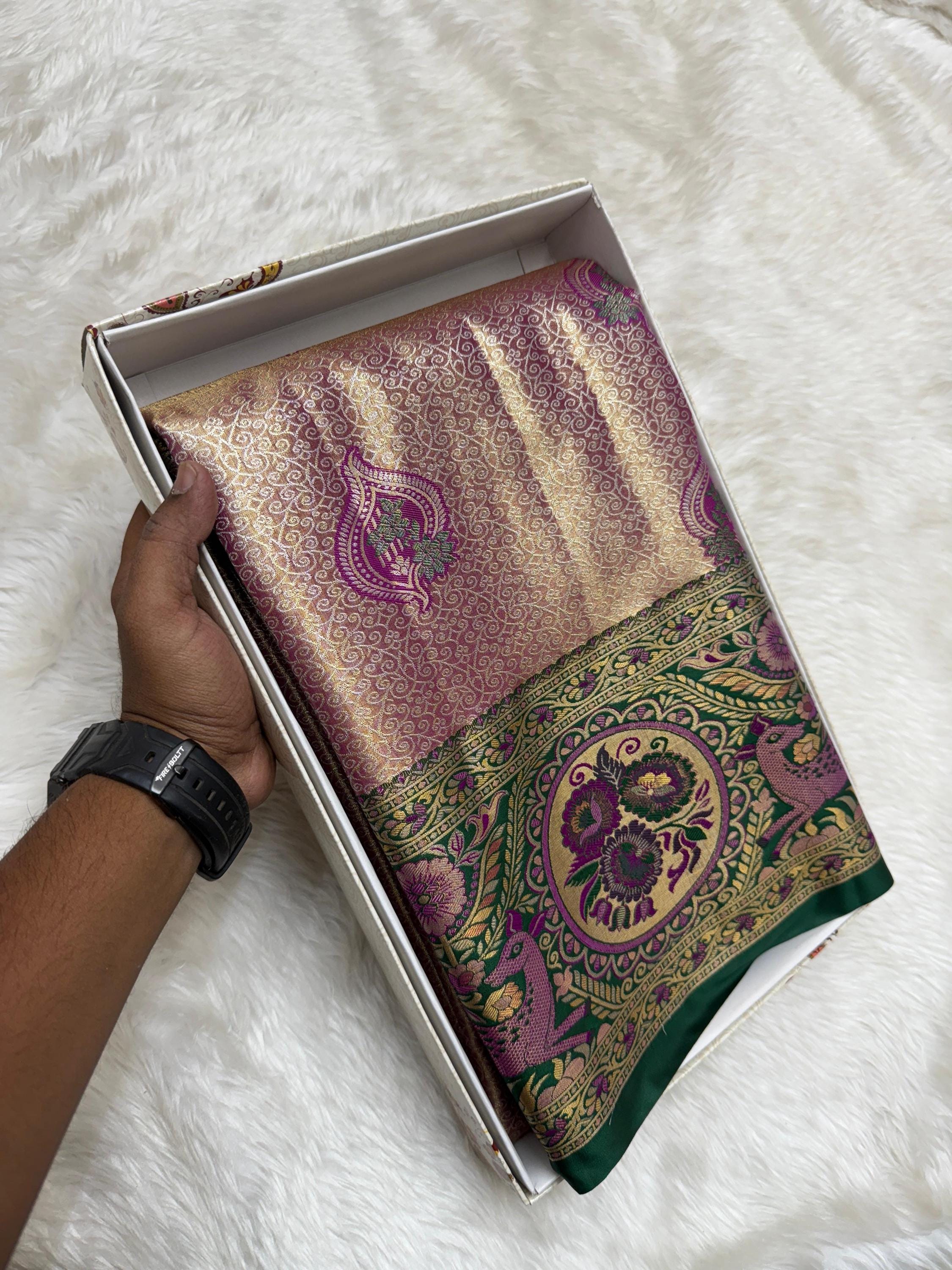 Copper Gold Banarasi Silk Saree with Green Meenakari Floral Border