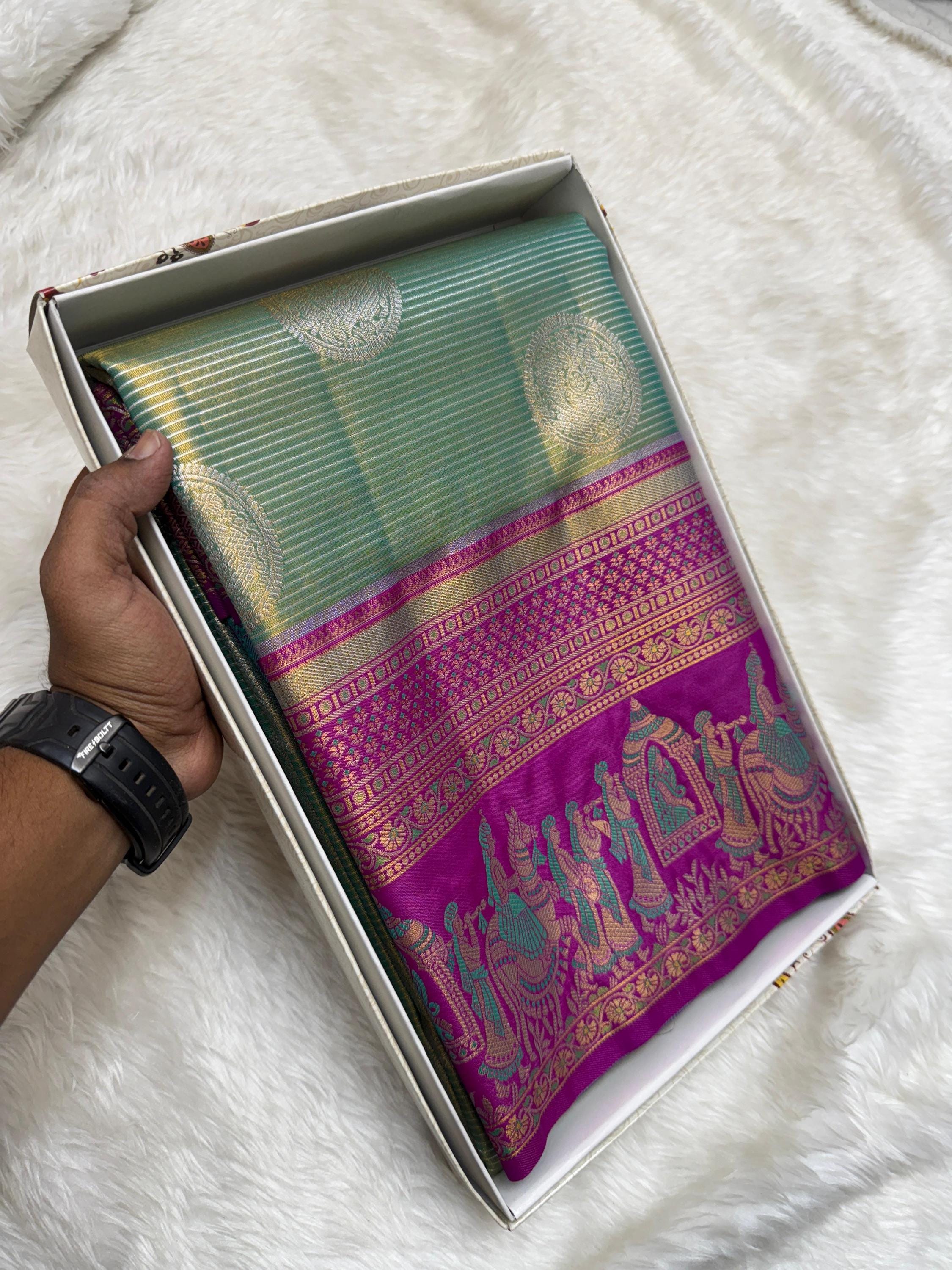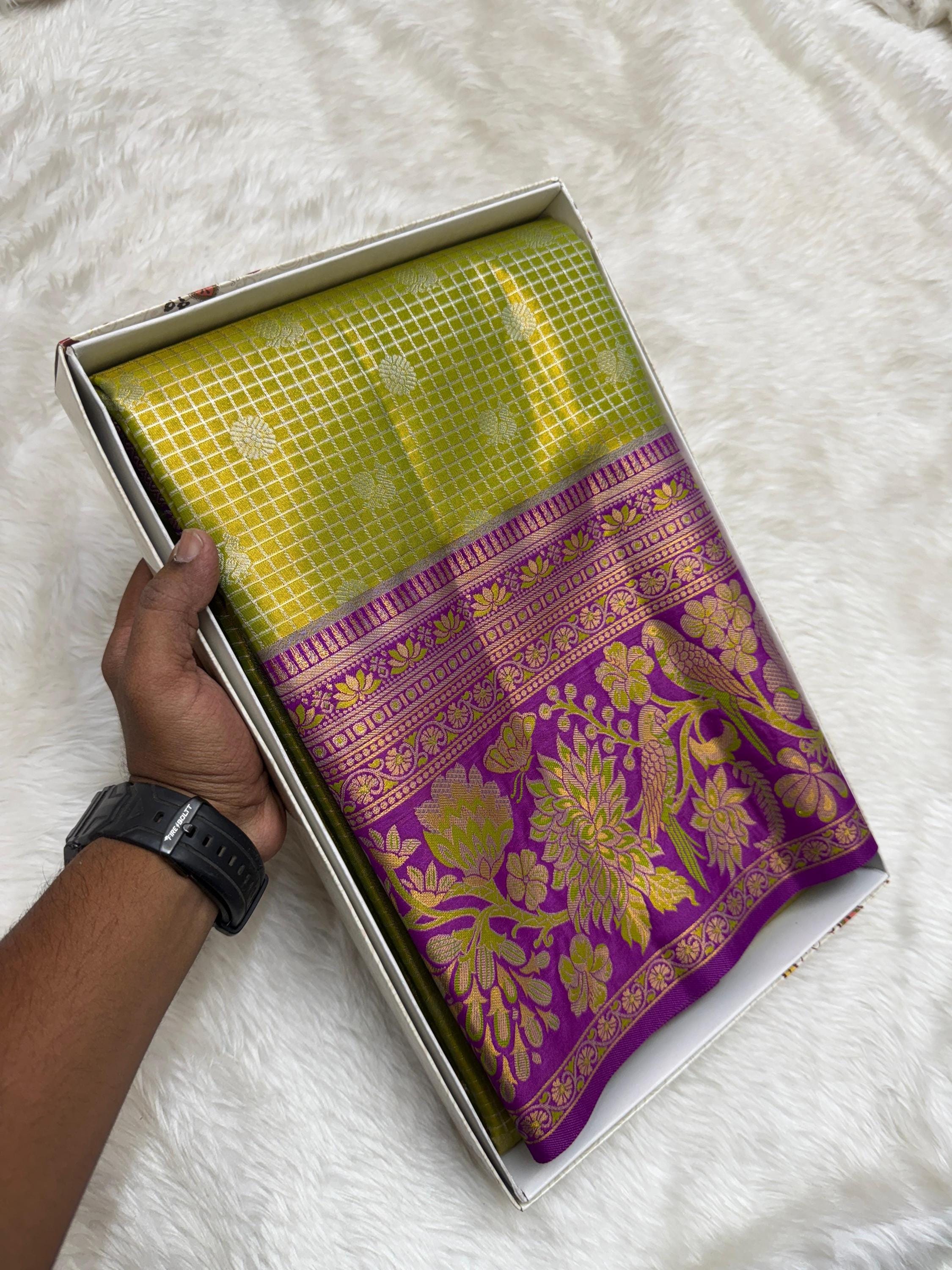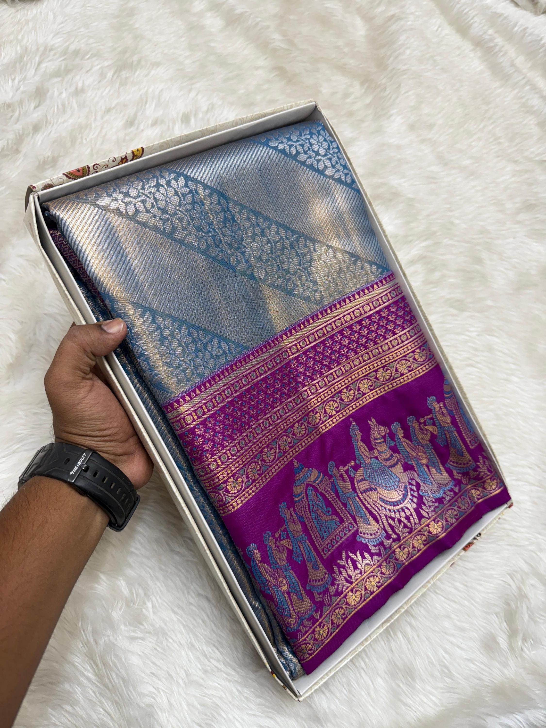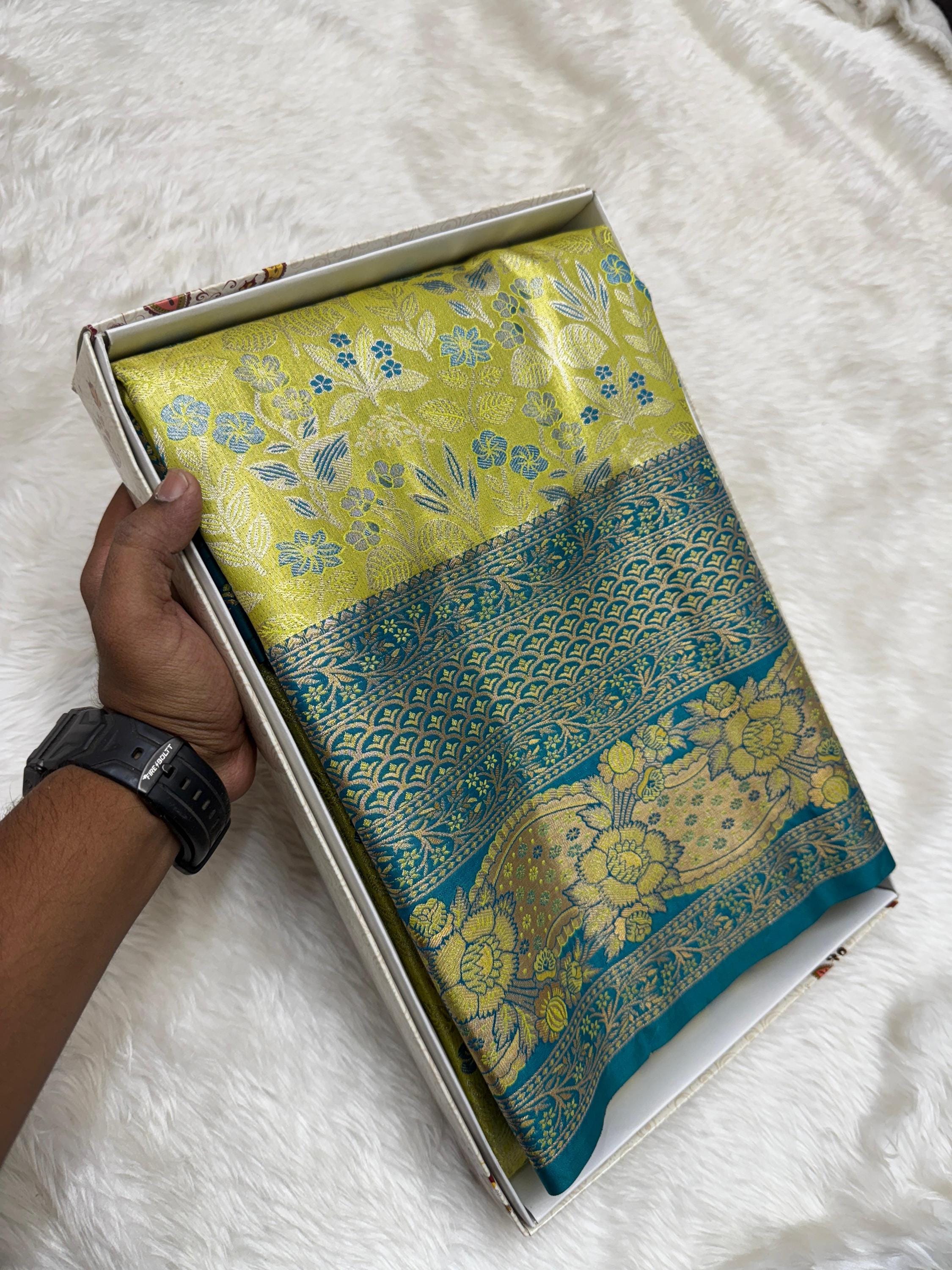 With its luxurious sheen and graceful drape, this saree is an ideal choice for bridal wear, wedding gifting, and festive occasions. Style it with traditional jewelry to complete a regal and timeless look.