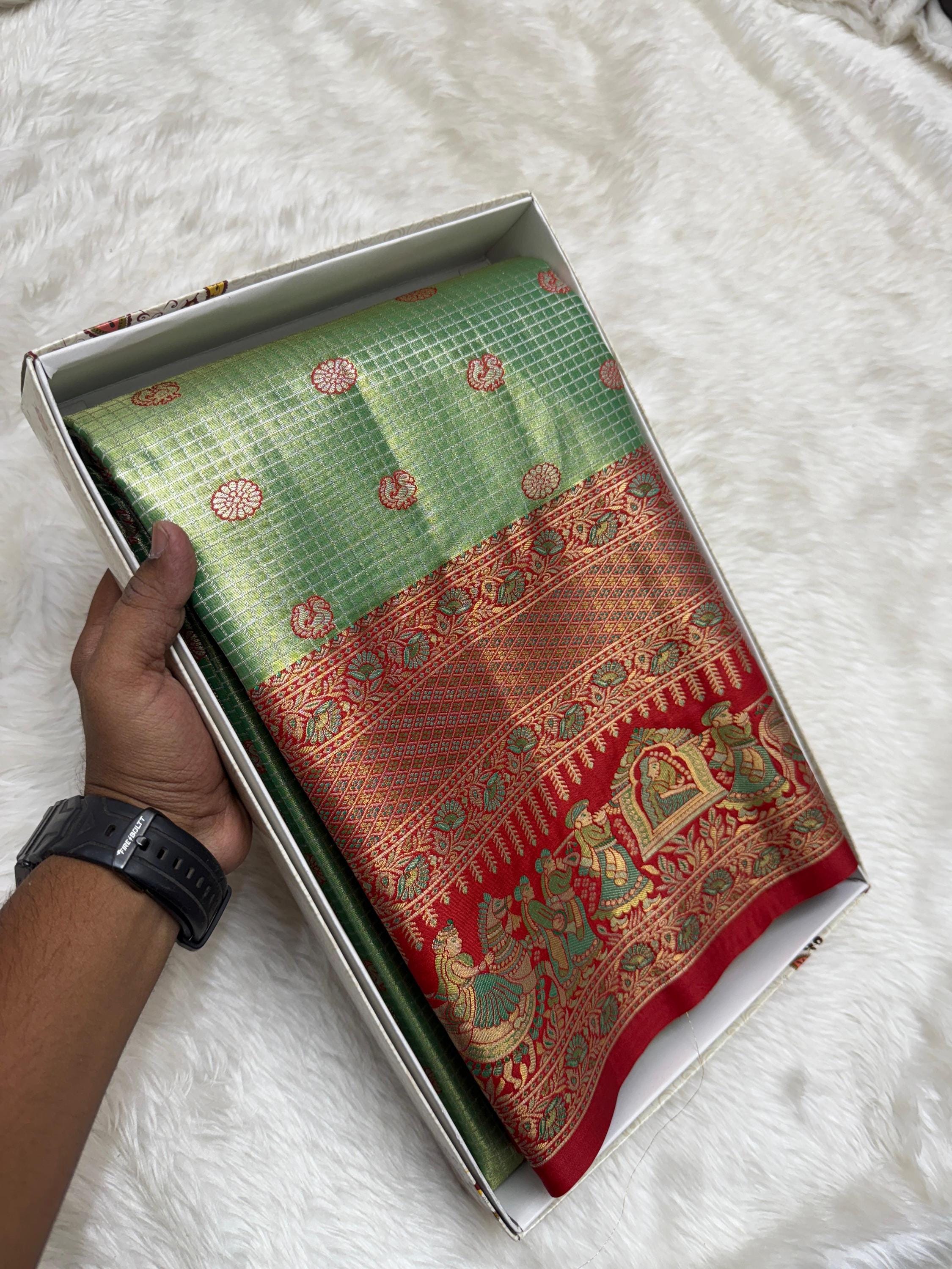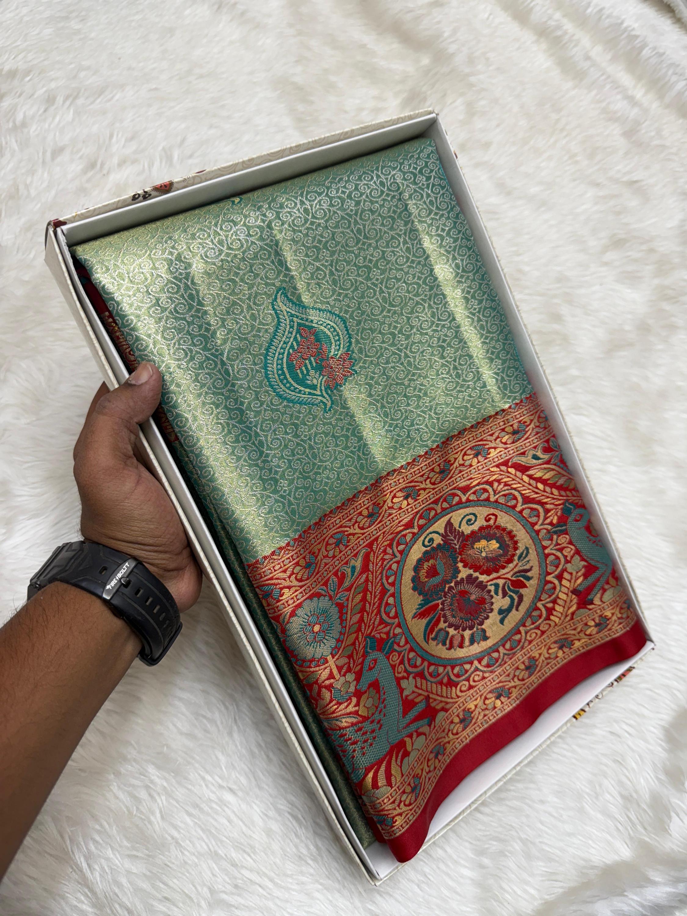 The highlight of this masterpiece is its exquisite green border, intricately adorned with meenakari floral zari work. The vibrant contrast enhances the overall appeal, bringing together classic artistry and striking color harmony.