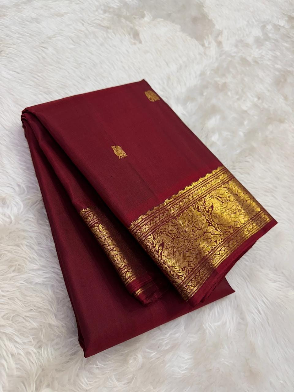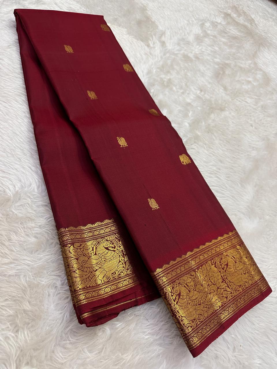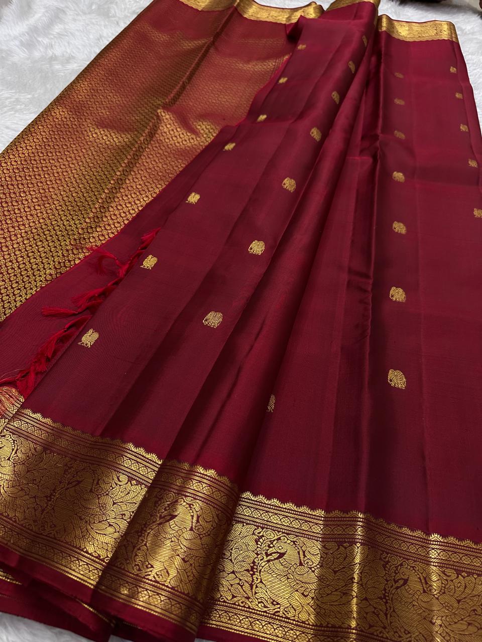 Deep Maroon Kanjeevaram Silk Saree with Gold Zari Peacock Border