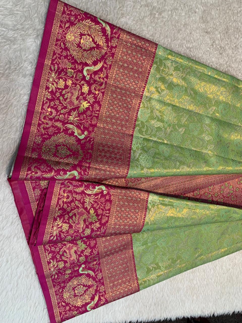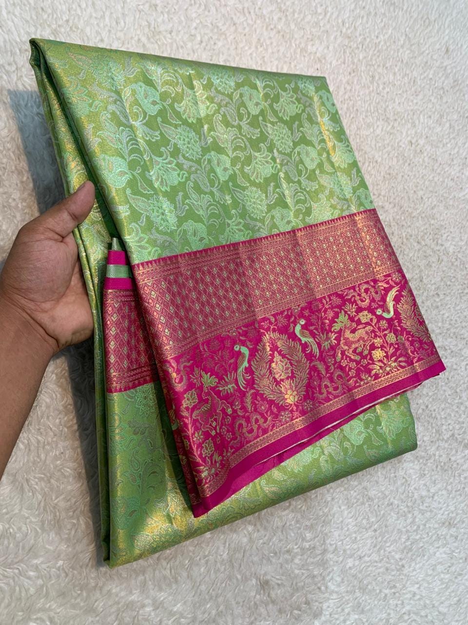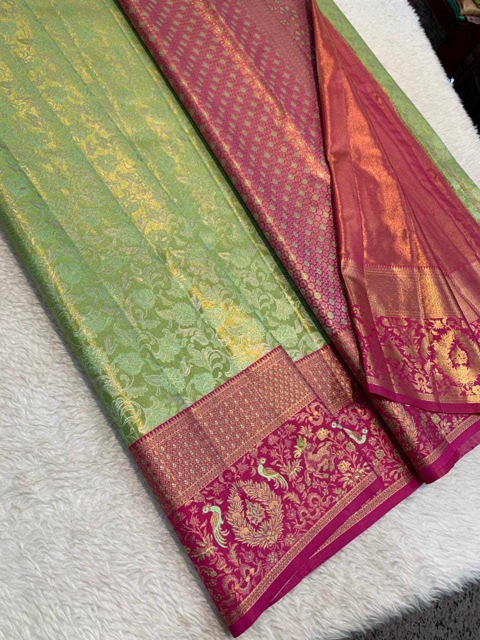 Step into festive elegance with this stunning mint green floral brocade saree, crafted from luxurious gold zari silk for a regal finish. The delicate floral motifs across the body exude charm, while the contrasting magenta pink border adorned with intricate peacock designs adds a vibrant, eye-catching touch.