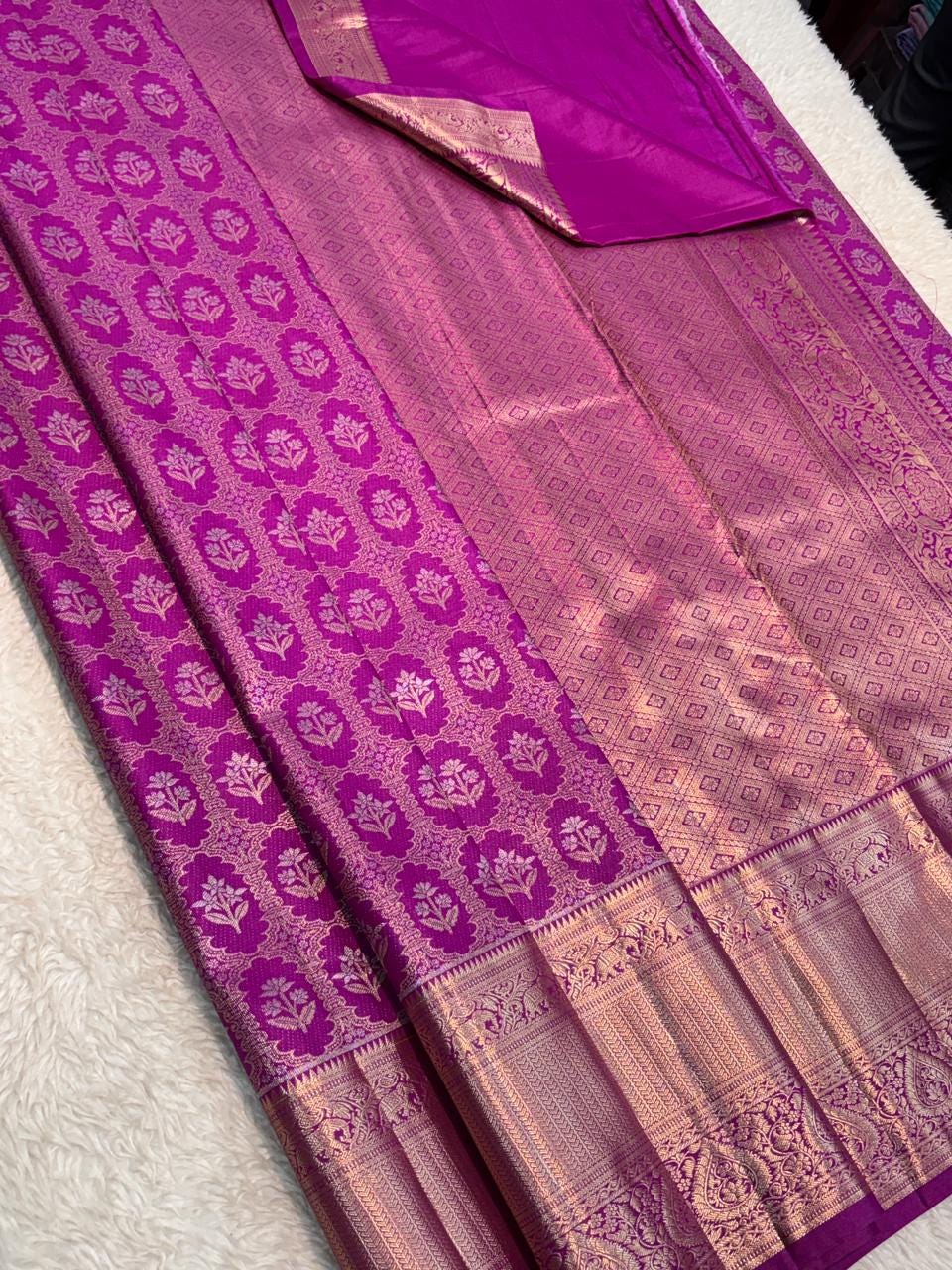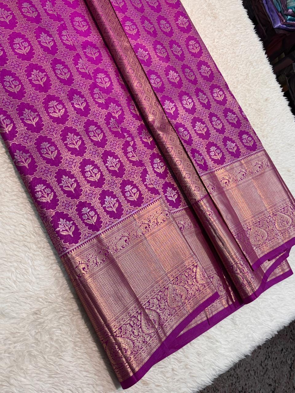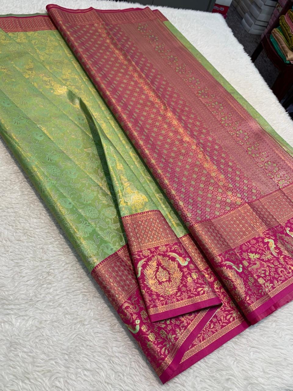 Step into festive elegance with this stunning mint green floral brocade saree, crafted from luxurious gold zari silk for a regal finish. The delicate floral motifs across the body exude charm, while the contrasting magenta pink border adorned with intricate peacock designs adds a vibrant, eye-catching touch.
