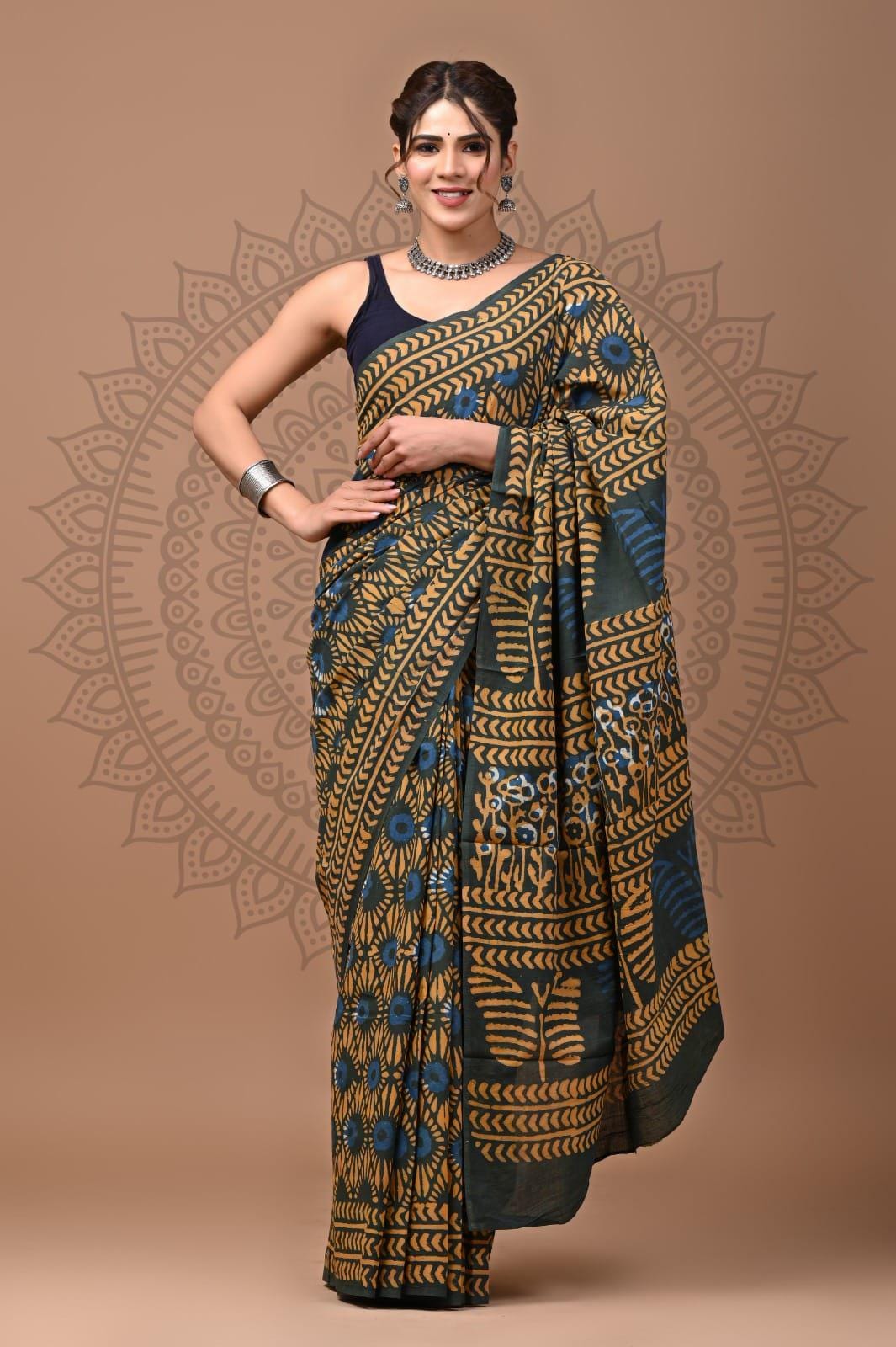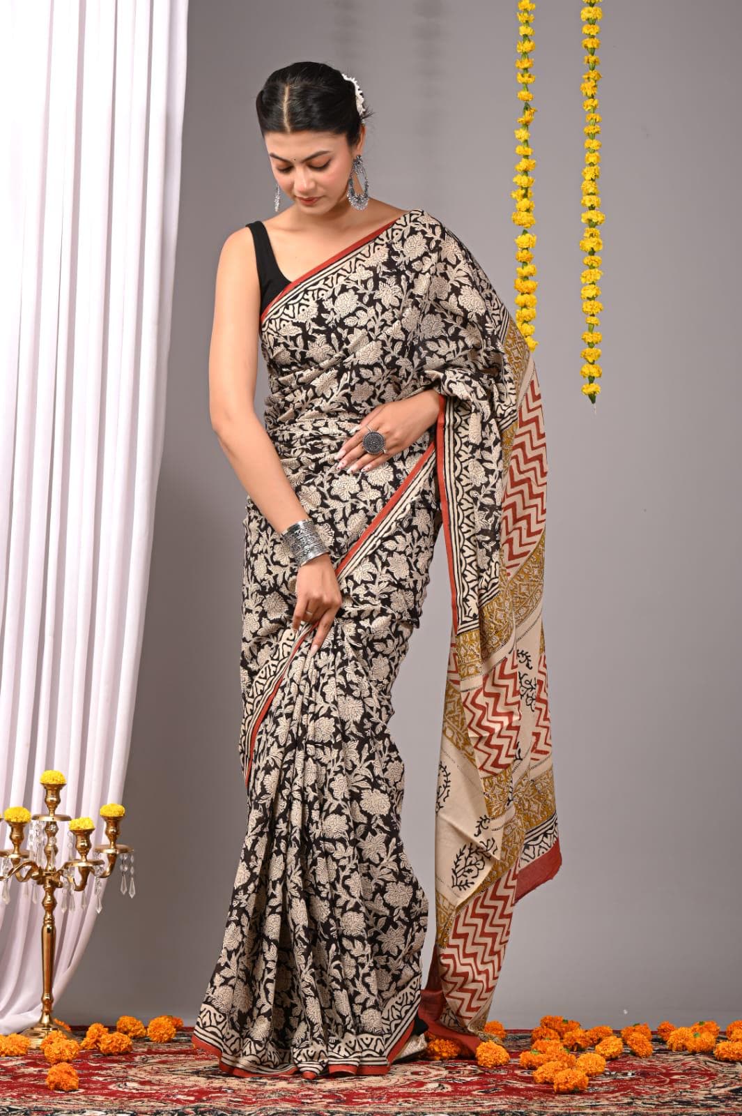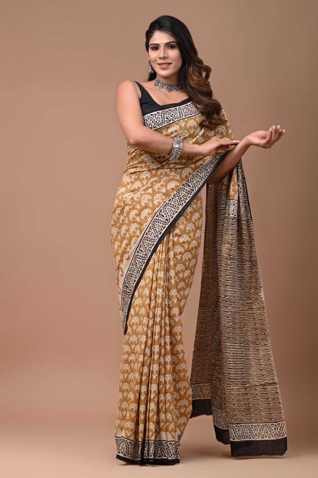 There is a beautiful soul to carefully curated textiles that instantly connects you to your roots. Embrace the warmth and joy of tradition with this earthy Mustard and Black Maheshwari Saree. Perfect for the modern woman who appreciates lightweight, breathable comfort without compromising on cultural grace, this fluid drape honors the historic Maheshwari weaving tradition. It features a warm mustard-beige body adorned with traditional block-print inspired floral motifs. The stunning contrast is delivered through a striking black and off-white geometric border and an intricately patterned pallu. It is an exquisitely comfortable and graceful choice for everyday ethnic wear, office attire, and minimalist daytime styling.