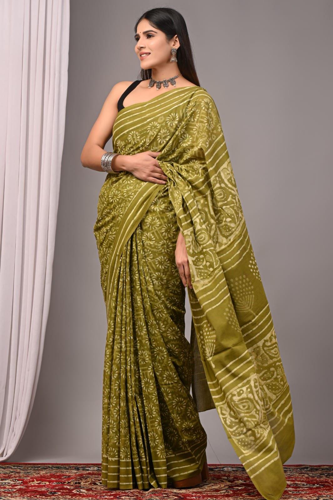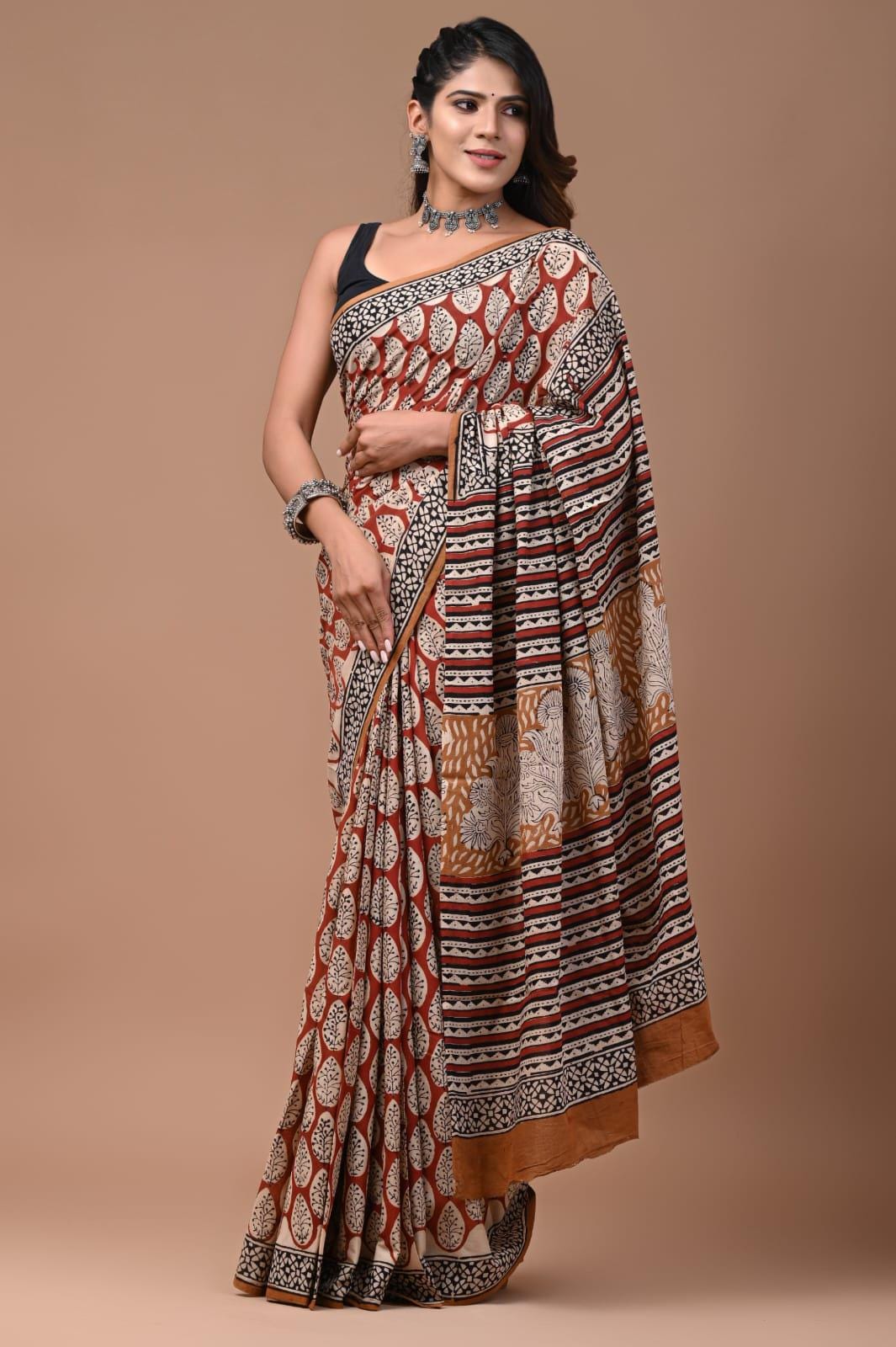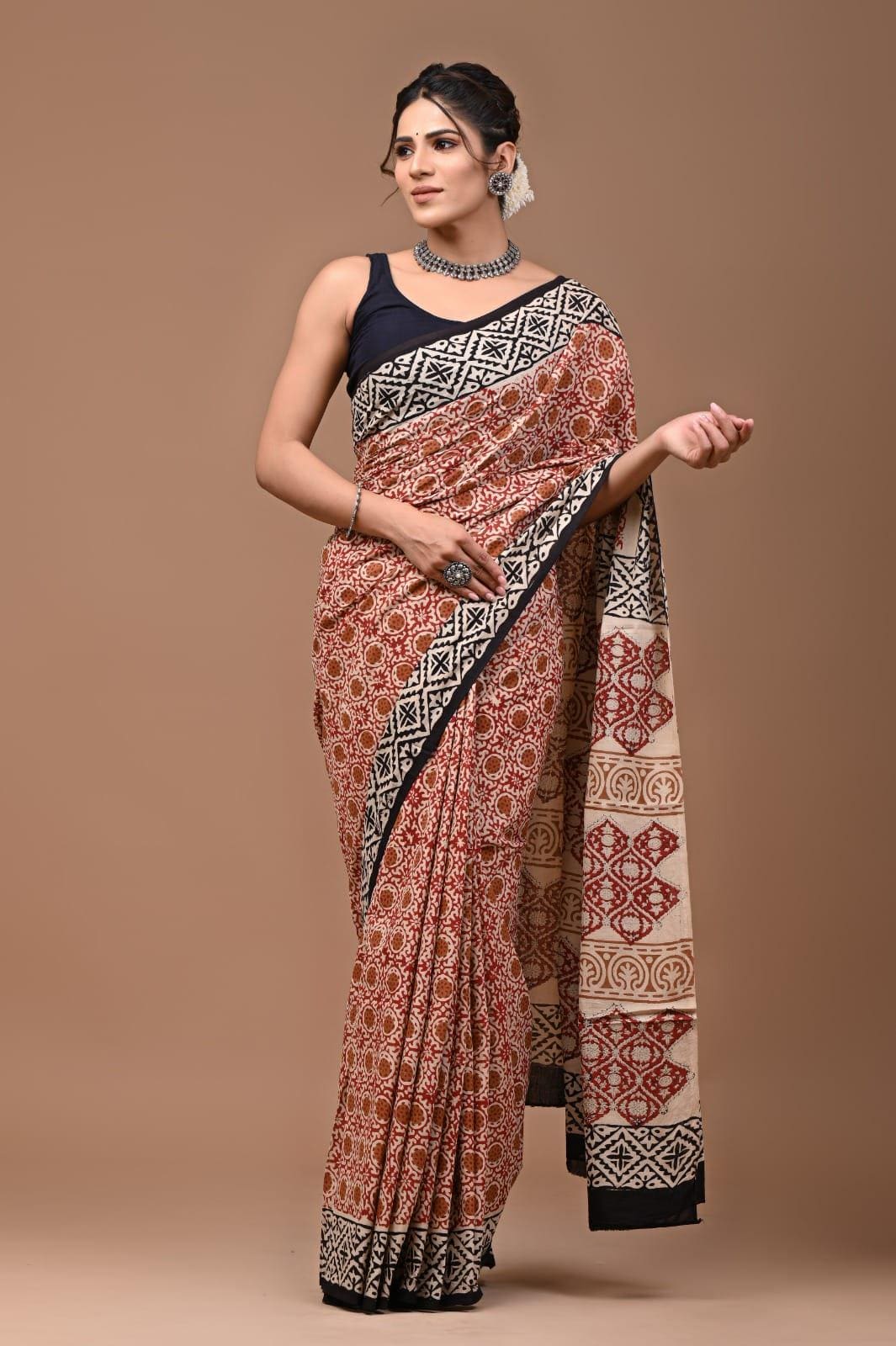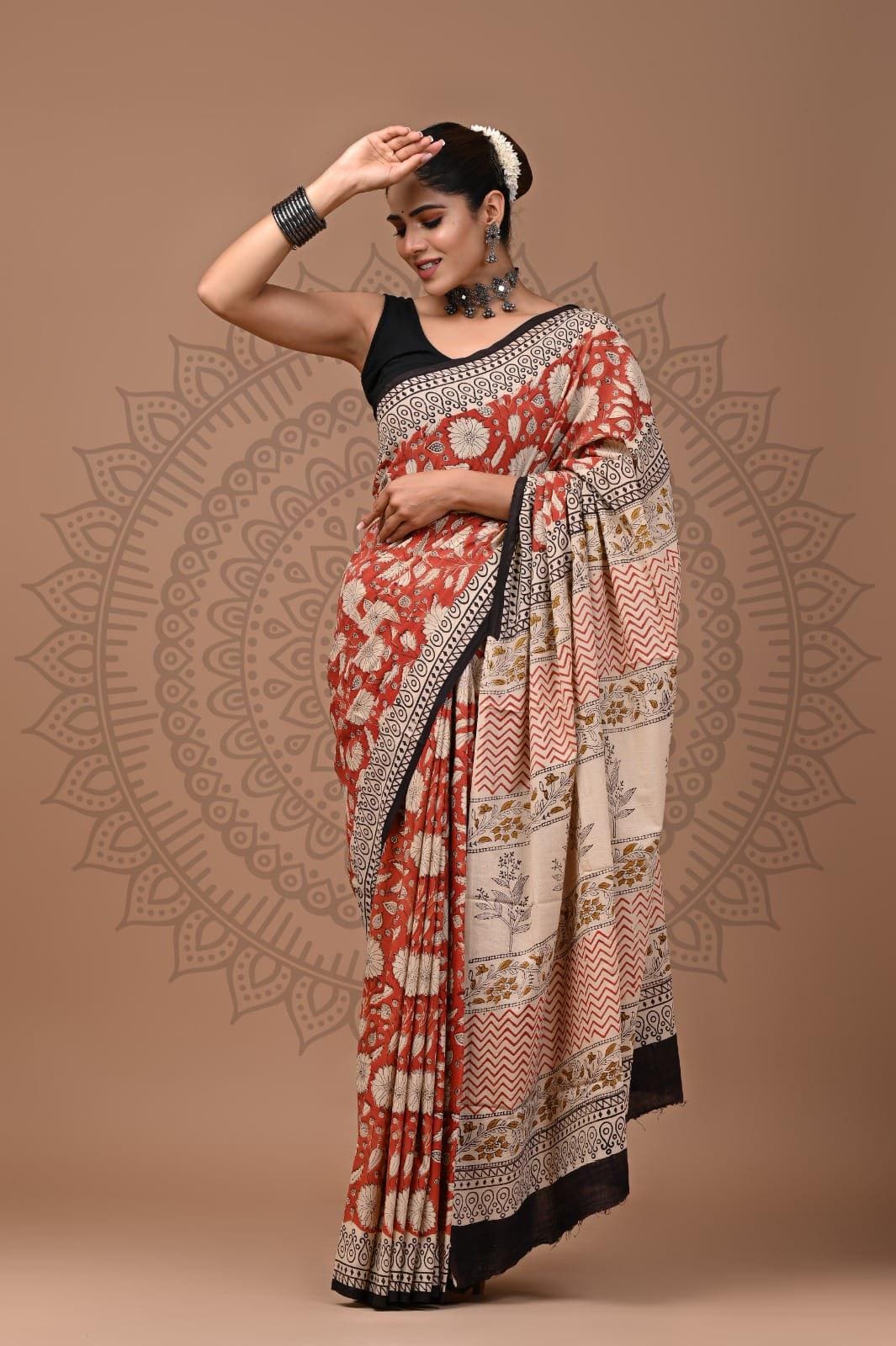 There is a beautiful soul to carefully curated textiles that instantly connects you to your roots. Embrace the warmth and joy of tradition with this earthy Mustard and Black Maheshwari Saree. Perfect for the modern woman who appreciates lightweight, breathable comfort without compromising on cultural grace, this fluid drape honors the historic Maheshwari weaving tradition. It features a warm mustard-beige body adorned with traditional block-print inspired floral motifs. The stunning contrast is delivered through a striking black and off-white geometric border and an intricately patterned pallu. It is an exquisitely comfortable and graceful choice for everyday ethnic wear, office attire, and minimalist daytime styling.