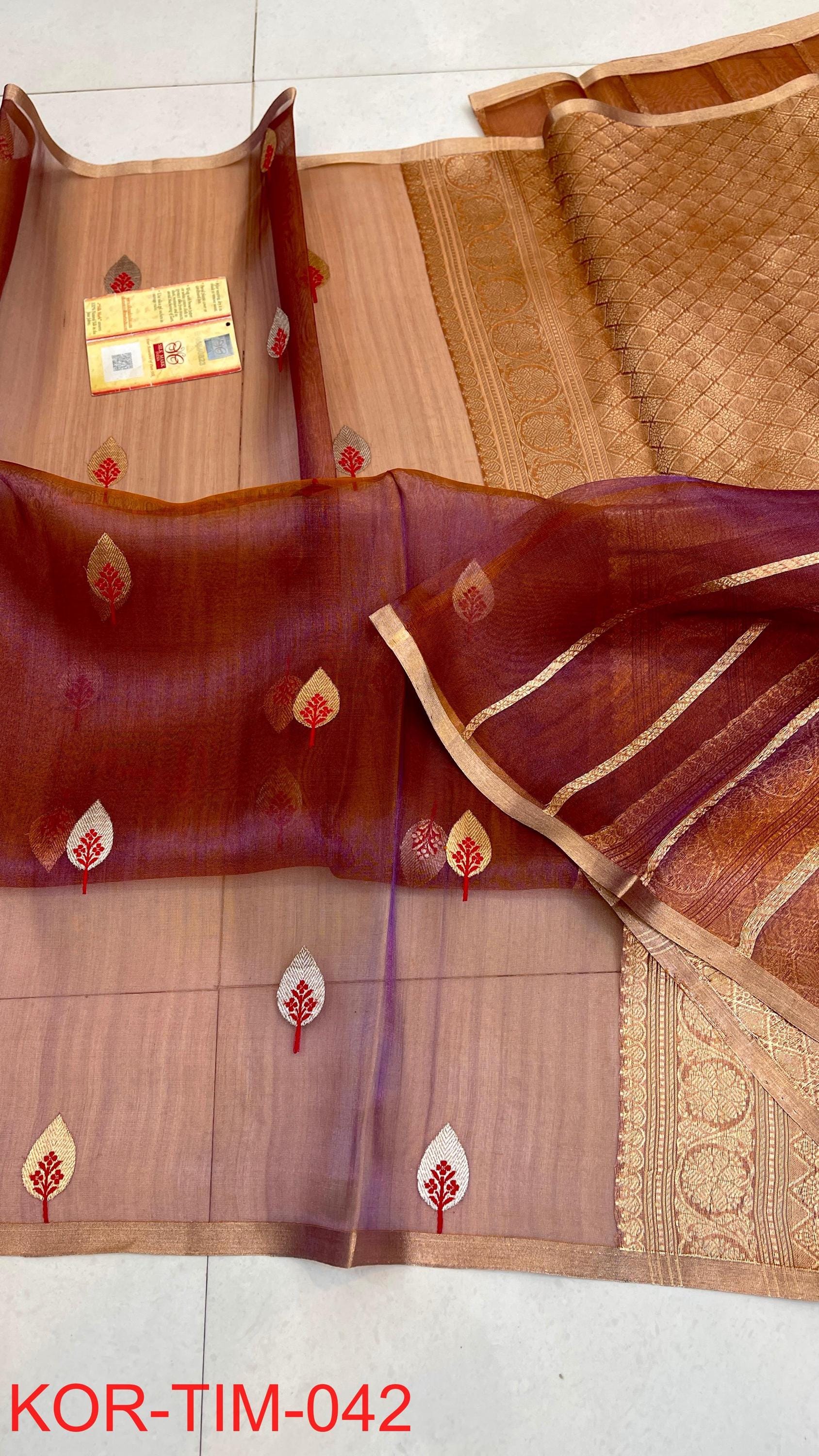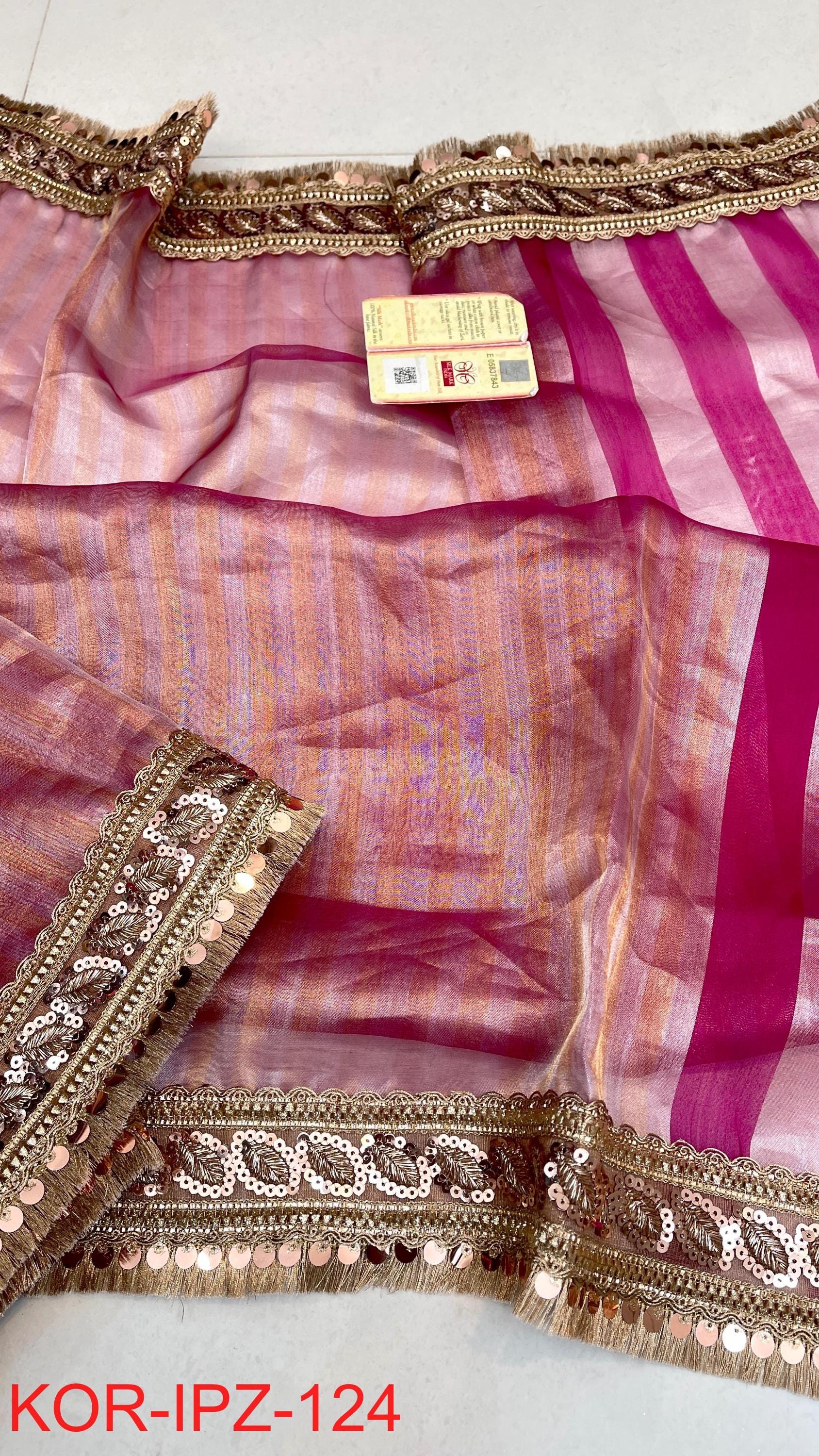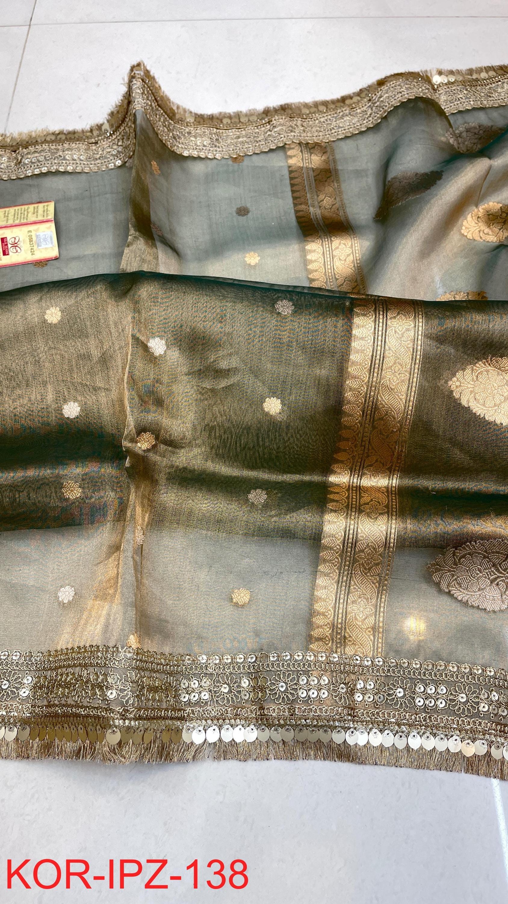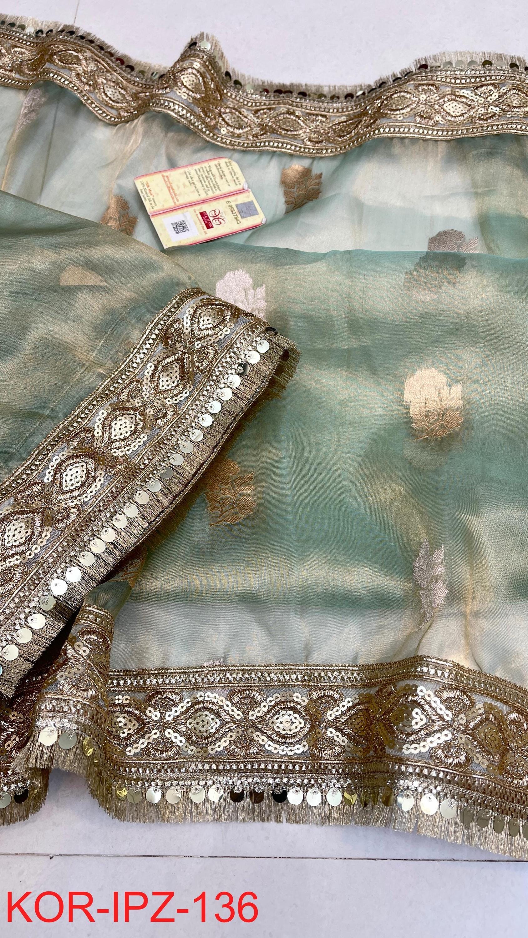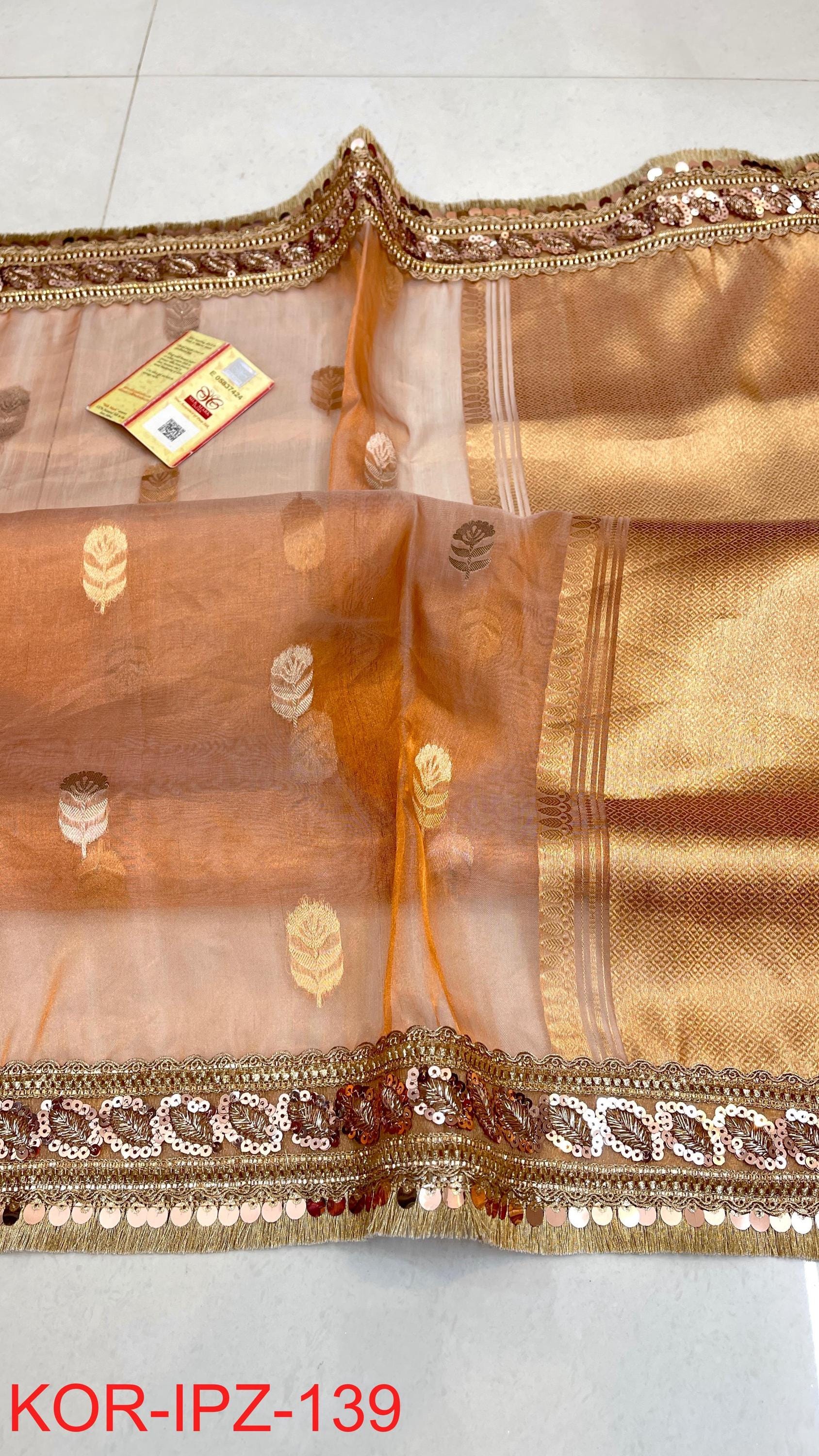 * Fabric: 100% Pure Kora Organza/Tissue Silk (Silk Mark Certified) offering a sheer, crisp, and luminous drape