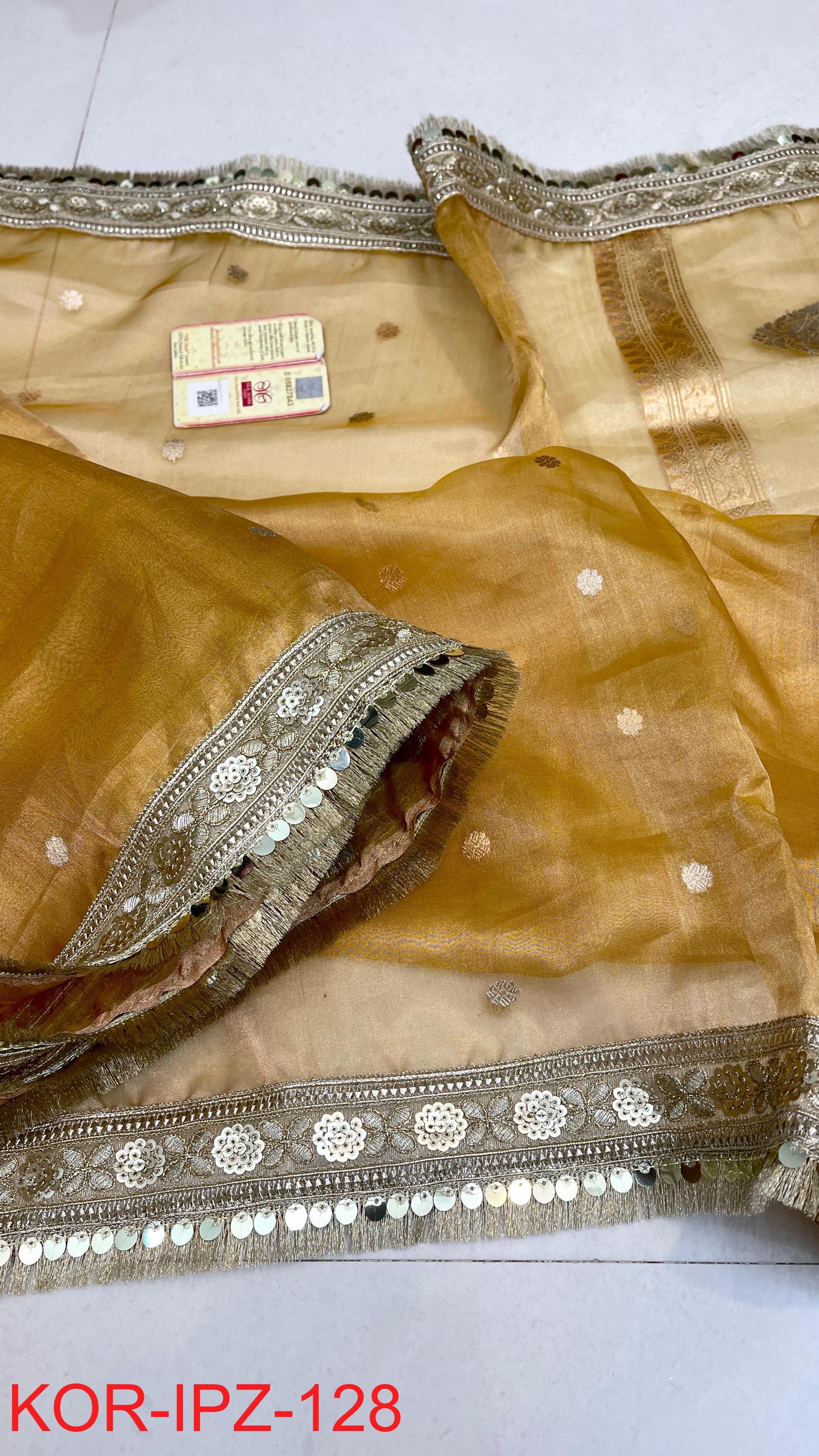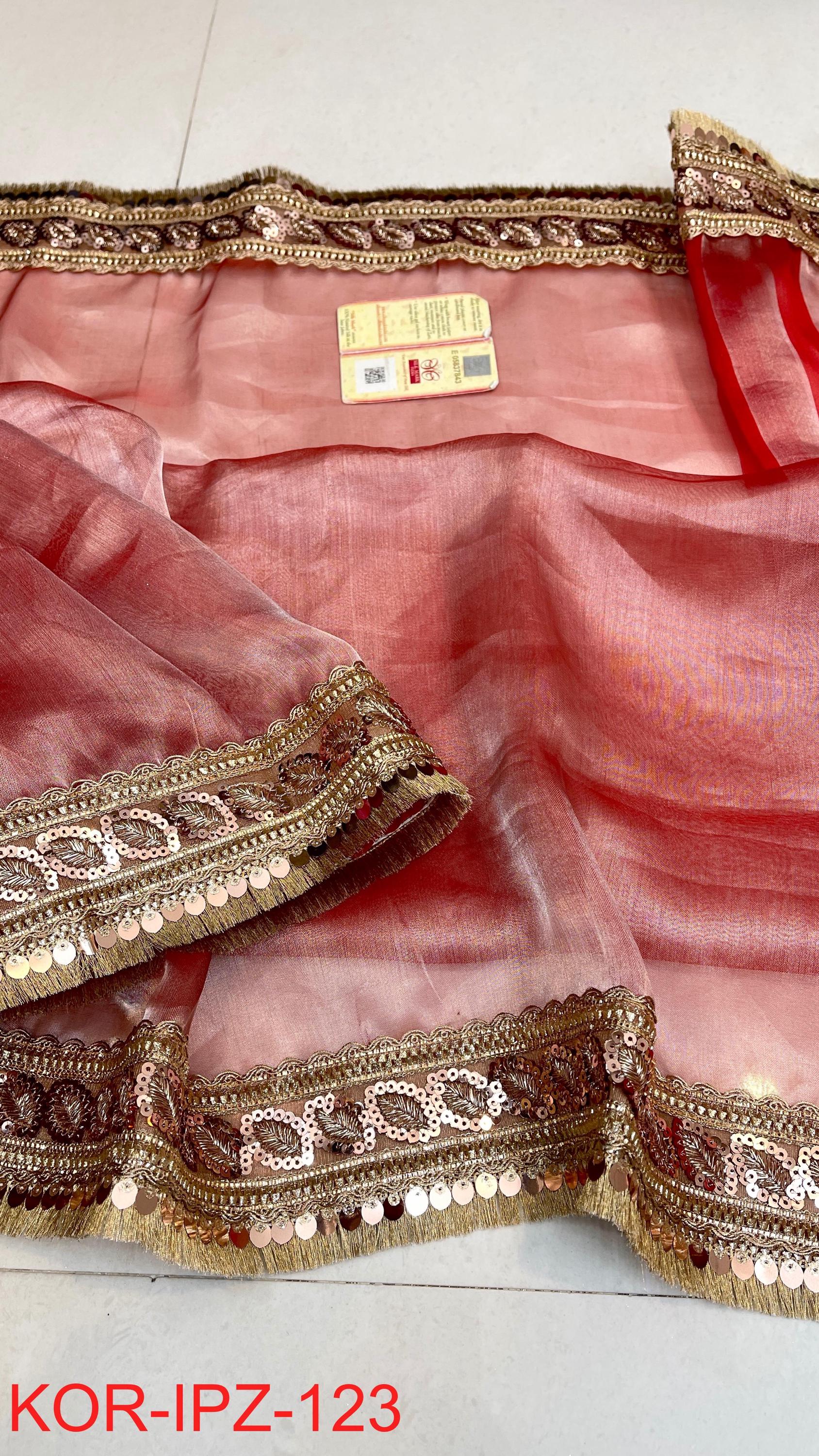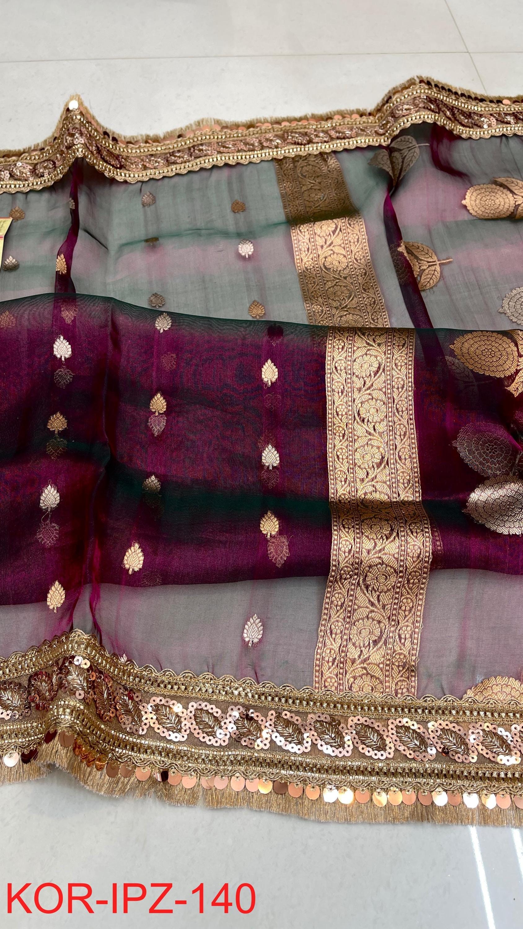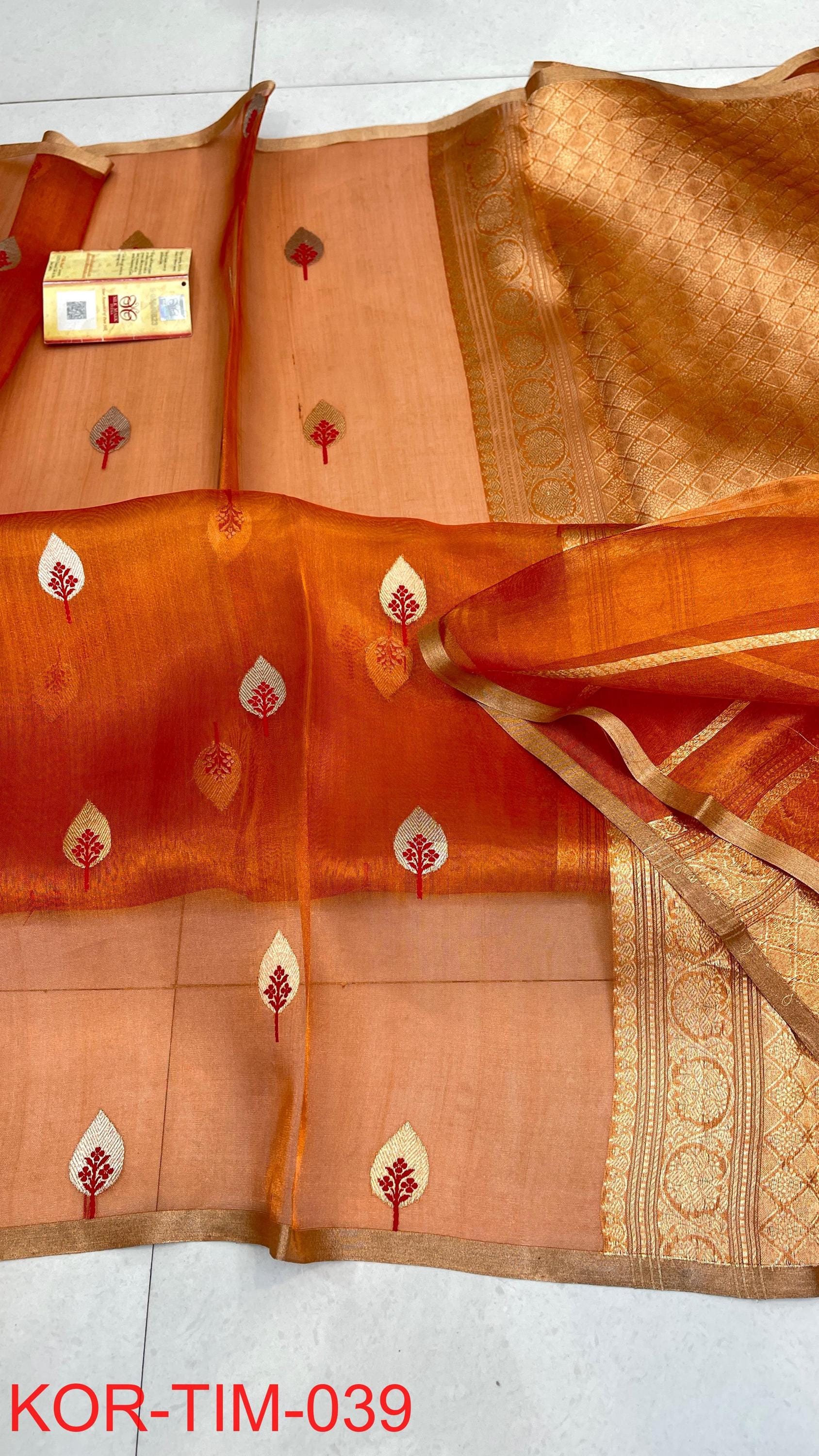 * Fabric: 100% Pure Kora Organza/Tissue Silk (Silk Mark Certified) offering a sheer, crisp, and luminous drape