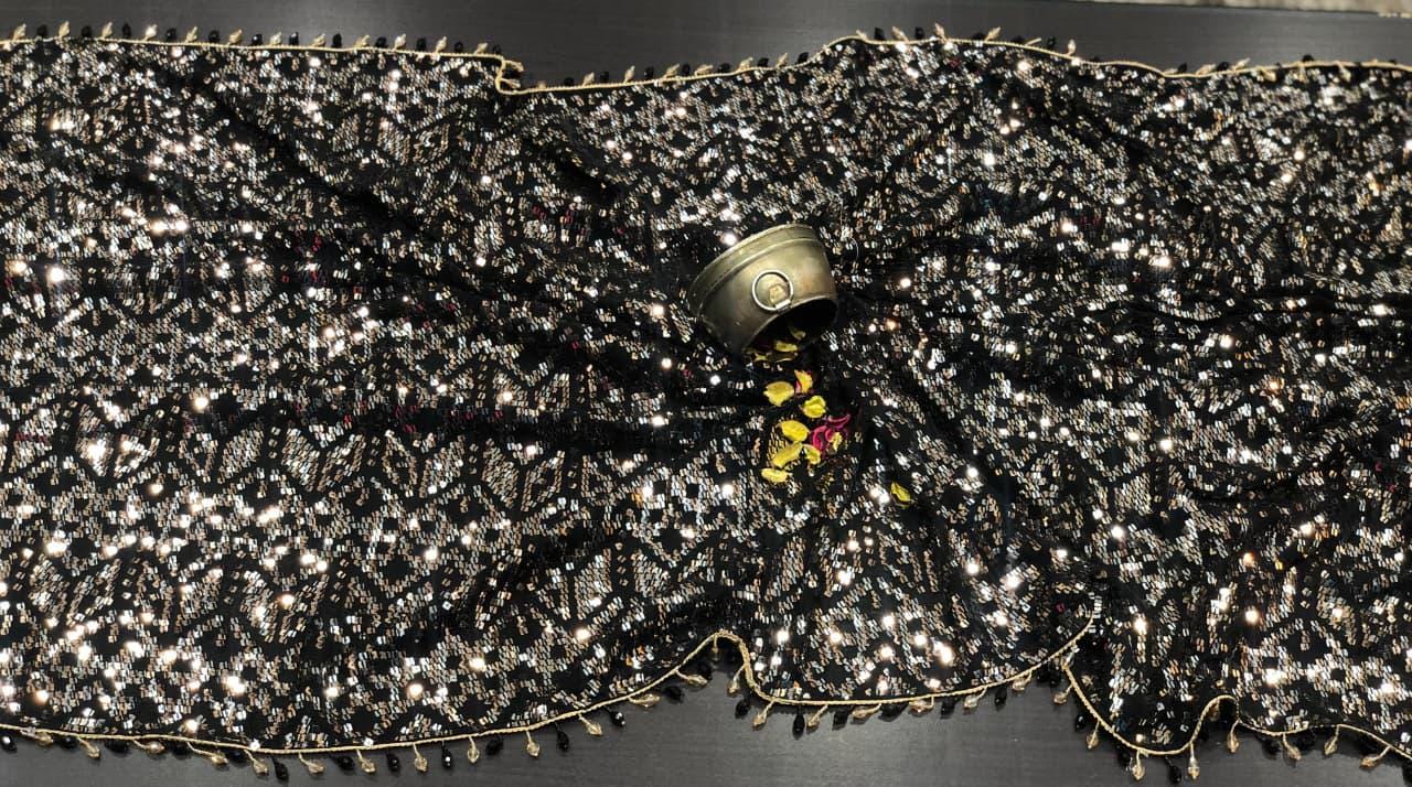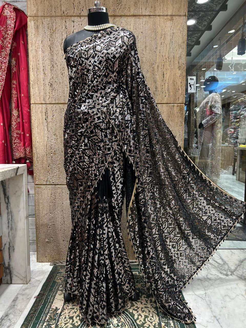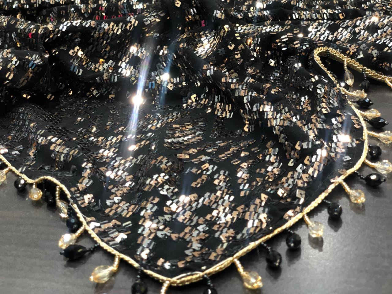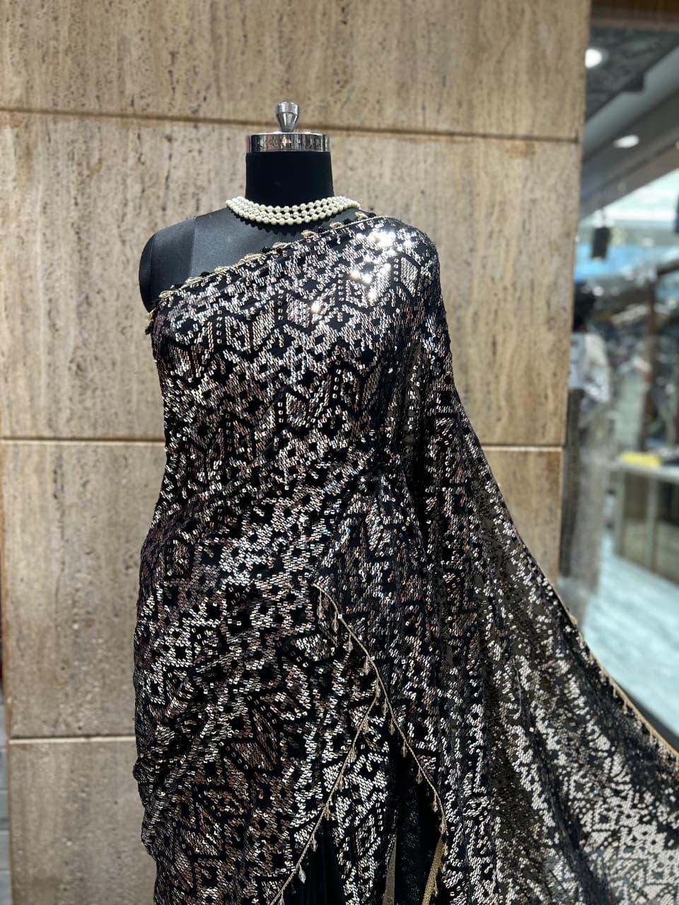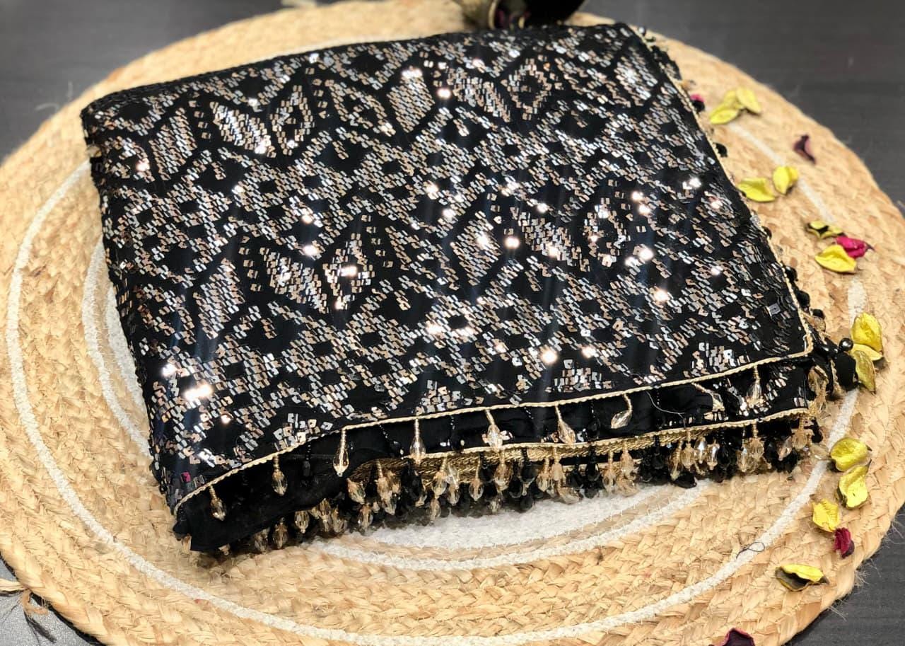 There is a beautiful soul to carefully curated textiles that instantly connects you to the artisan's touch. Step into the spotlight and command the room with this spectacular Black Georgette Sequin Saree. Designed for the woman who loves high-octane glamour, this fluid drape is a masterpiece of heavy, intricate handwork. The deep black georgette base is entirely illuminated by thousands of sparkling silver and metallic sequins, meticulously hand-embroidered into a striking, continuous geometric pattern. Finished with a delicate beaded fringe along the borders, this heavy, luxurious piece is the ultimate curated statement for cocktail parties, evening wedding receptions, Sangeet nights, and red-carpet-worthy celebrations.