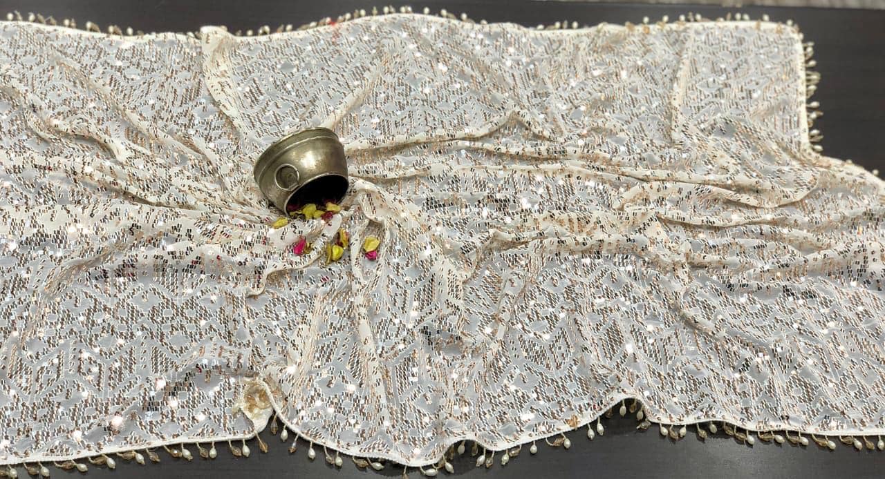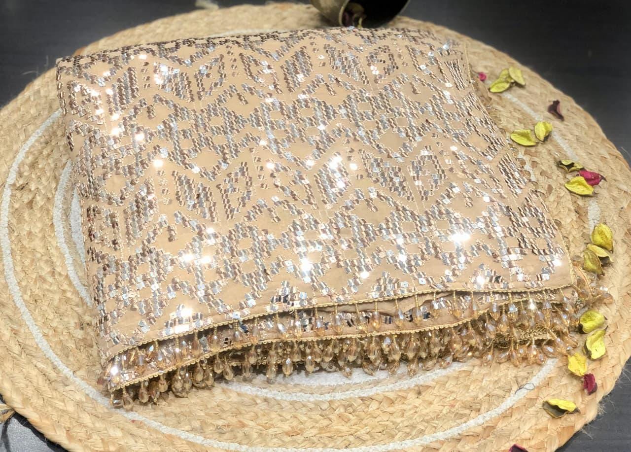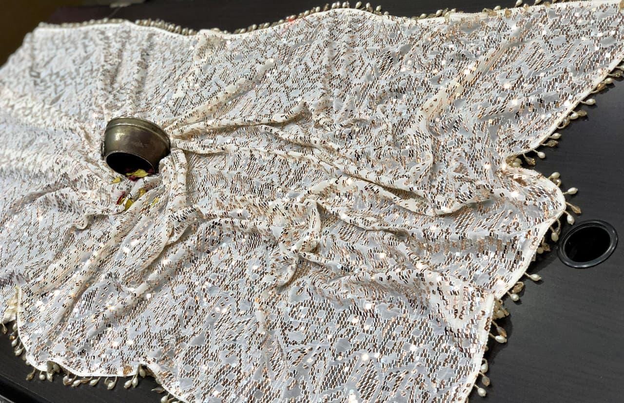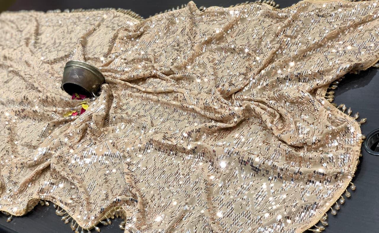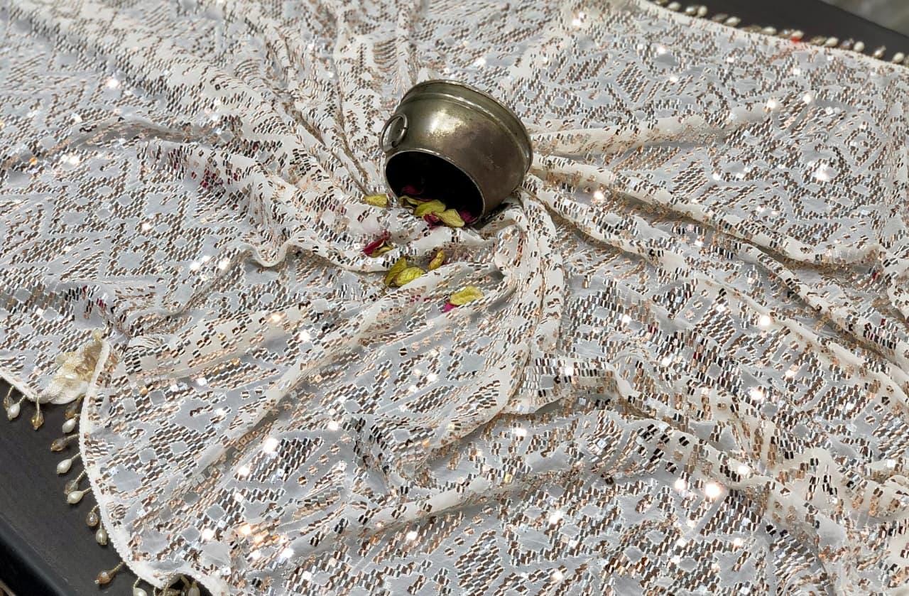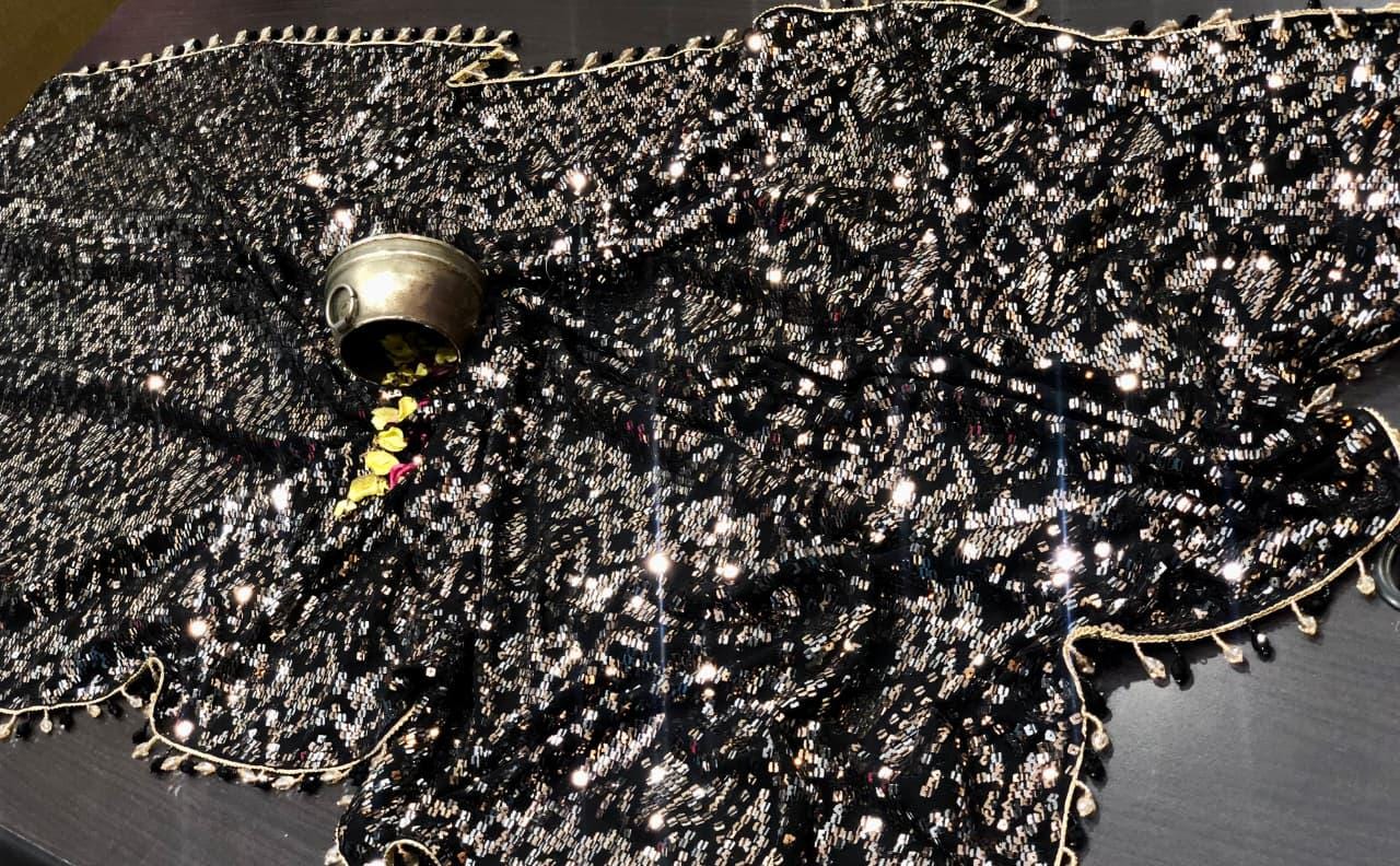 There is a beautiful soul to carefully curated textiles that instantly connects you to the artisan's touch. Step into the spotlight and command the room with this spectacular Black Georgette Sequin Saree. Designed for the woman who loves high-octane glamour, this fluid drape is a masterpiece of heavy, intricate handwork. The deep black georgette base is entirely illuminated by thousands of sparkling silver and metallic sequins, meticulously hand-embroidered into a striking, continuous geometric pattern. Finished with a delicate beaded fringe along the borders, this heavy, luxurious piece is the ultimate curated statement for cocktail parties, evening wedding receptions, Sangeet nights, and red-carpet-worthy celebrations.