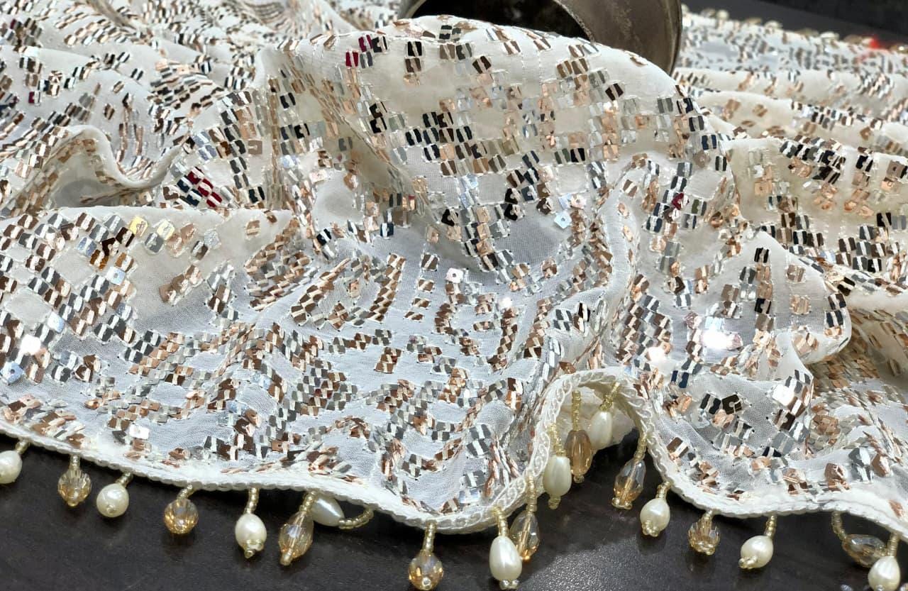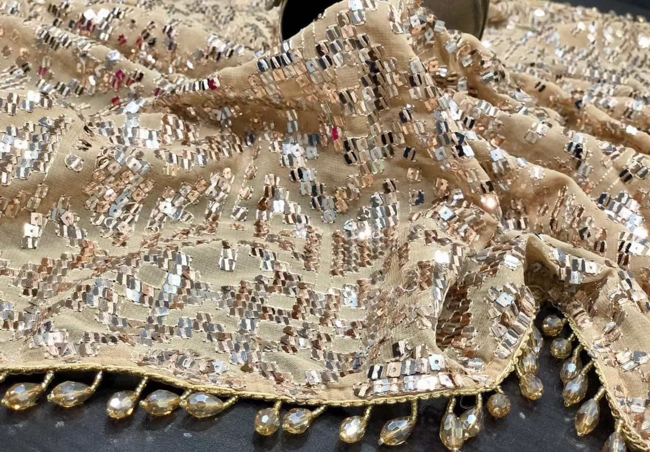 * Design: Heavy, all-over handwork sequin embroidery in a striking geometric pattern with beaded fringe edging
