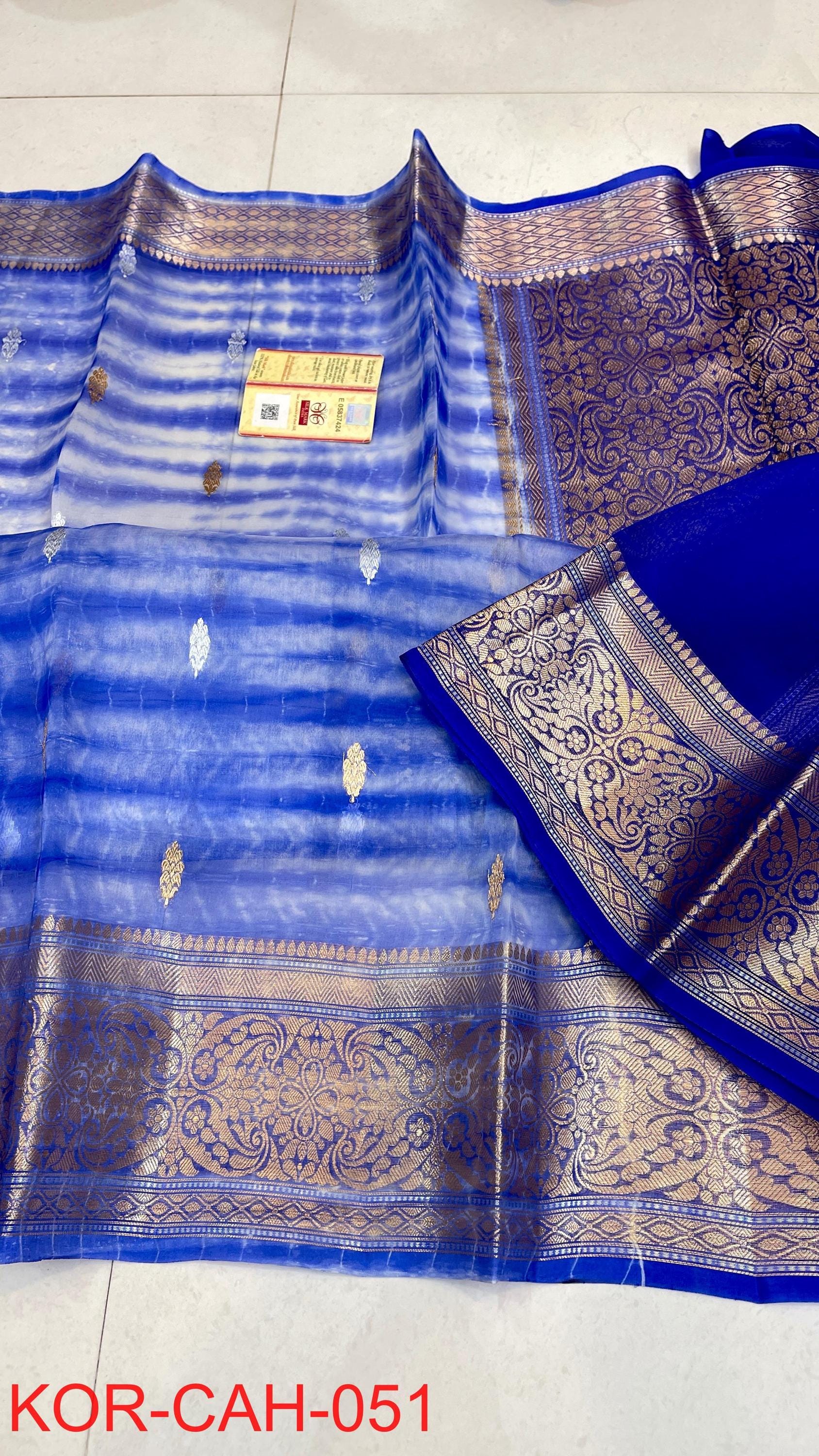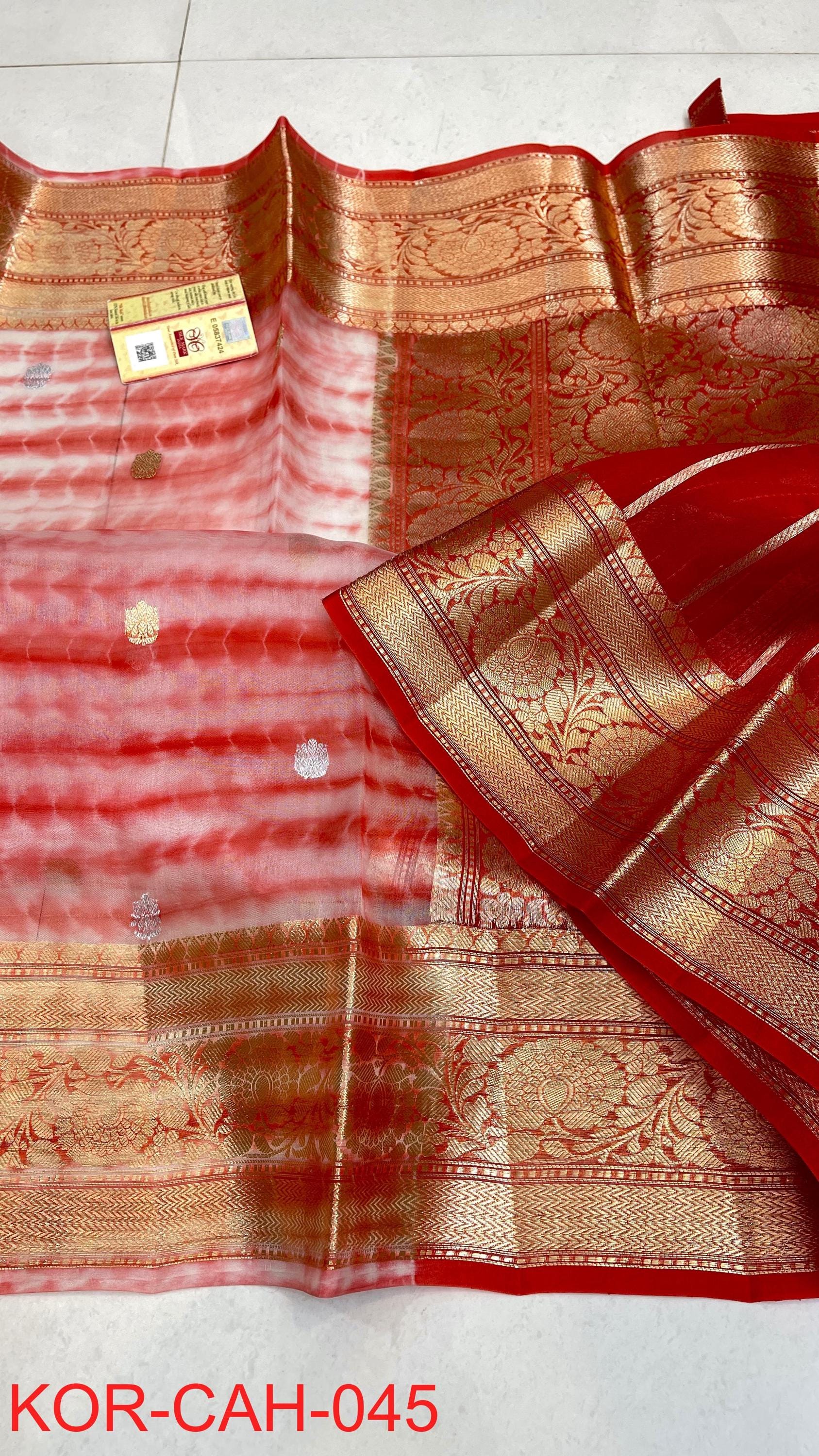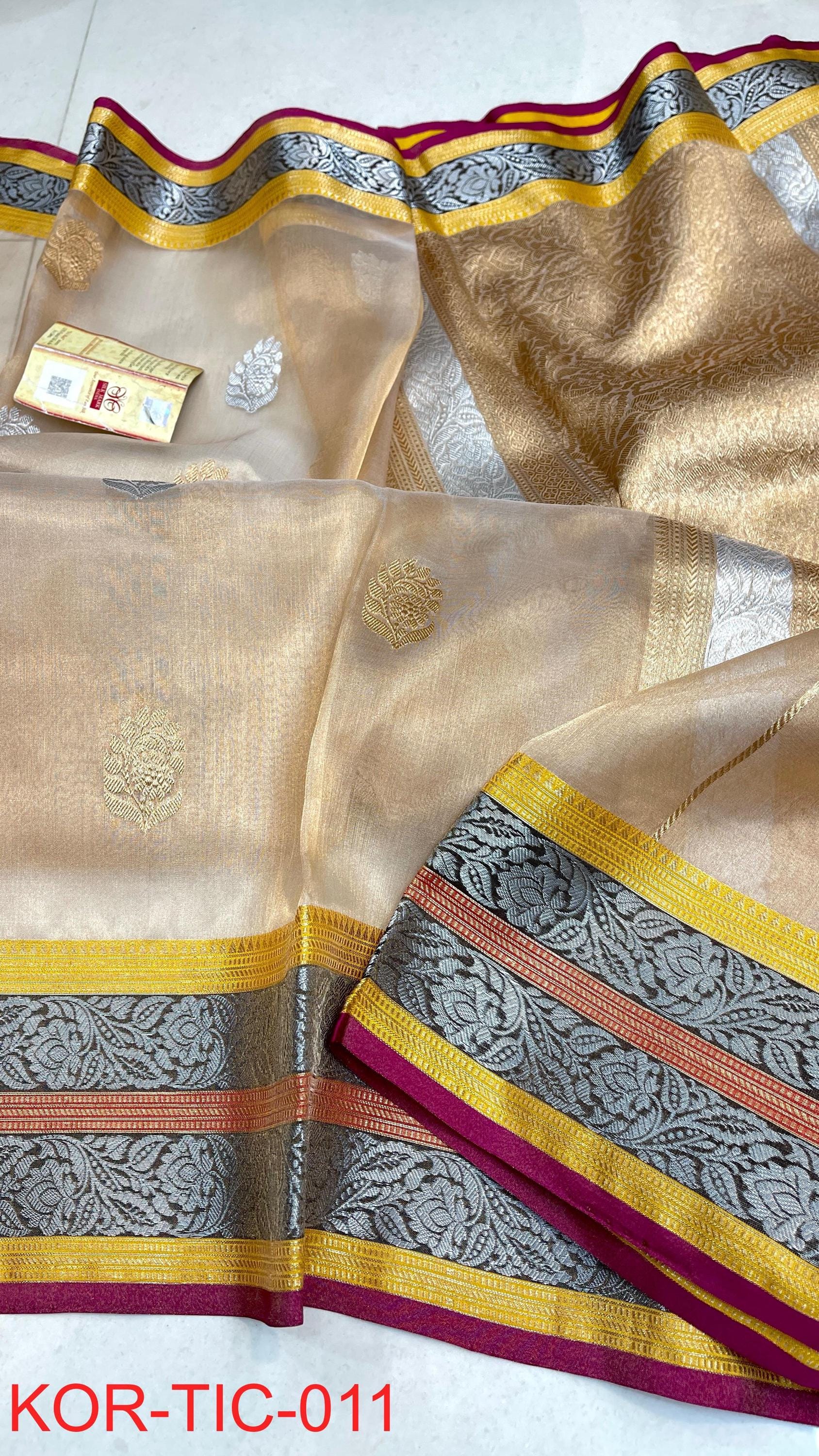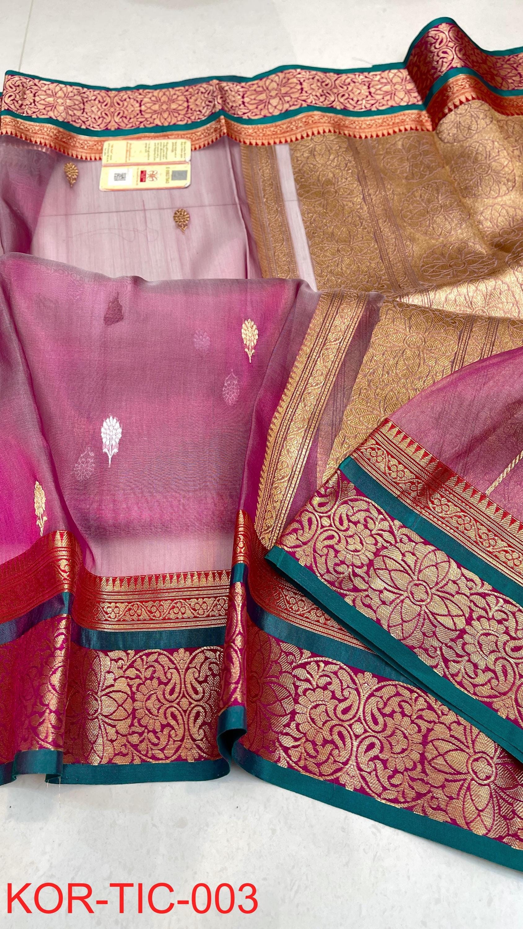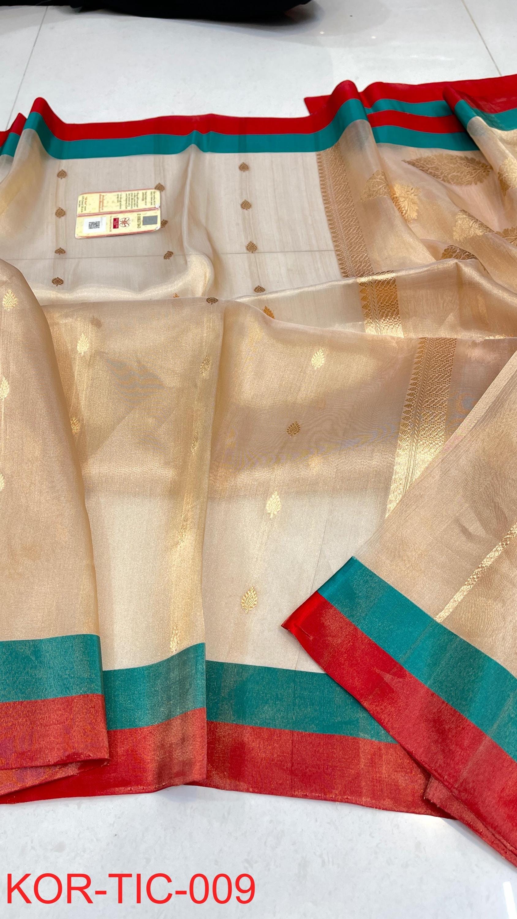 * Fabric: 100% Pure Kora Organza/Tissue Silk (Silk Mark Certified) offering a sheer, crisp, and luminous drape