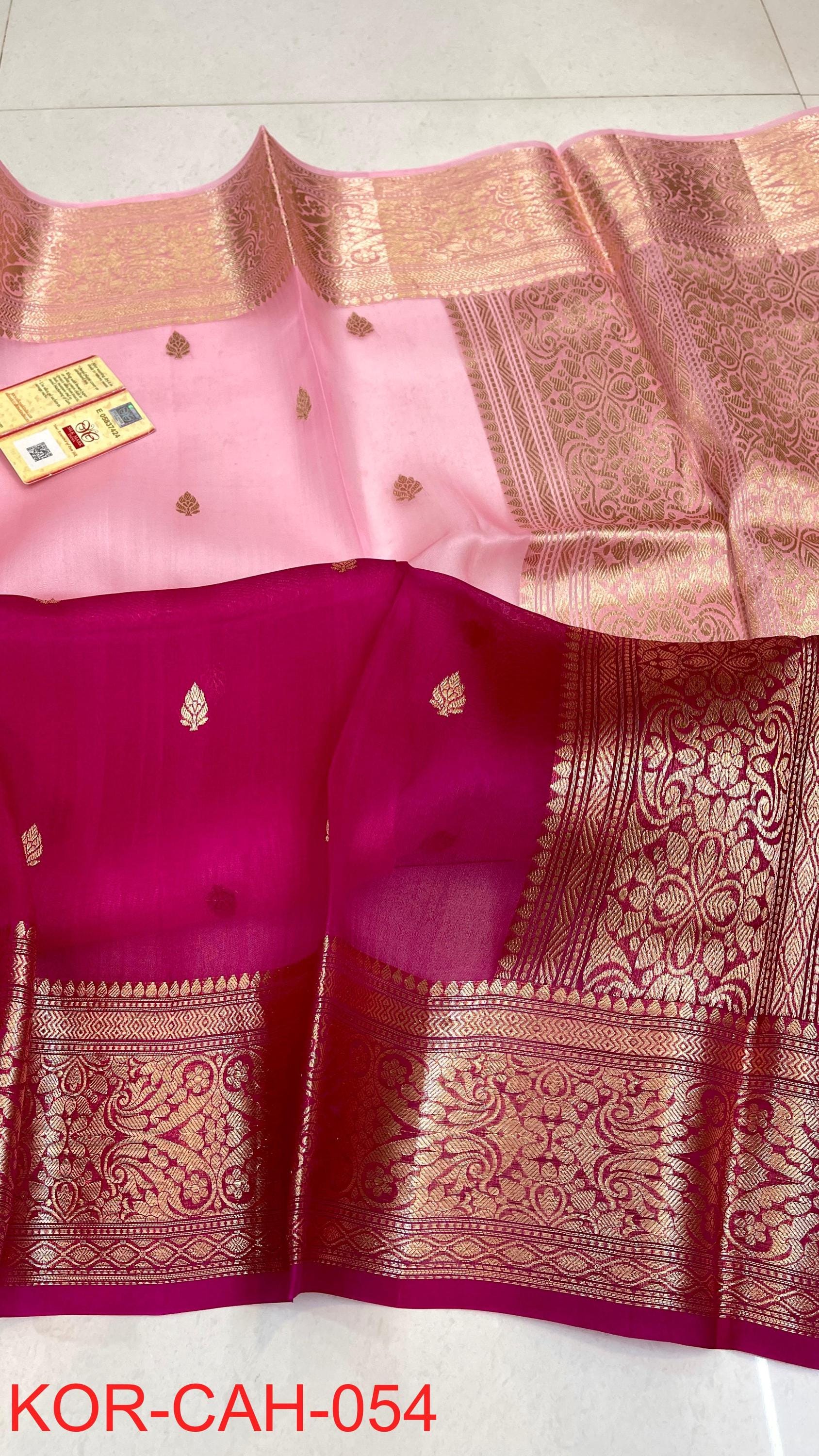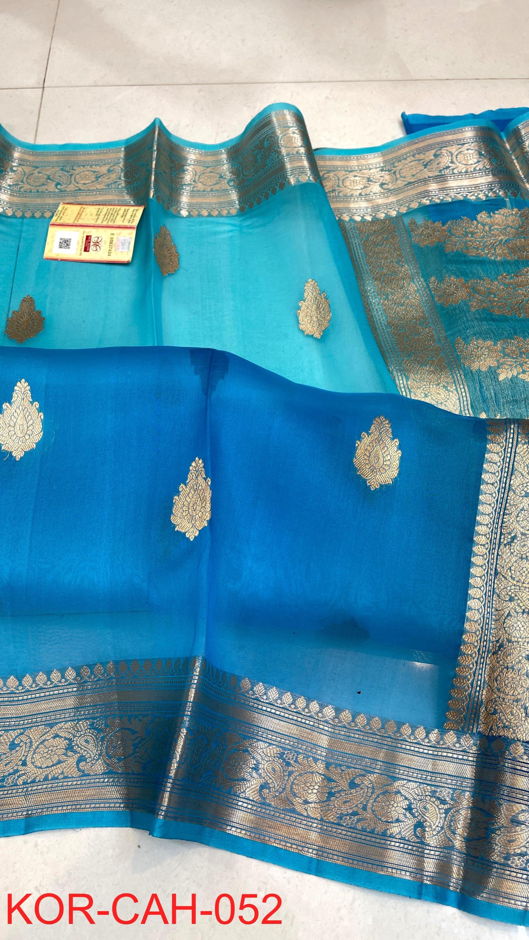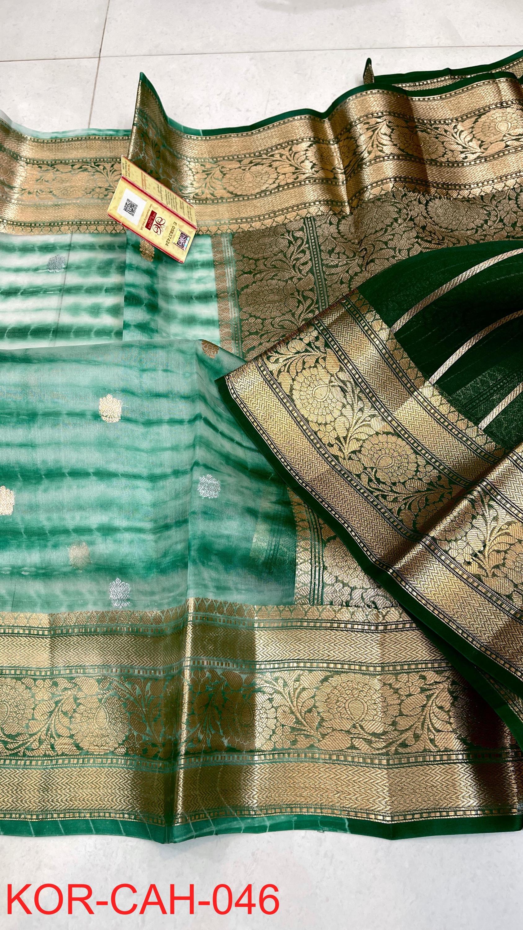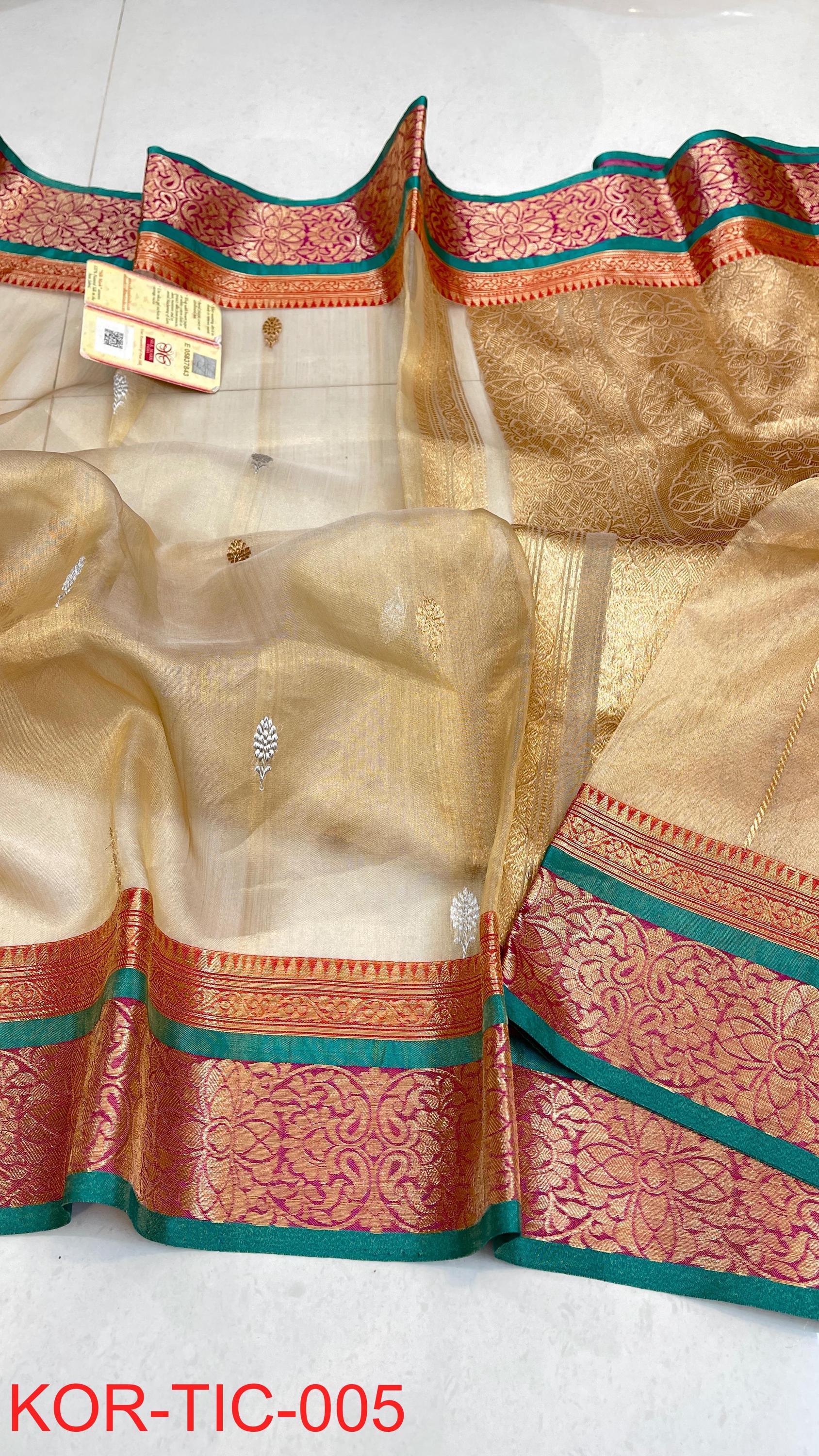 * Fabric: 100% Pure Kora Organza/Tissue Silk (Silk Mark Certified) offering a sheer, crisp, and luminous drape