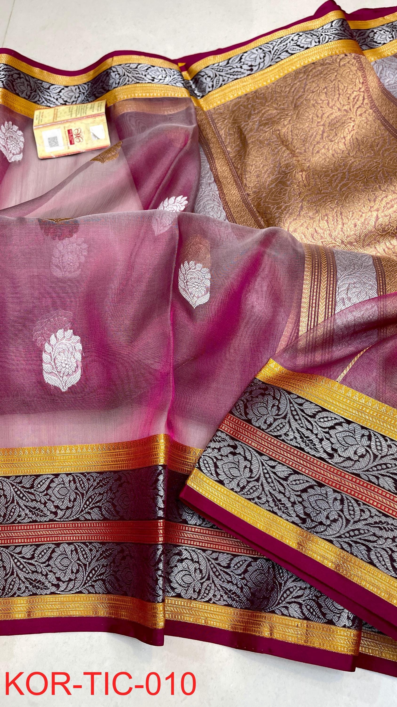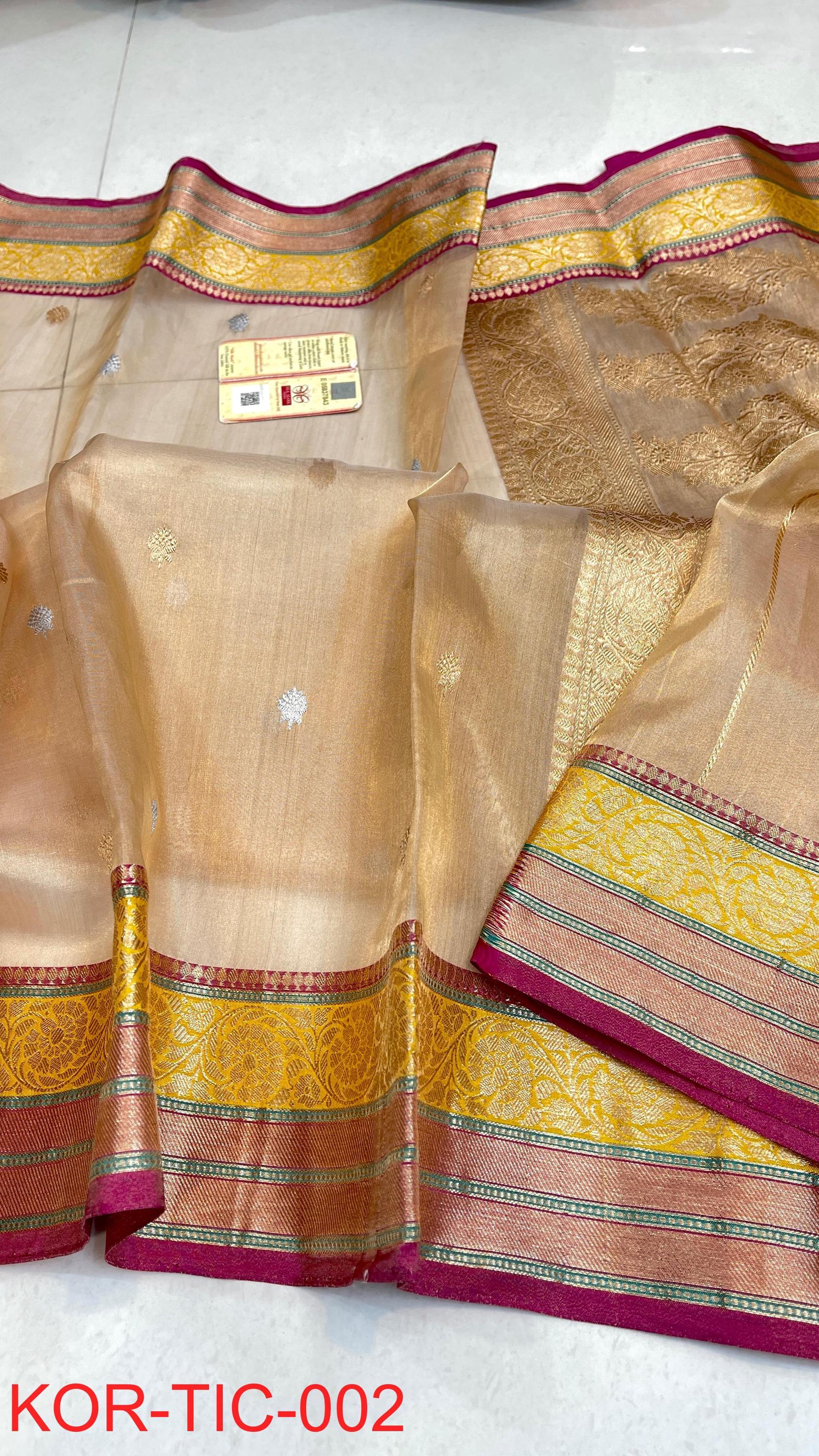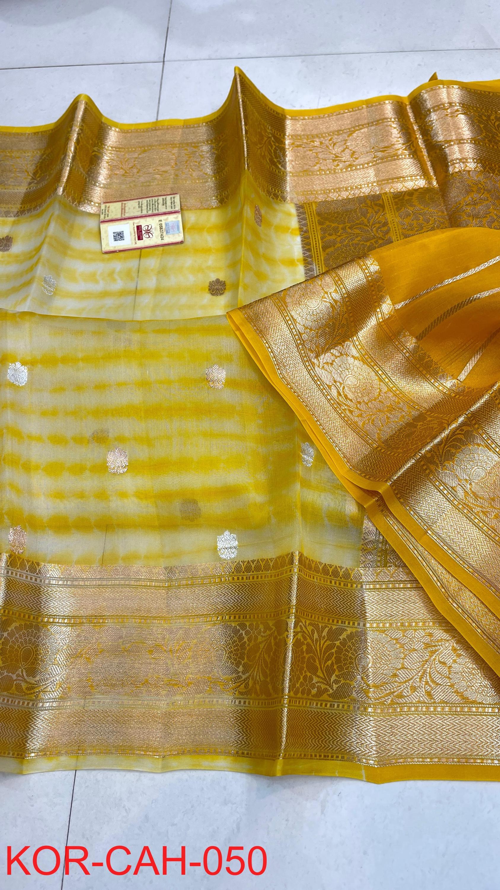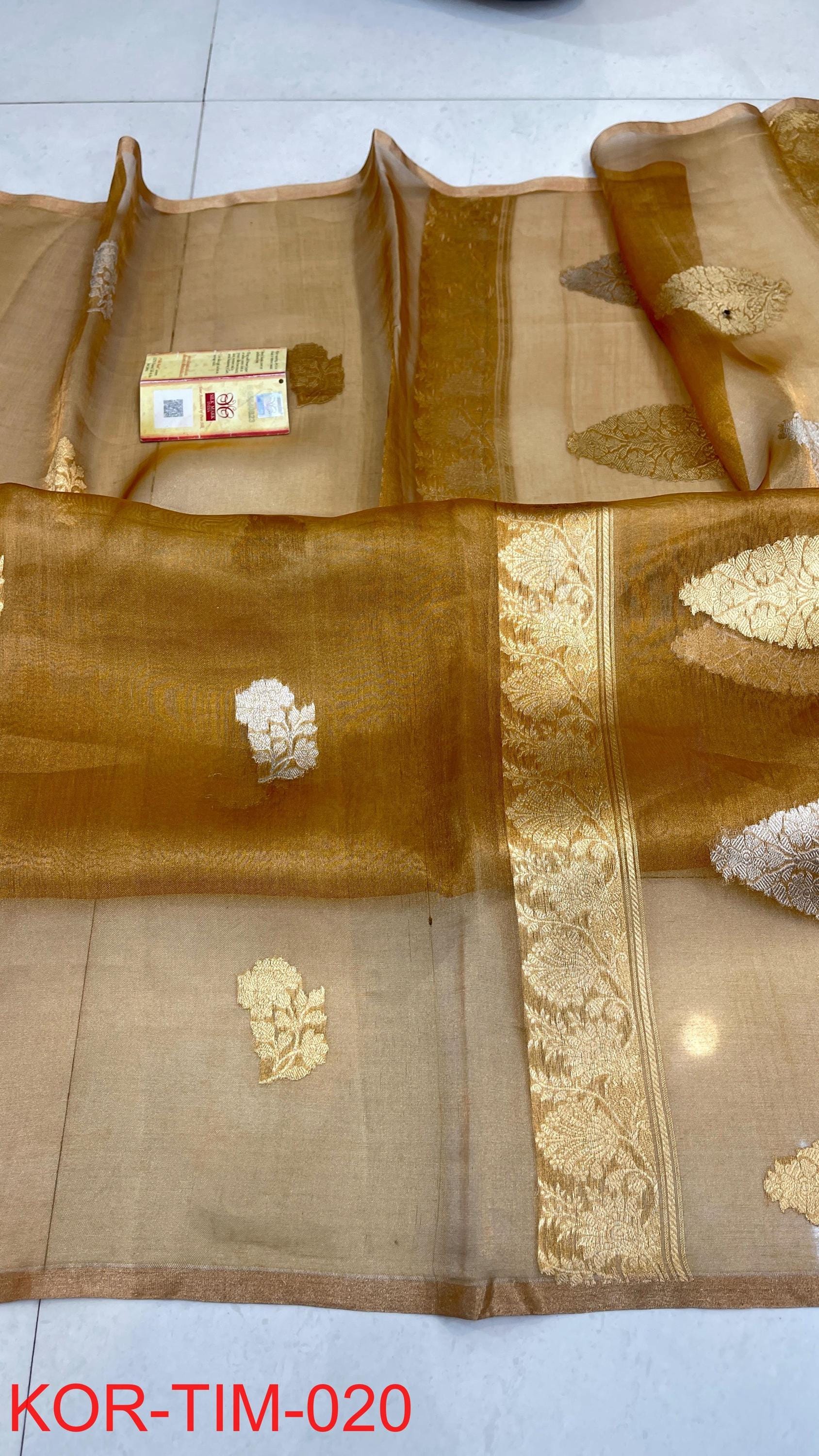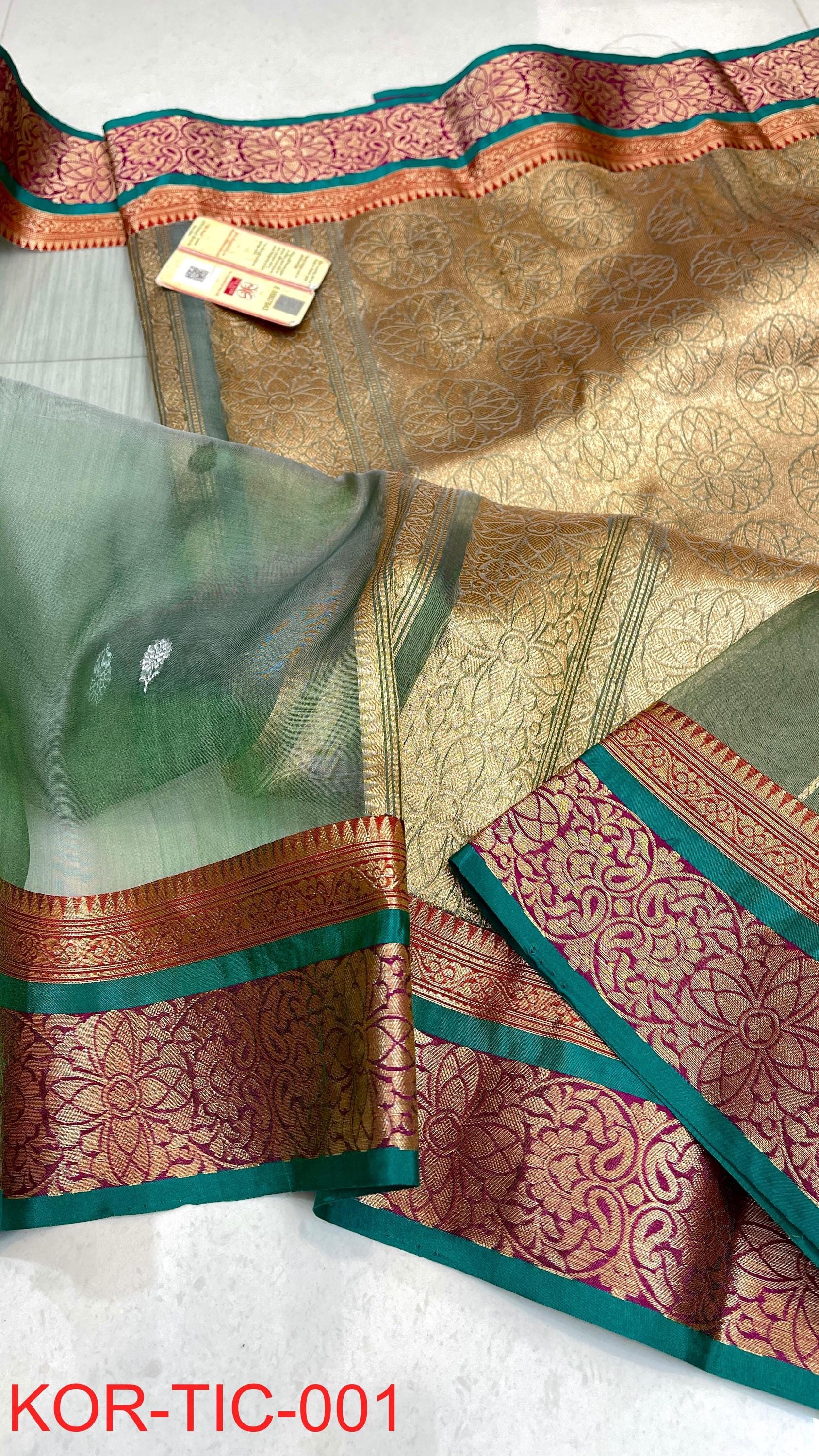 * Fabric: 100% Pure Kora Organza/Tissue Silk (Silk Mark Certified) offering a sheer, crisp, and luminous drape