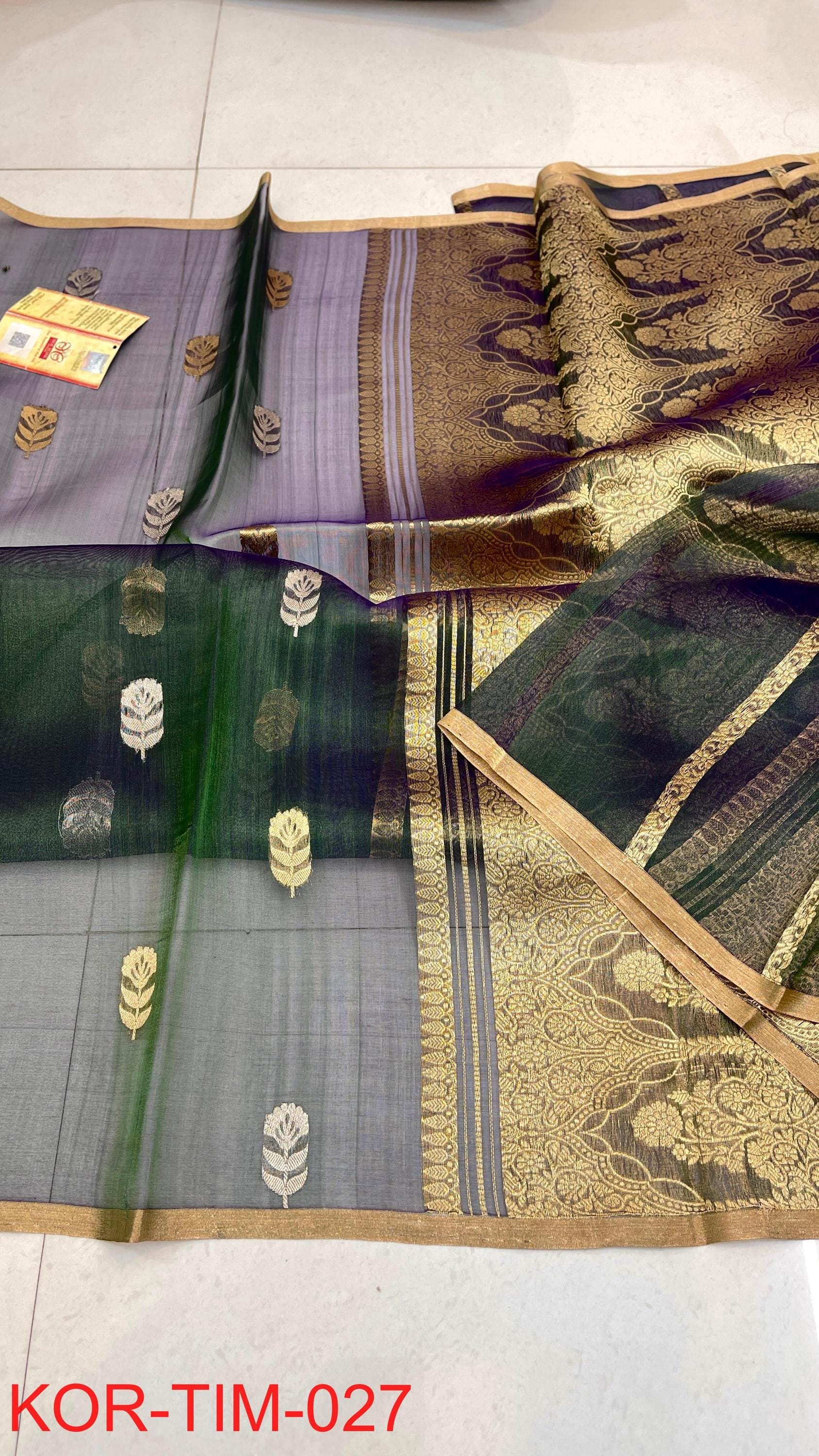 There is a beautiful soul to carefully curated handloom textiles that instantly connects you to the artisan's touch. Experience the perfect blend of traditional handloom weaving and contemporary elegance with this breathtaking Pure Kora Organza Silk Saree. An authentic, Silk Mark Certified masterpiece, this sheer, luminous drape features a mesmerizing dual-tone ombre effect, shifting between deep slate grey, plum, and rich forest green. The body is delicately adorned with striking woven gold and silver zari leaf buttis. The true grandeur unfolds in the heavy, intricately woven gold zari brocade pallu. Light as air yet incredibly rich, this saree is the ultimate curated statement piece for cocktail parties, evening receptions, and modern festive celebrations.