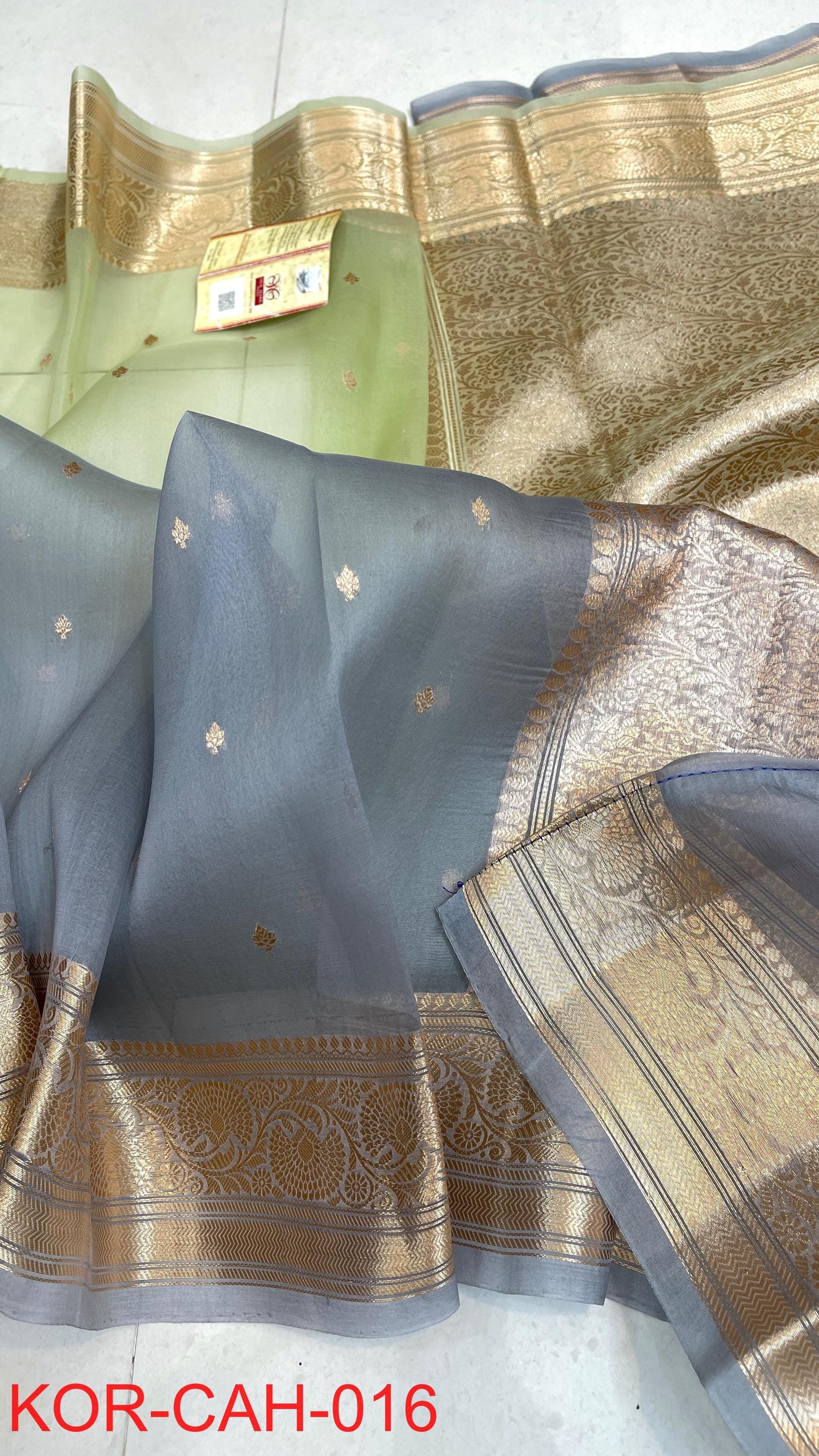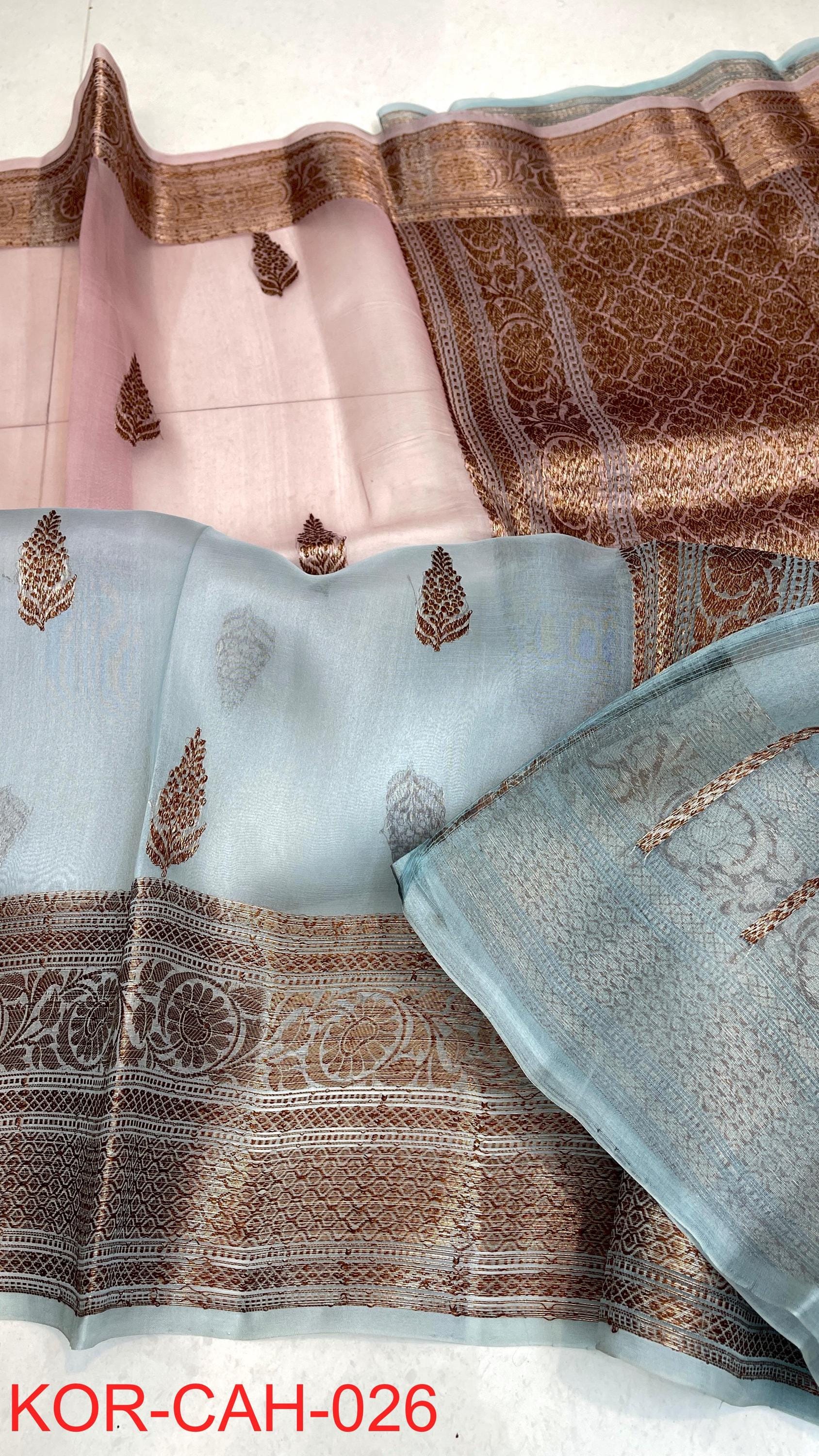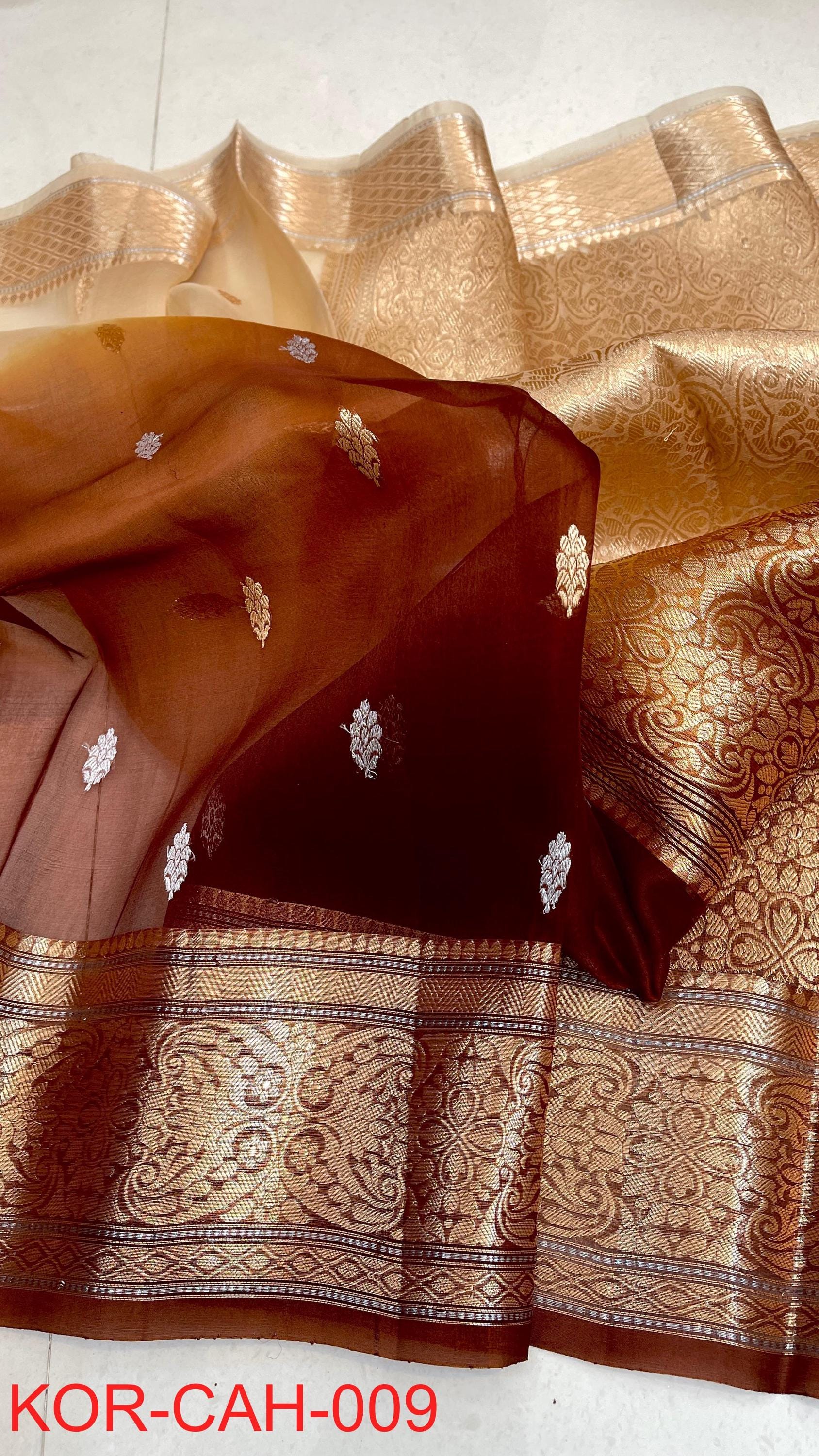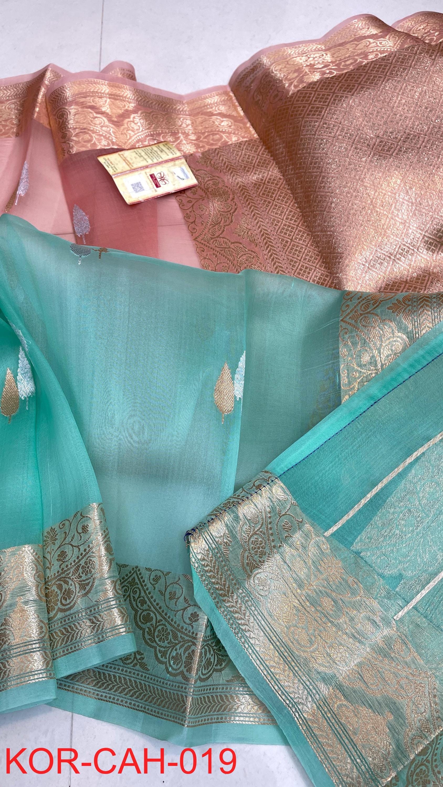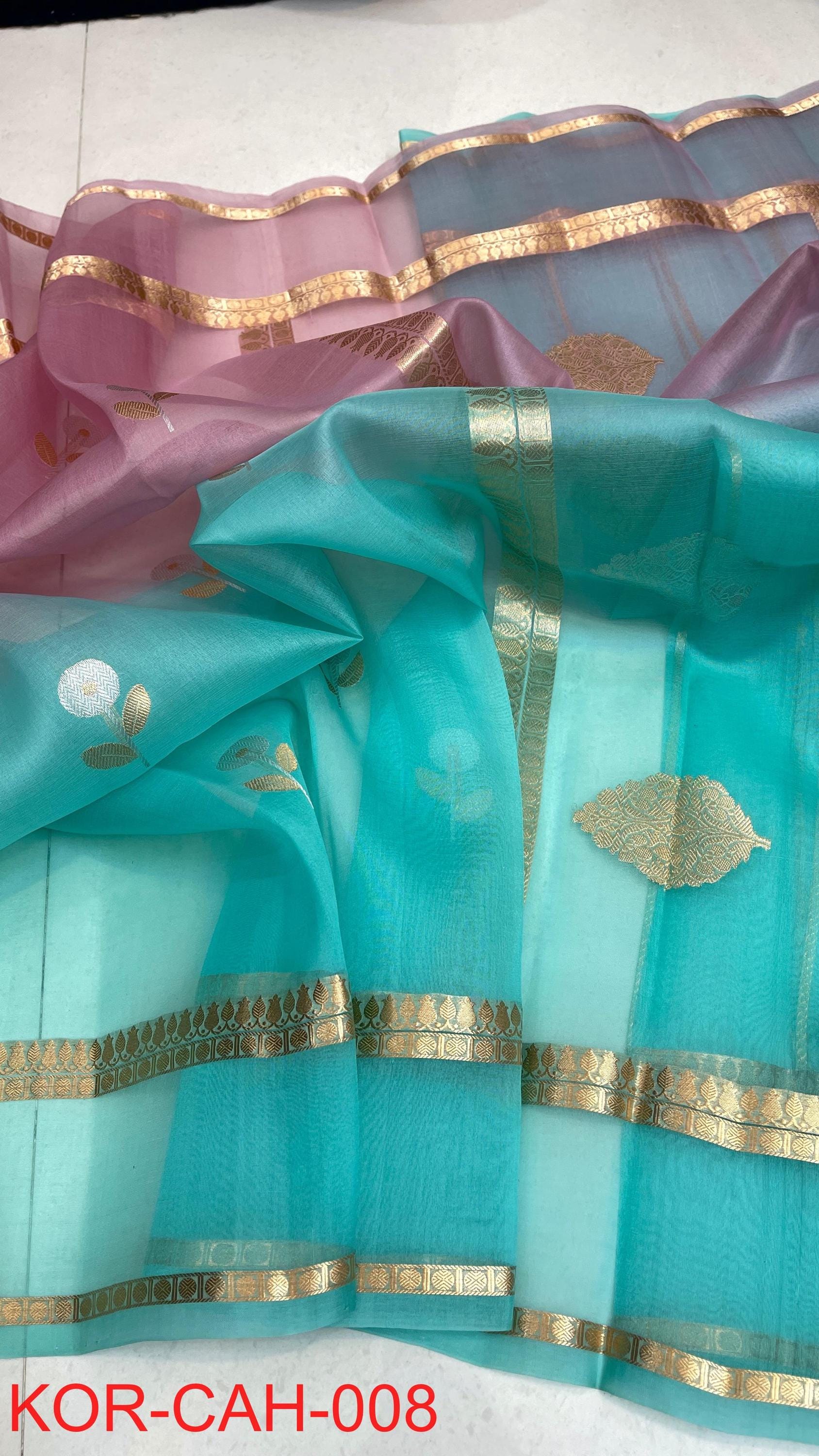* Fabric: 100% Pure Kora Organza/Tissue Silk (Silk Mark Certified) offering a sheer, crisp, and luminous drape