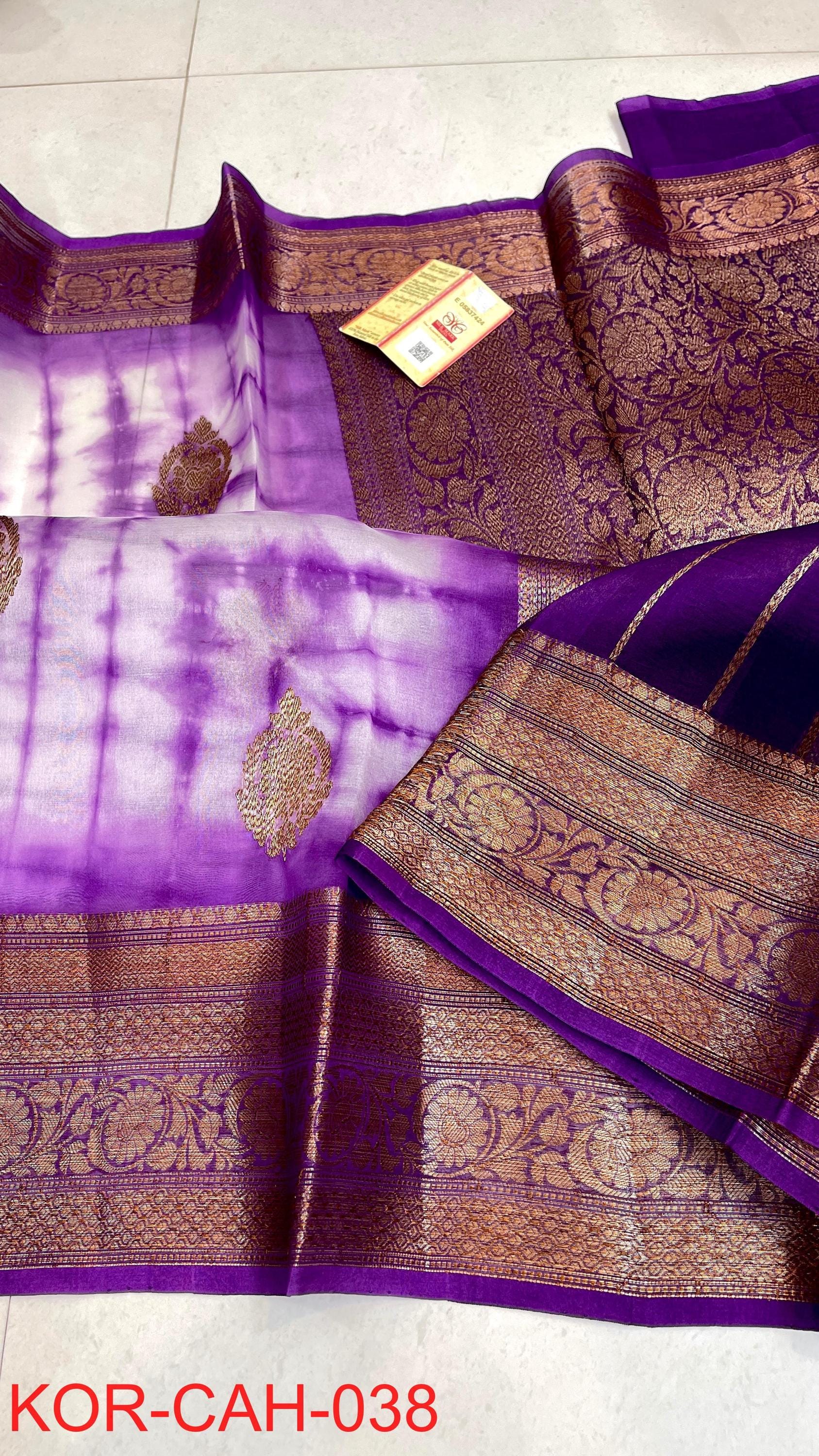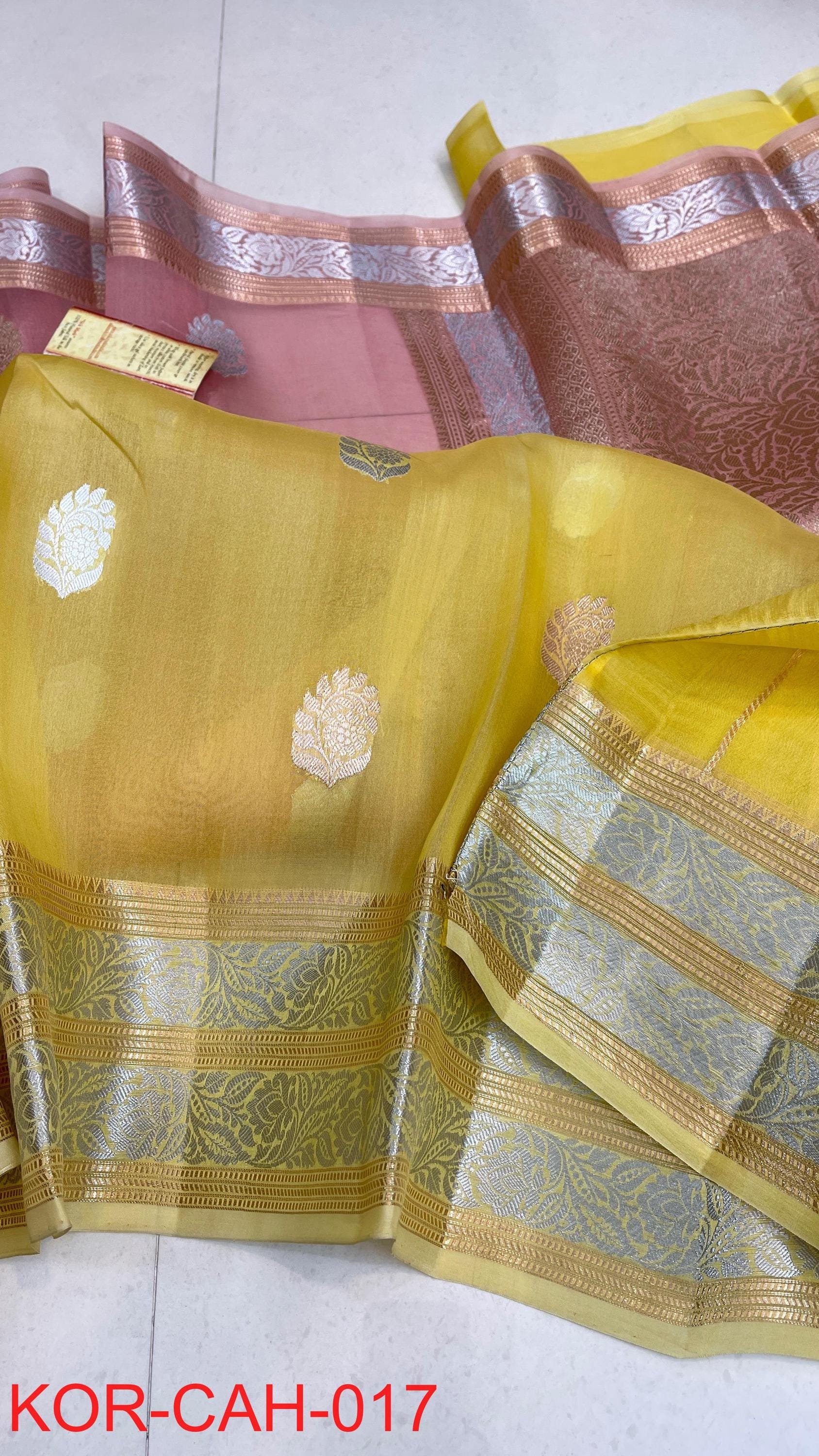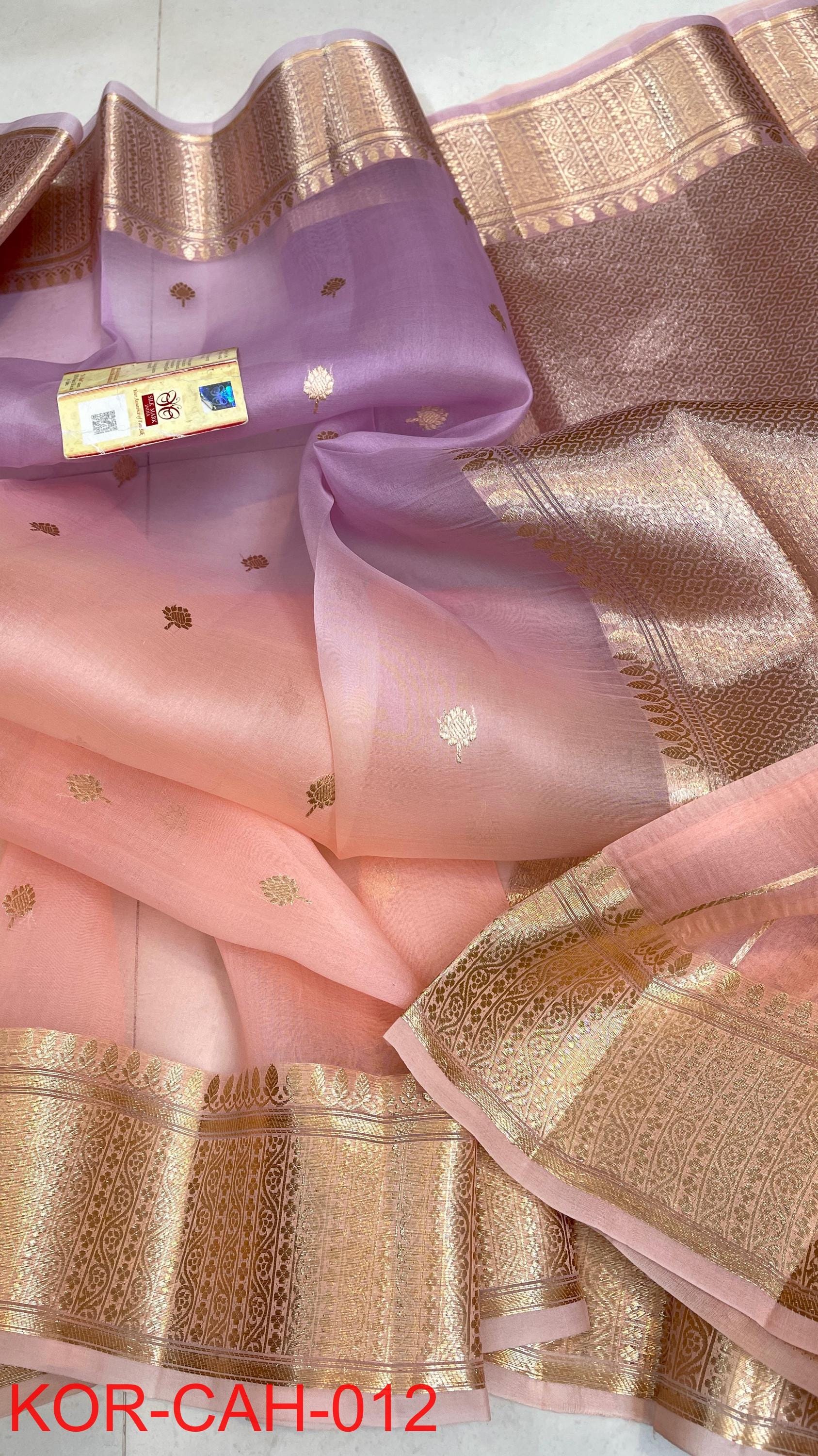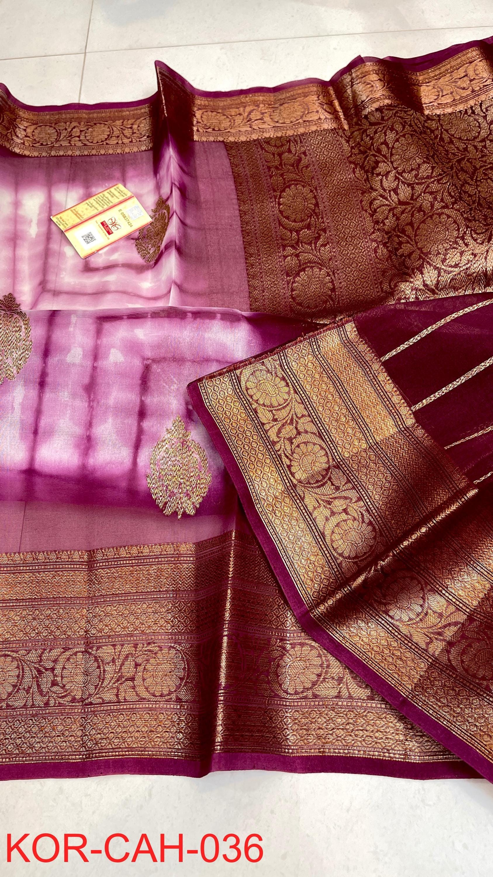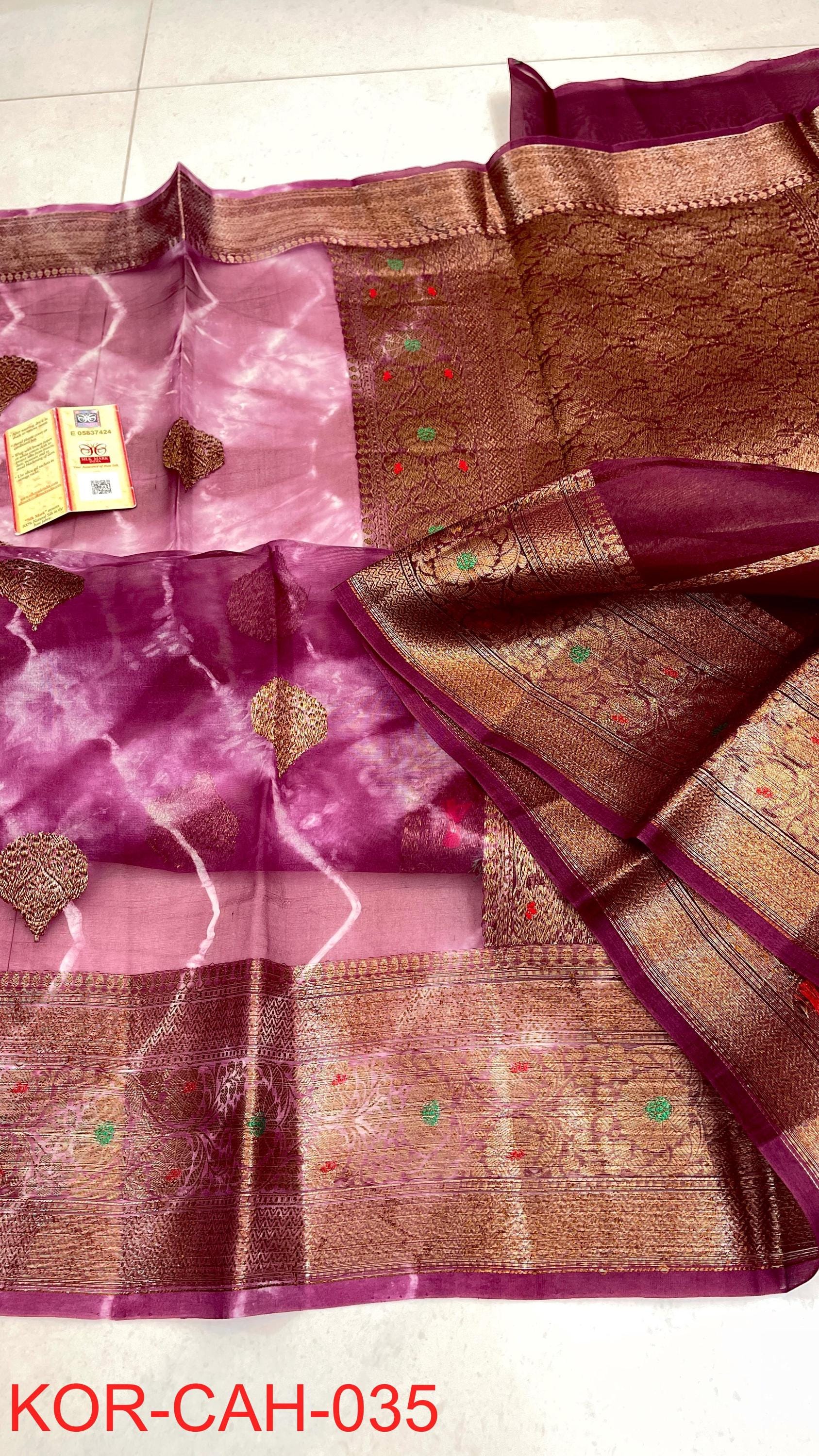 * Fabric: 100% Pure Kora Organza/Tissue Silk (Silk Mark Certified) offering a sheer, crisp, and luminous drape