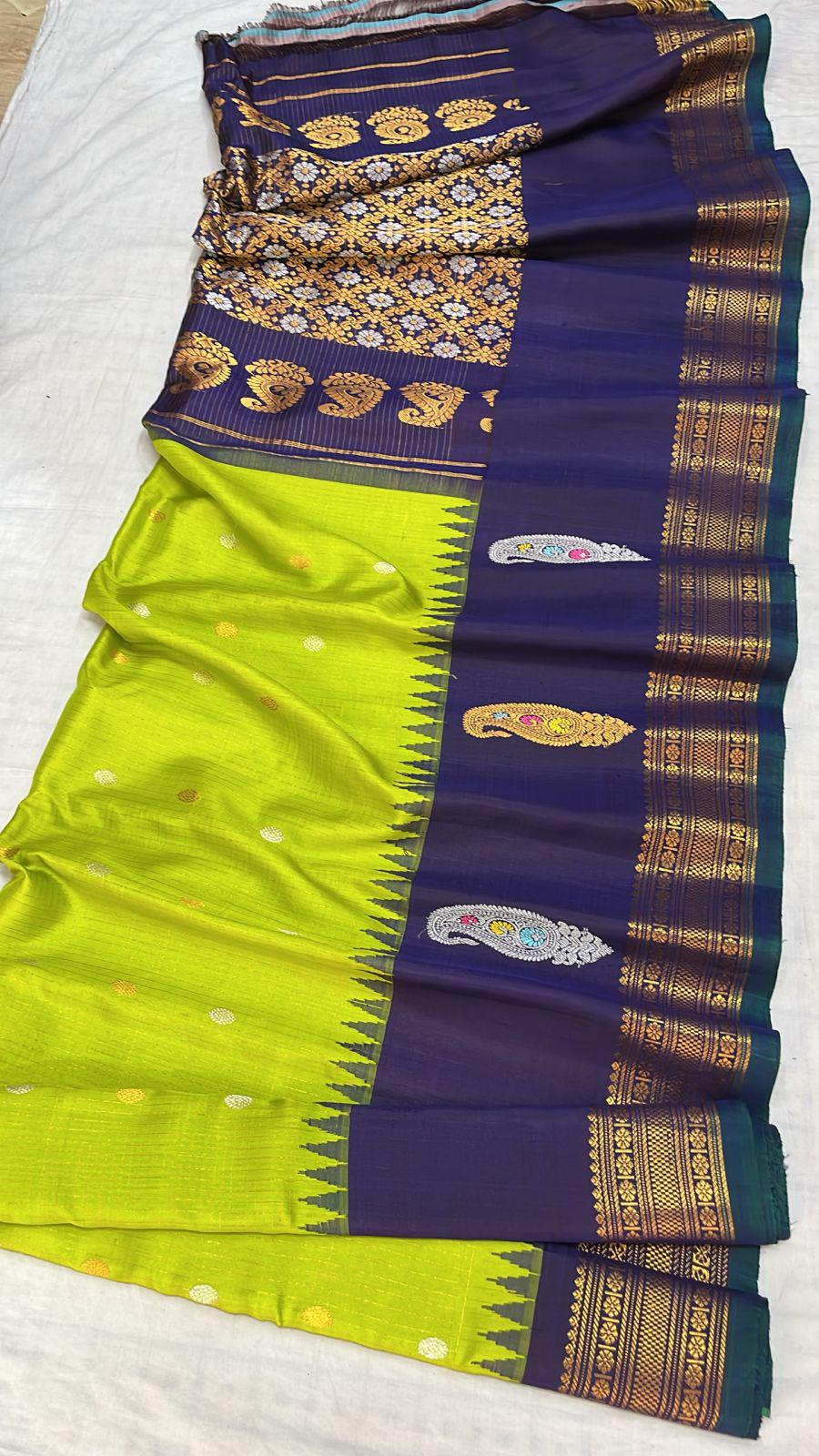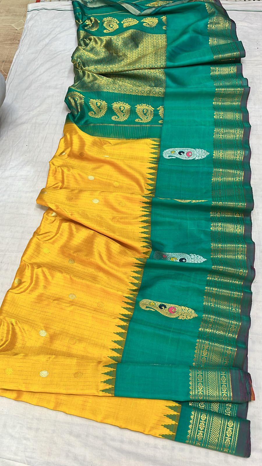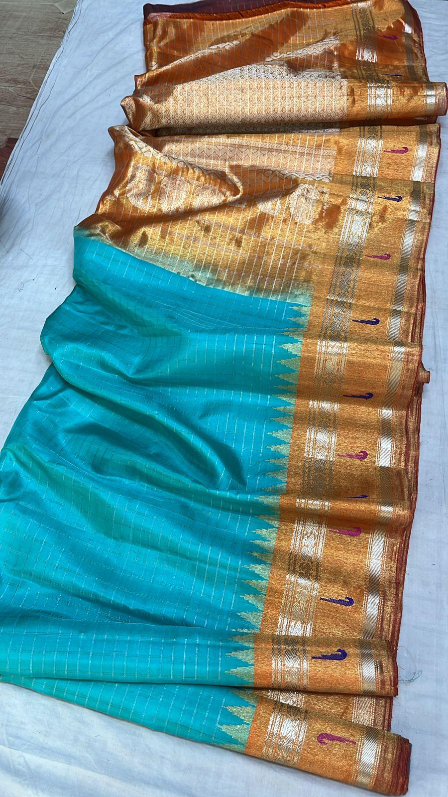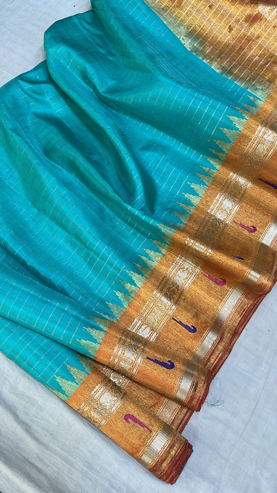 * Material: 100% Pure Handloom Gadwal Silk offering a beautifully crisp, lightweight, and regal drape
