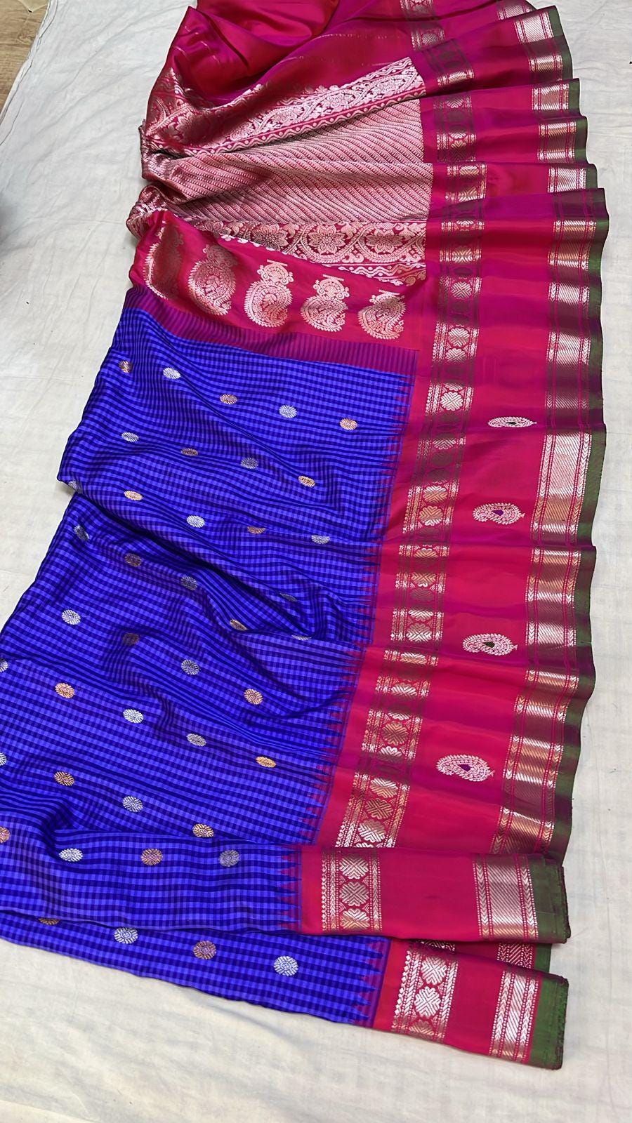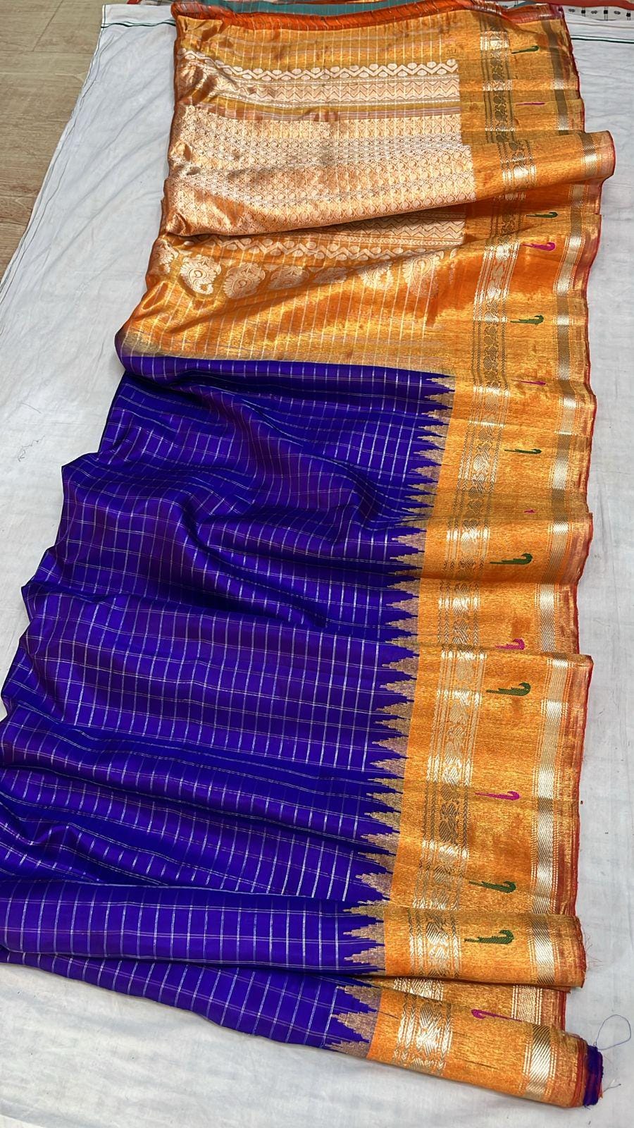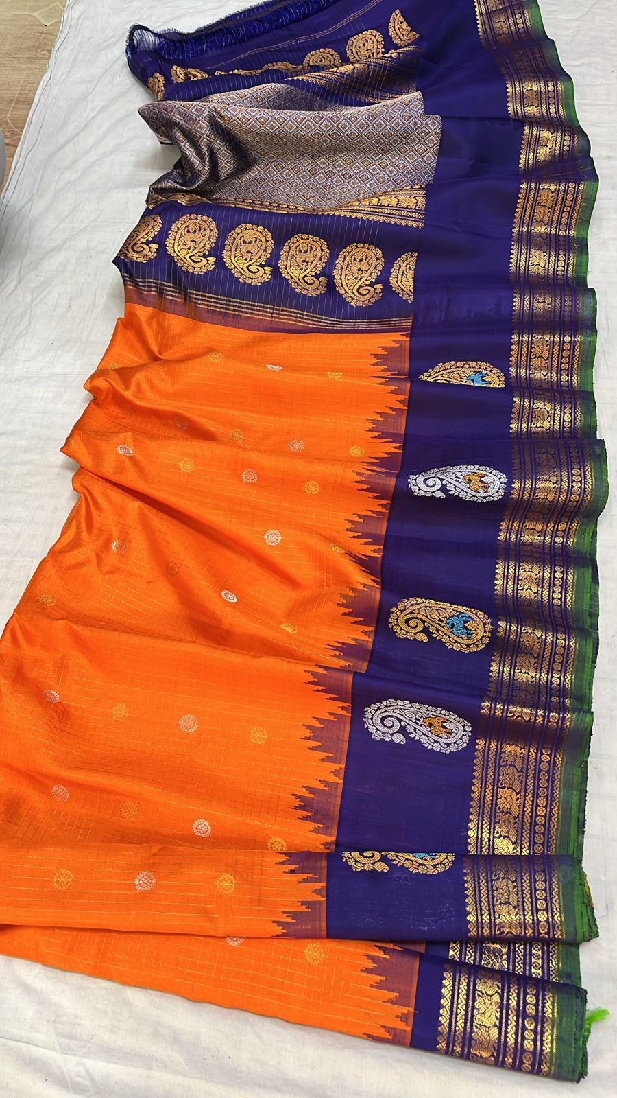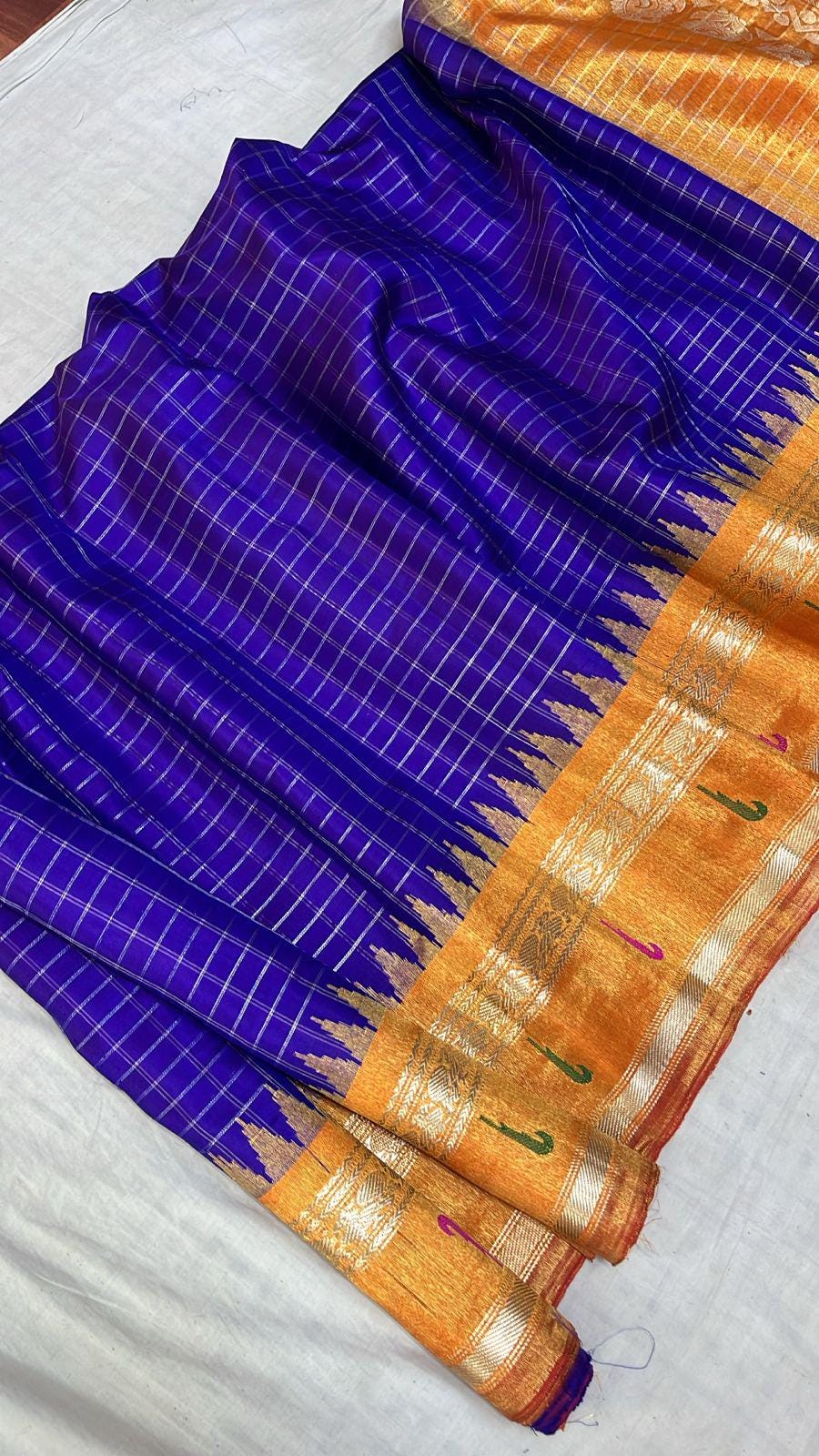 * Material: 100% Pure Handloom Gadwal Silk offering a beautifully crisp, lightweight, and regal drape