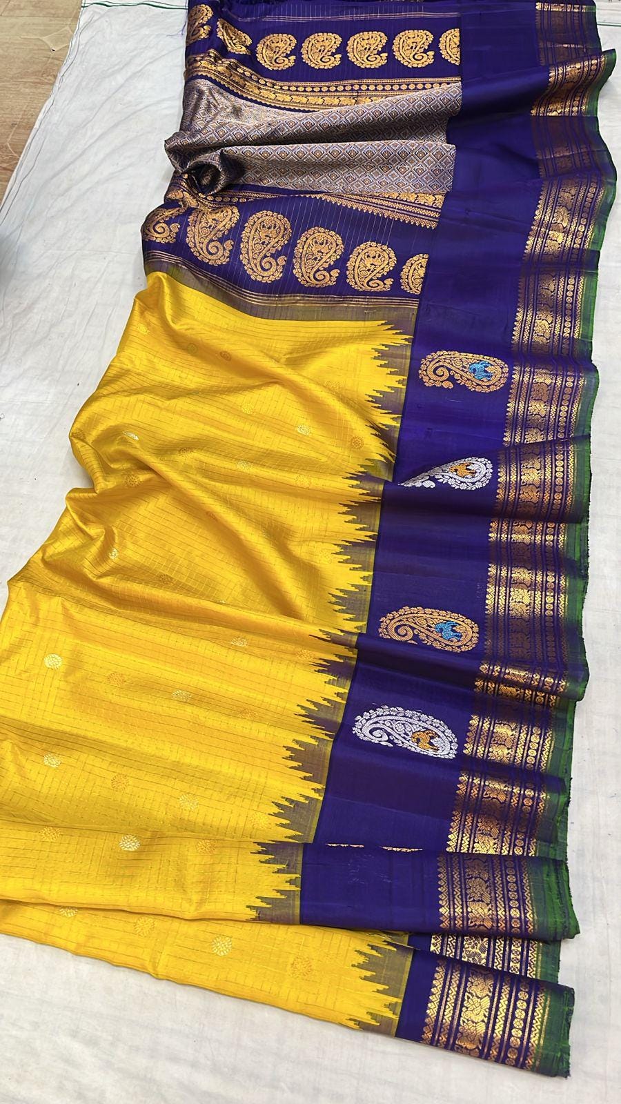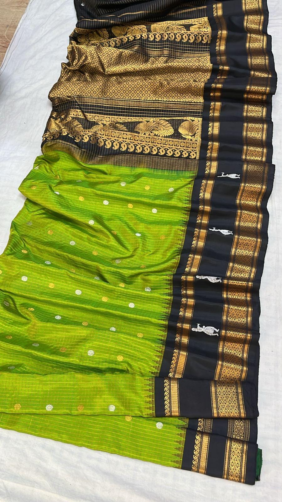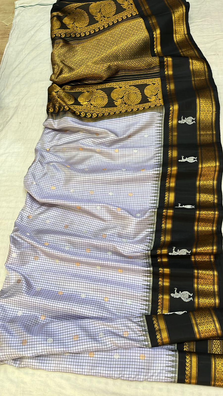 * Design: Silver-grey checkered (kattam) body with gold buttis, contrasting black temple border with traditional woven motifs