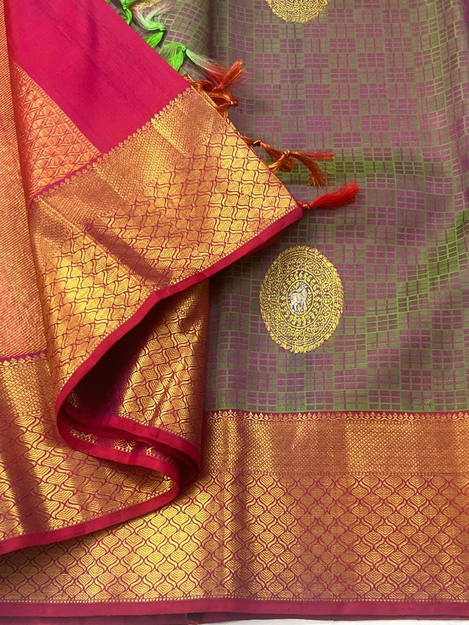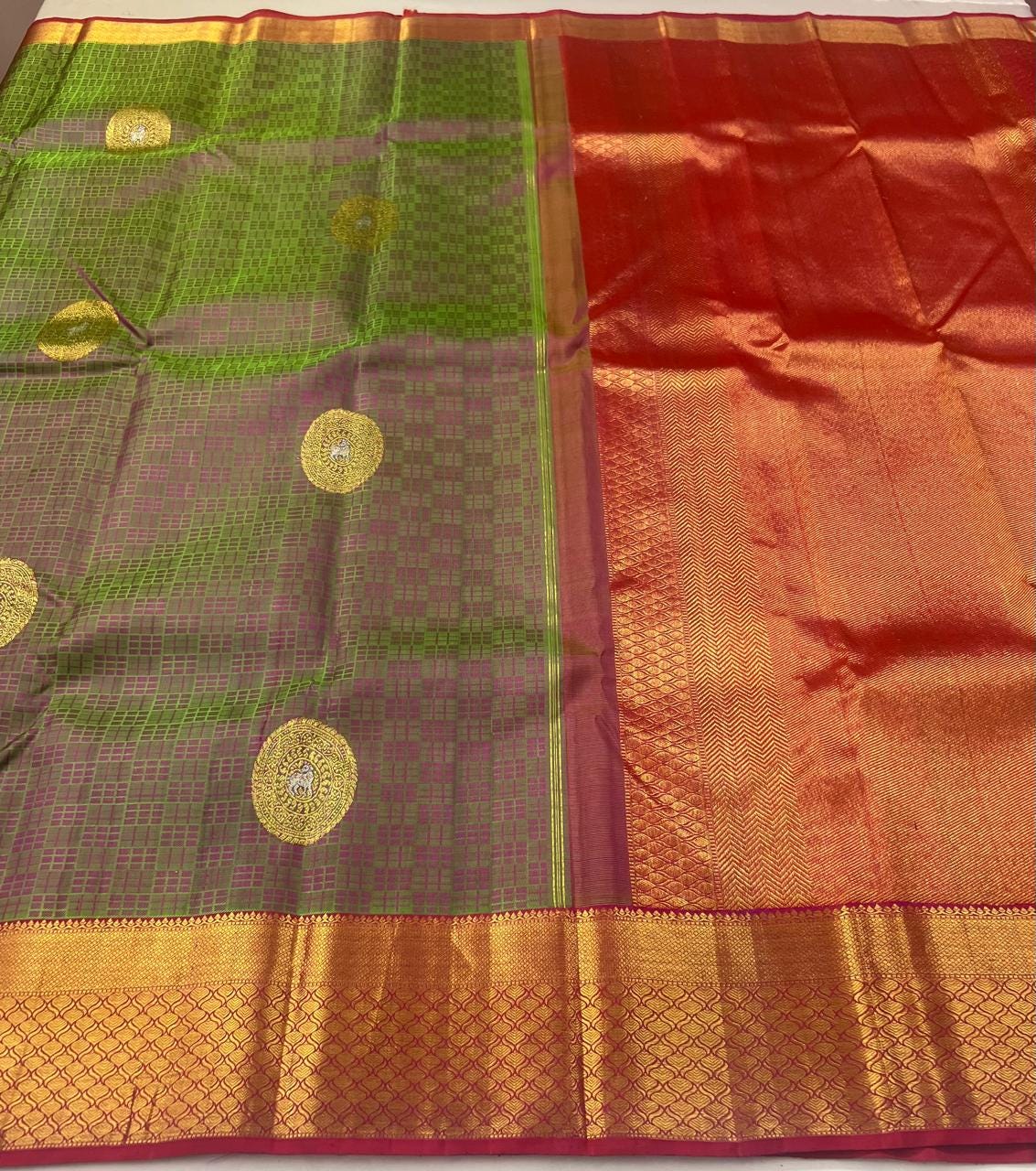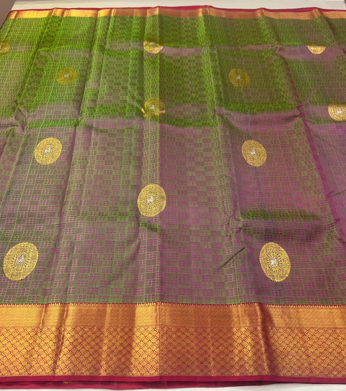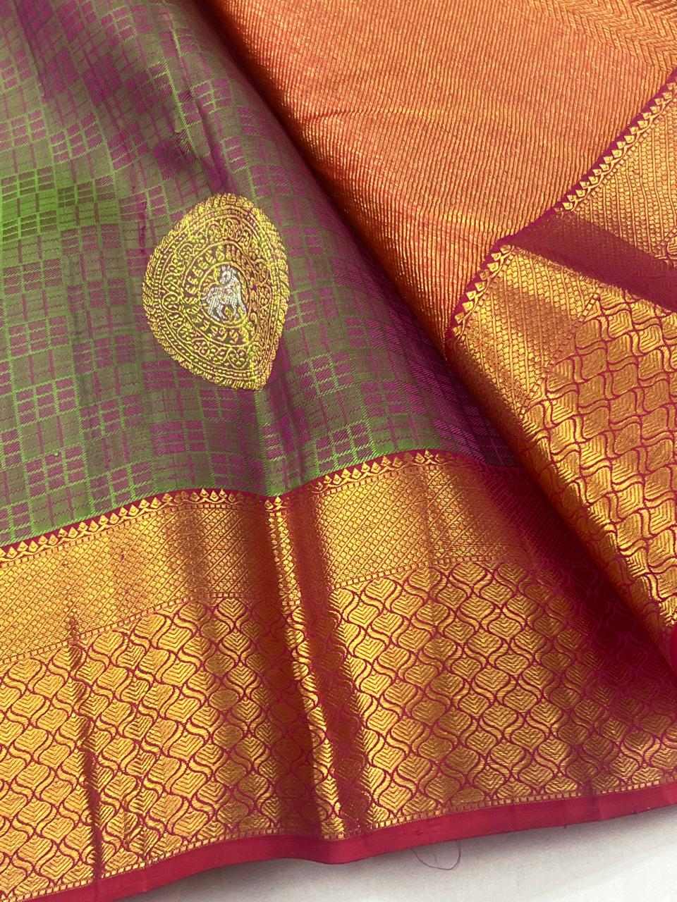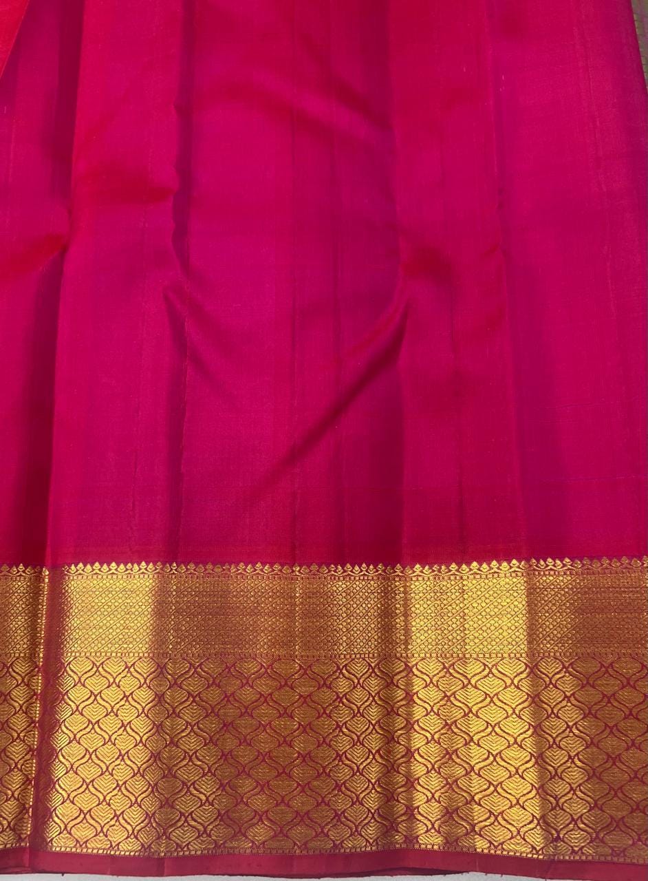 * Fabric: 100% Pure Kanchipuram/Kanjeevaram Silk offering an incredibly rich, heavy, and majestic drape